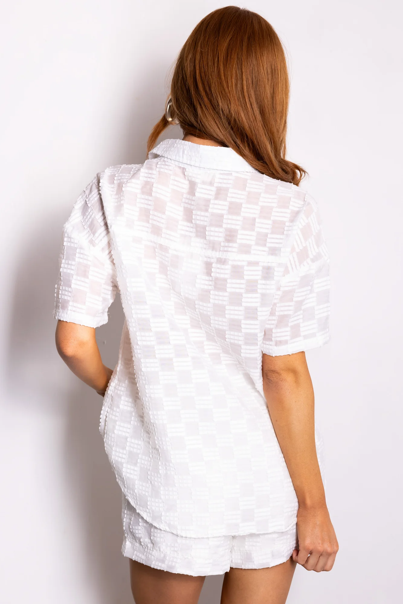 Stay stylish and comfortable with this versatile White Textured Button Up Top and Shorts Set. Crafted from non-stretchy textured woven fabric, the collared top features drop shoulders and chest pockets, while the matching high-waisted shorts boast an elastic waistband for the perfect fit. The set is lined for added comfort and made of 100% Polyester, ensuring quality and durability. Ideal for casual or daytime wear, this imported set is a must-have addition to your wardrobe. Care instructions include machine wash cold, line dry, and optional dry cleaning for best results. Available in sizes S, M, and L. Model in the photo is wearing a size Small. Models measurements: Size 1, Height 55″, Bust 31″, Waist 24″.