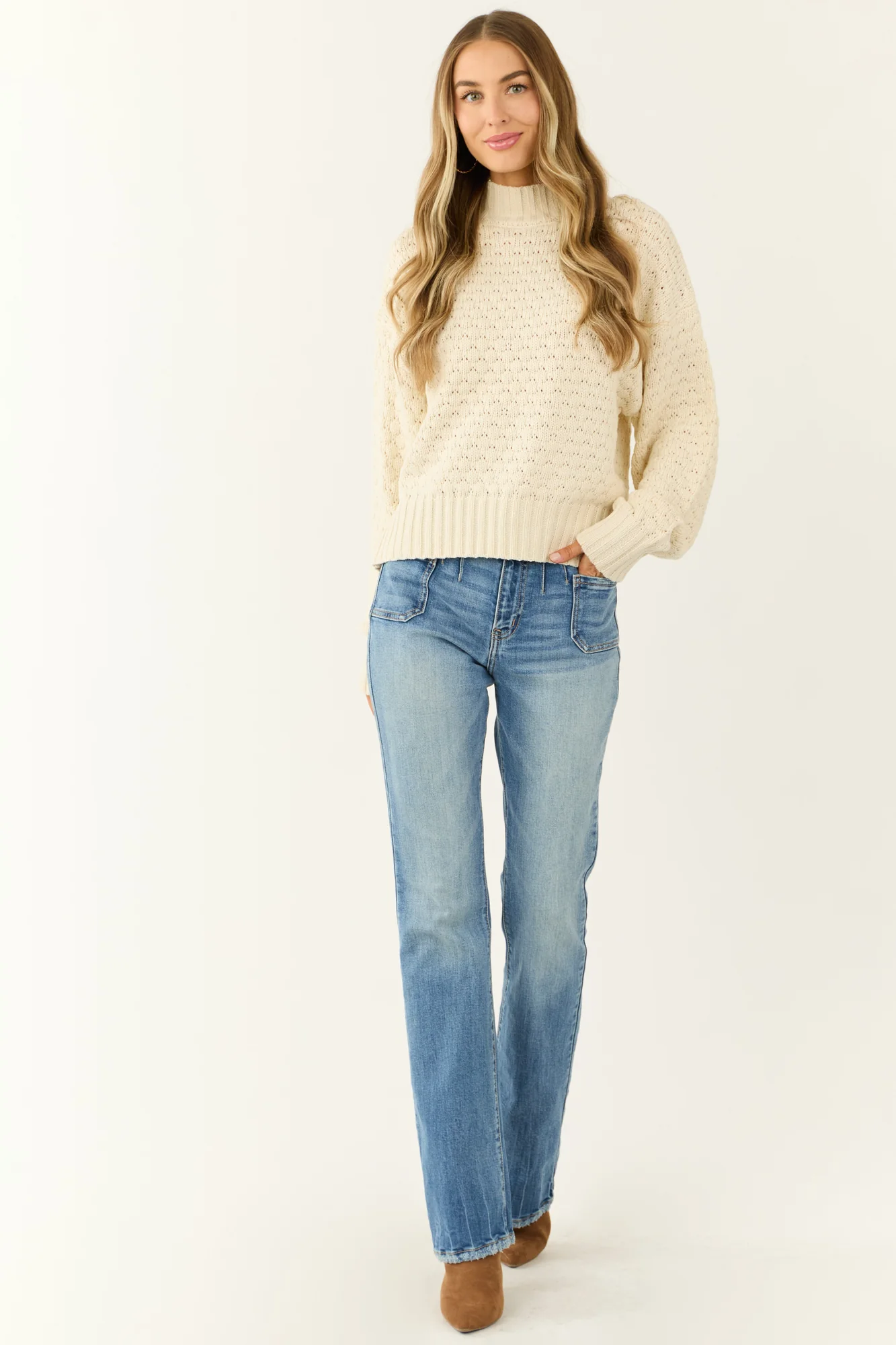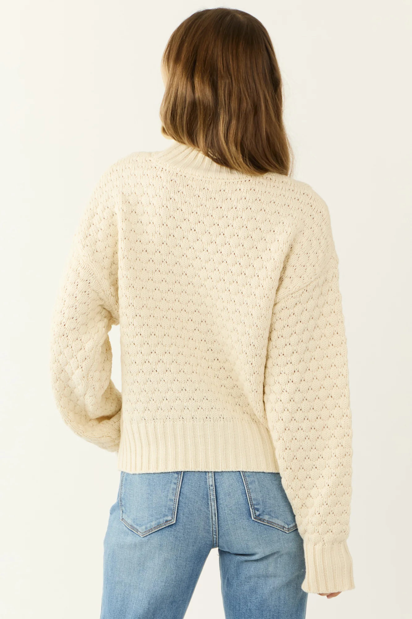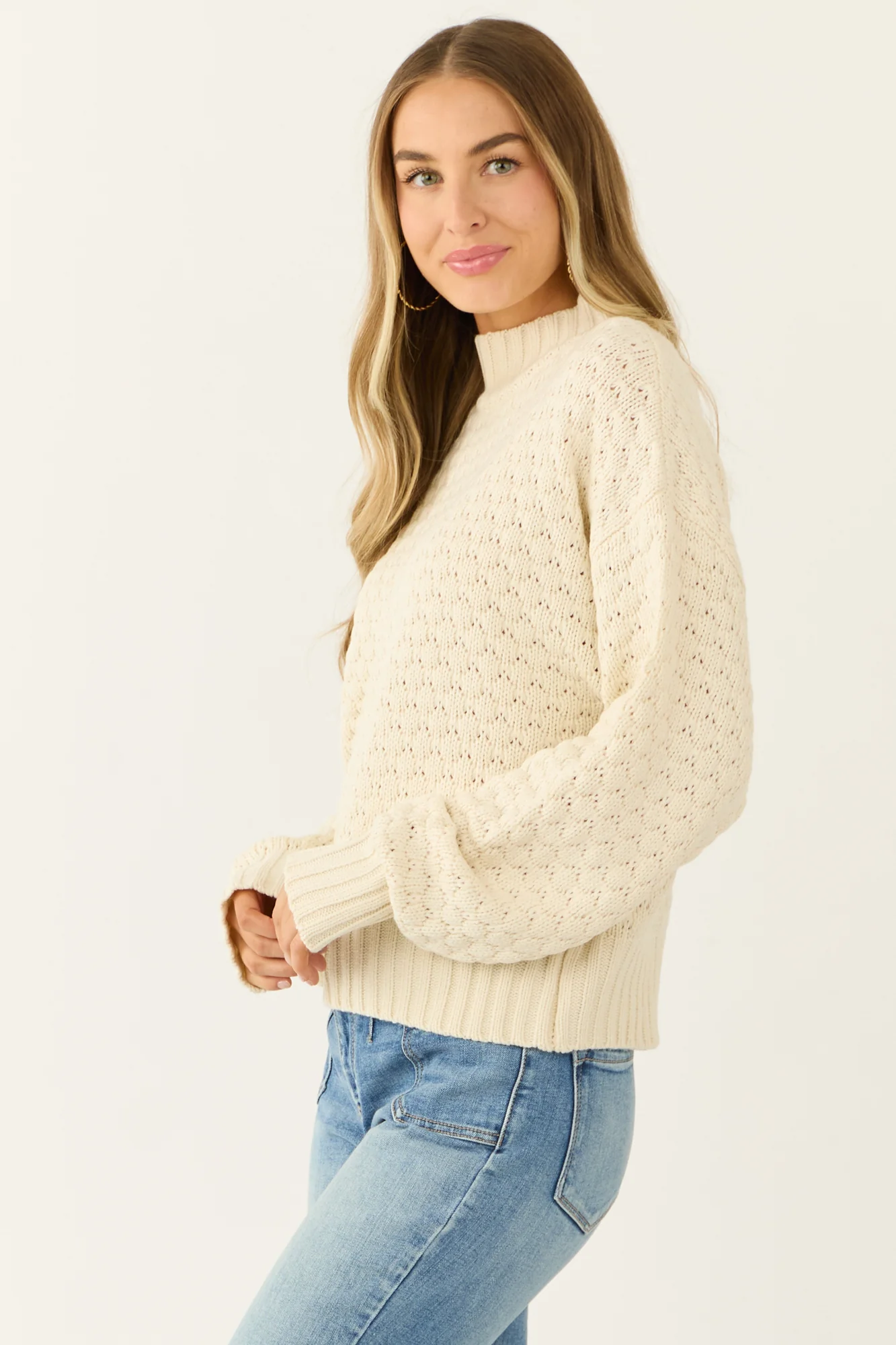 Stay cozy and stylish with our White Textured Knit High Neck Winter Sweater. Made of stretchy textured knit with a high neckline, this sweater features ribbed trim, long sleeves, and a relaxed fit. Perfect for chilly days, pair it with your favorite jeans or leggings. Hand wash cold for care. Available in sizes S, M, and L.