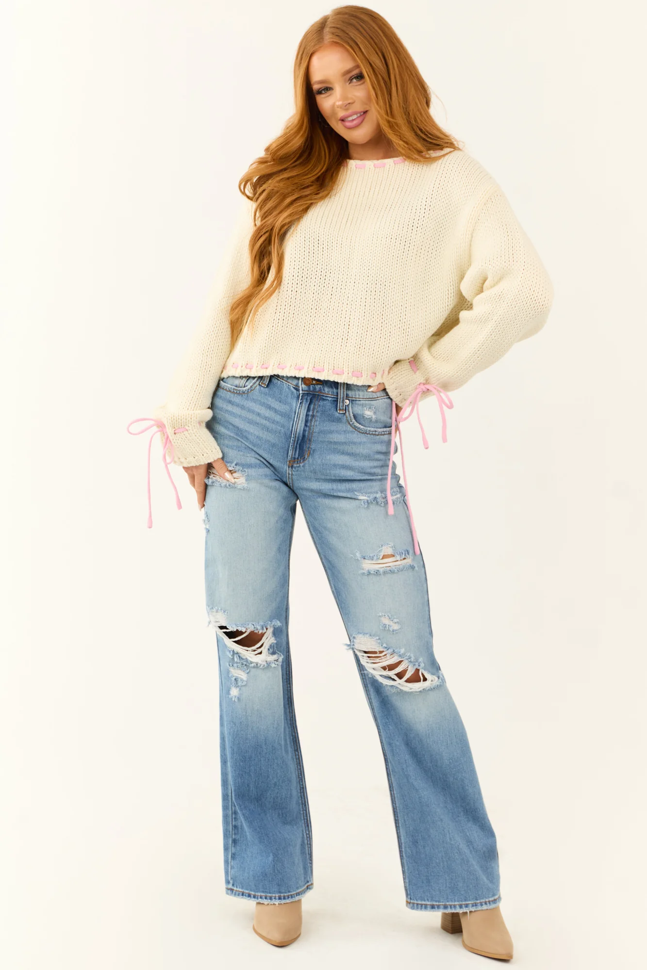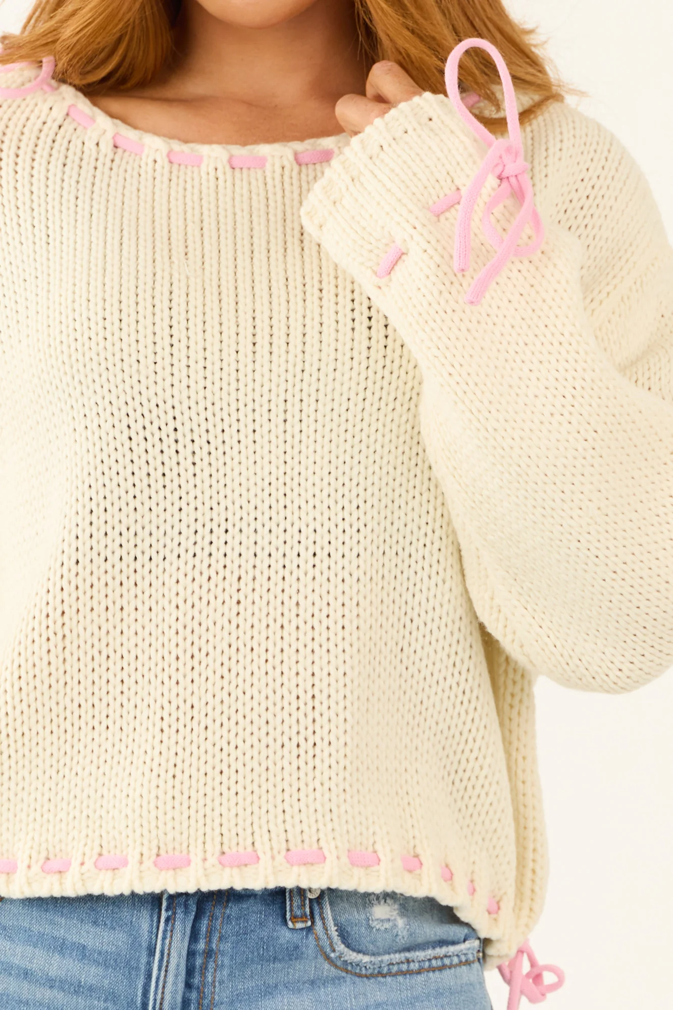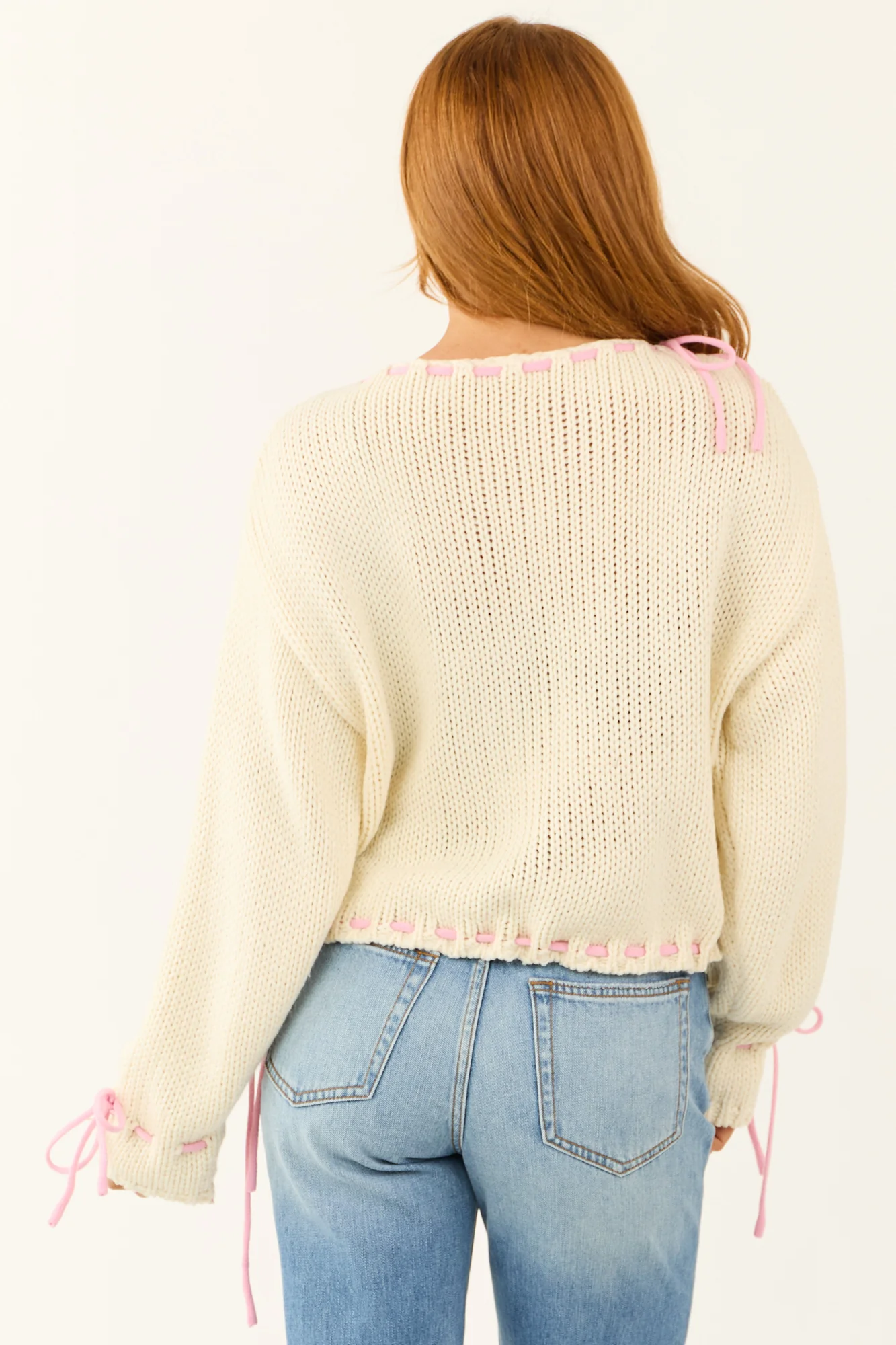 Stay cozy and stylish with this White Textured Ribbed Knit Sweater. Made of 100% Polyester, featuring carnation tie details, a slight cropped length, and adjustable cinched tie neckline, hemline, and cuffs for a fashionable look. This stretchy sweater is perfect for the winter season. Available in sizes S, M, and L. Wash with like colors; avoid soaking, bleaching, and tumble drying. Model is wearing a size Small. Model’s Profile: Size 1, Height 55″, Bust 31″, Waist 24″.