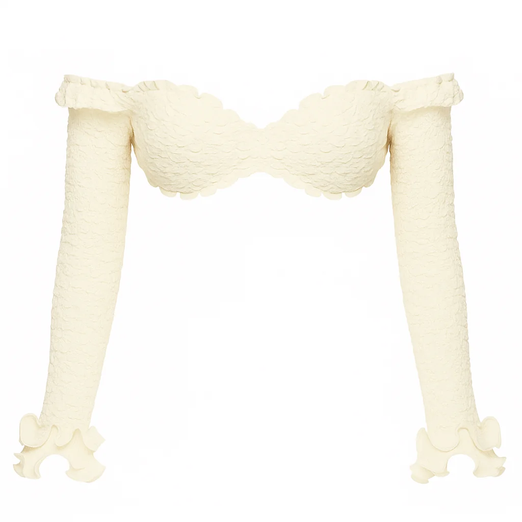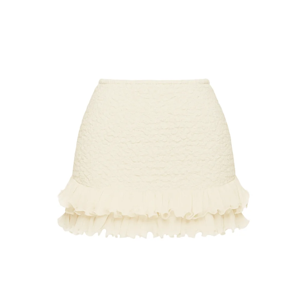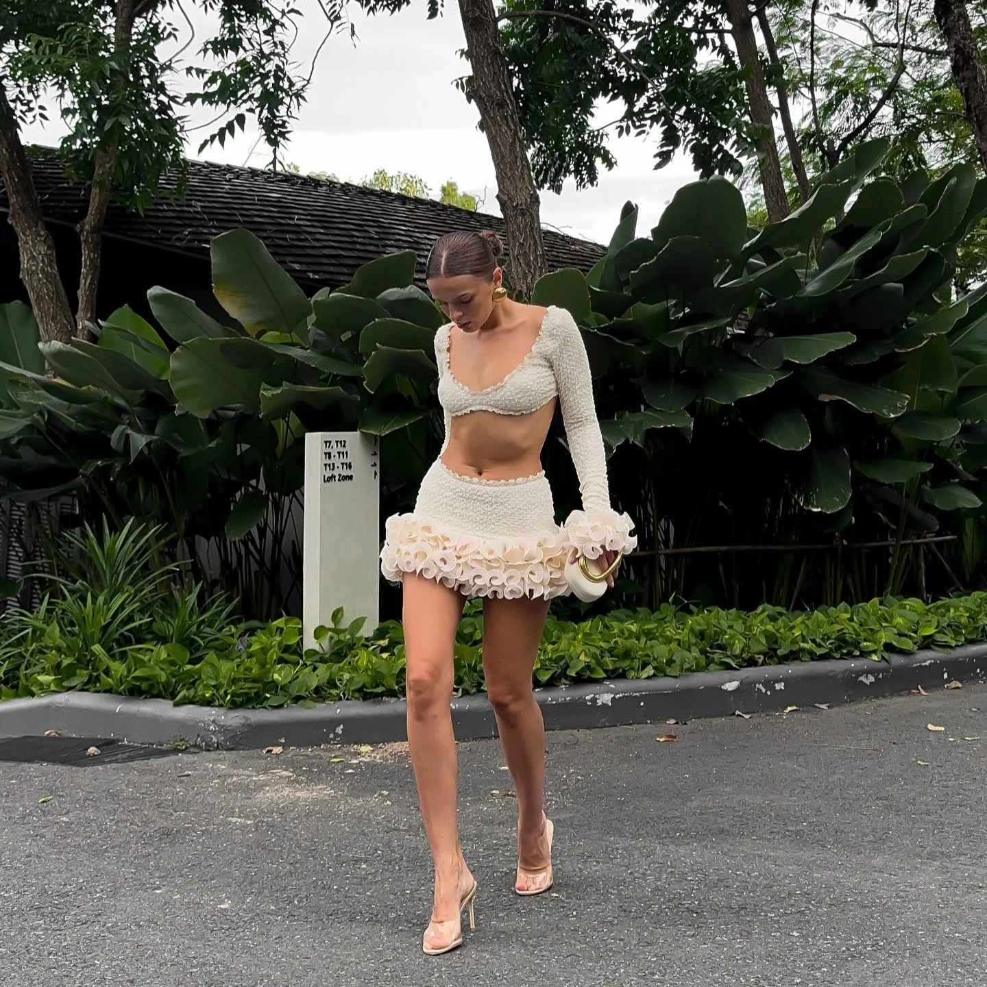 Prepare to stand out in this stunning two-piece matching set featuring a daring cropped top with sculpted long sleeves and a mini skirt adorned with cascading ruffle trims. Crafted in white textured stretch fabric for a slim fit silhouette, this co-ord set is perfect for any occasion, from nights out to elevated daywear. The soft yet bold petal-like details create an unforgettable look that moves gracefully with you. Made of Spandex, Cotton, and Organza materials. For sizing, refer to our size chart or reach out for a hassle-free exchange.