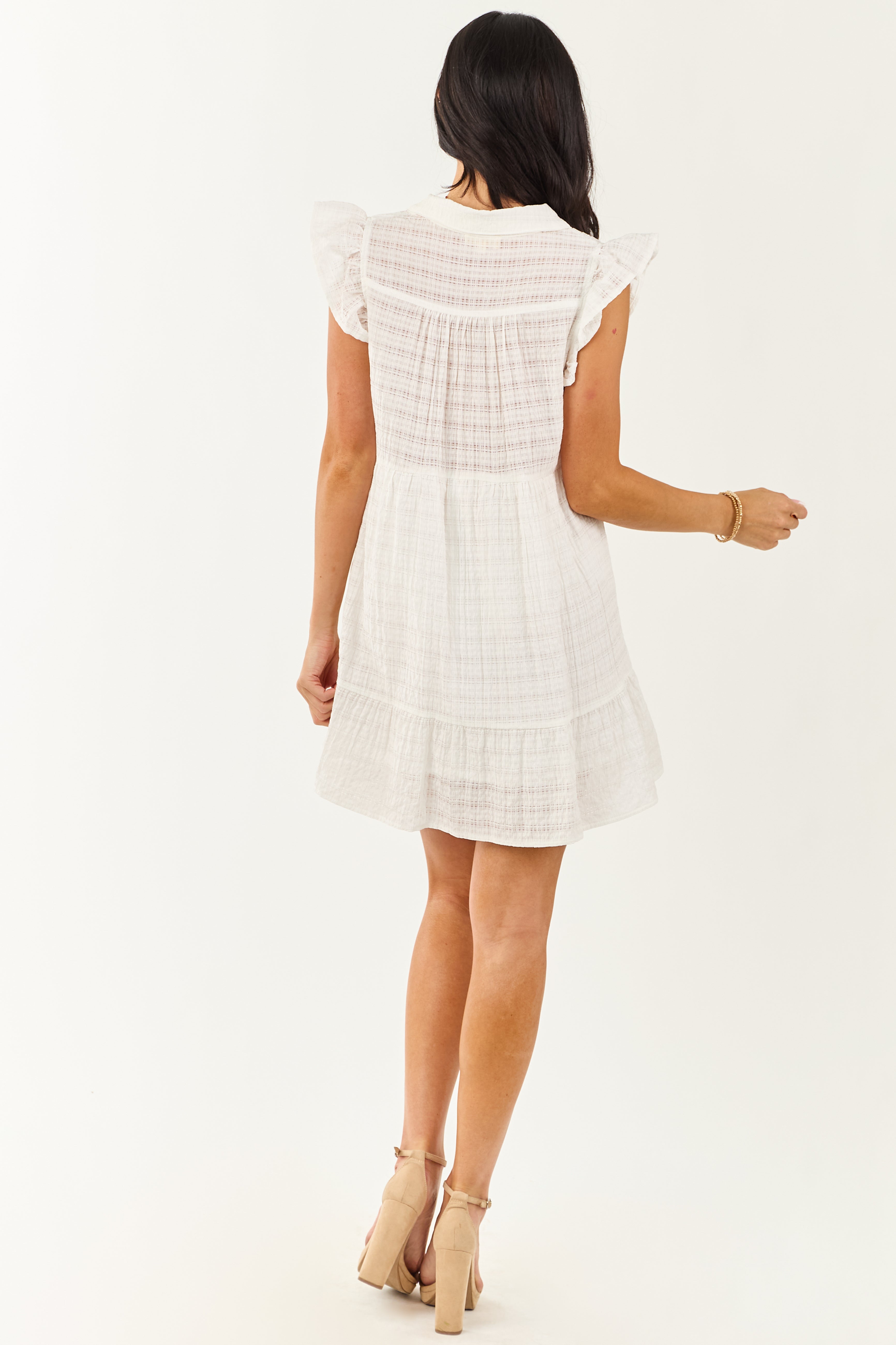 This off white mini dress features a unique texture, a comfortable fit, and versatile styling options. The sheer bodice and ruffle cap sleeves add a touch of elegance to this garment. Made of 45% Rayon, 35% Polyester, 6% Nylon, and 4% Viscose with a 100% Polyester lined skirt, this dress provides both style and comfort. Ideal for various occasions, this dress is available in sizes XS to XL. Size Small measures: Bust 40″, Length 32″.