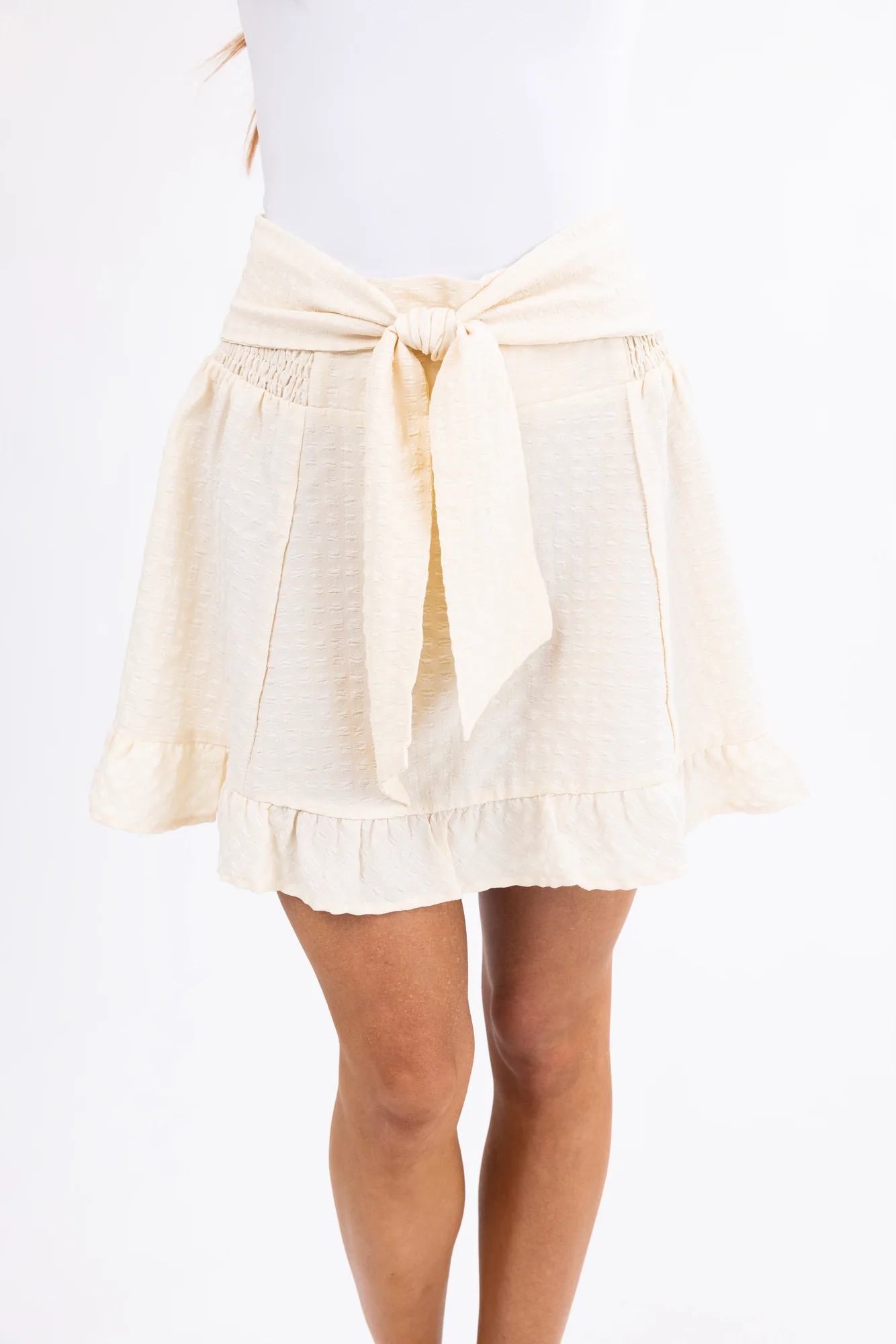 Feel effortlessly chic in this textured mini skirt with a waist tie for adjustable fit. The ruffle hem and ruched waistband add a touch of whimsy to your outfit. Made of semi-stretchy knit fabric, this skirt is perfect for any occasion. Sizes available: S, M, L. Imported. Care instructions: Hand wash cold, line dry. Model is wearing a size Small. Perfect for Spring and Summer. Unlined. Self: 50% Cotton, 50% Polyester.