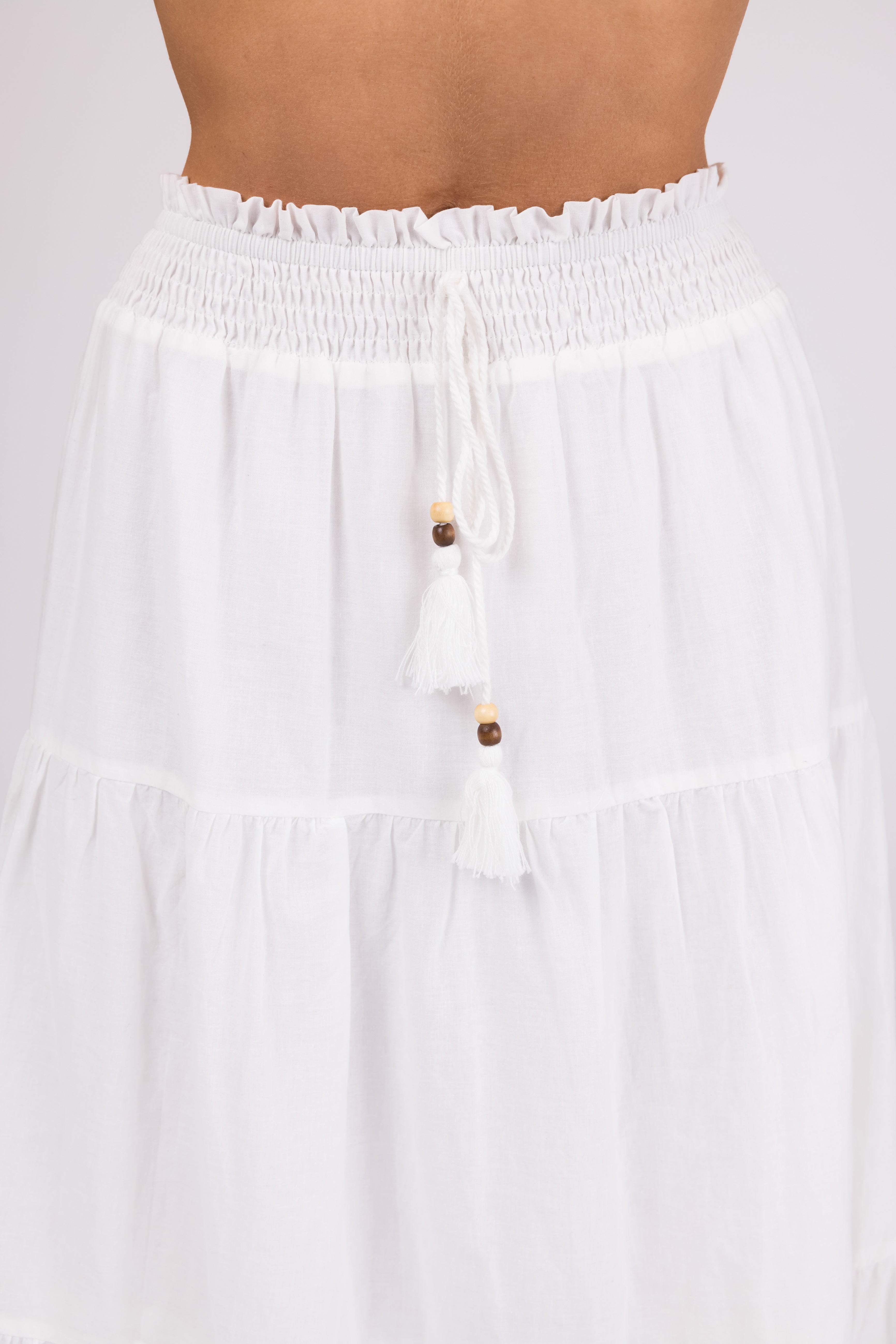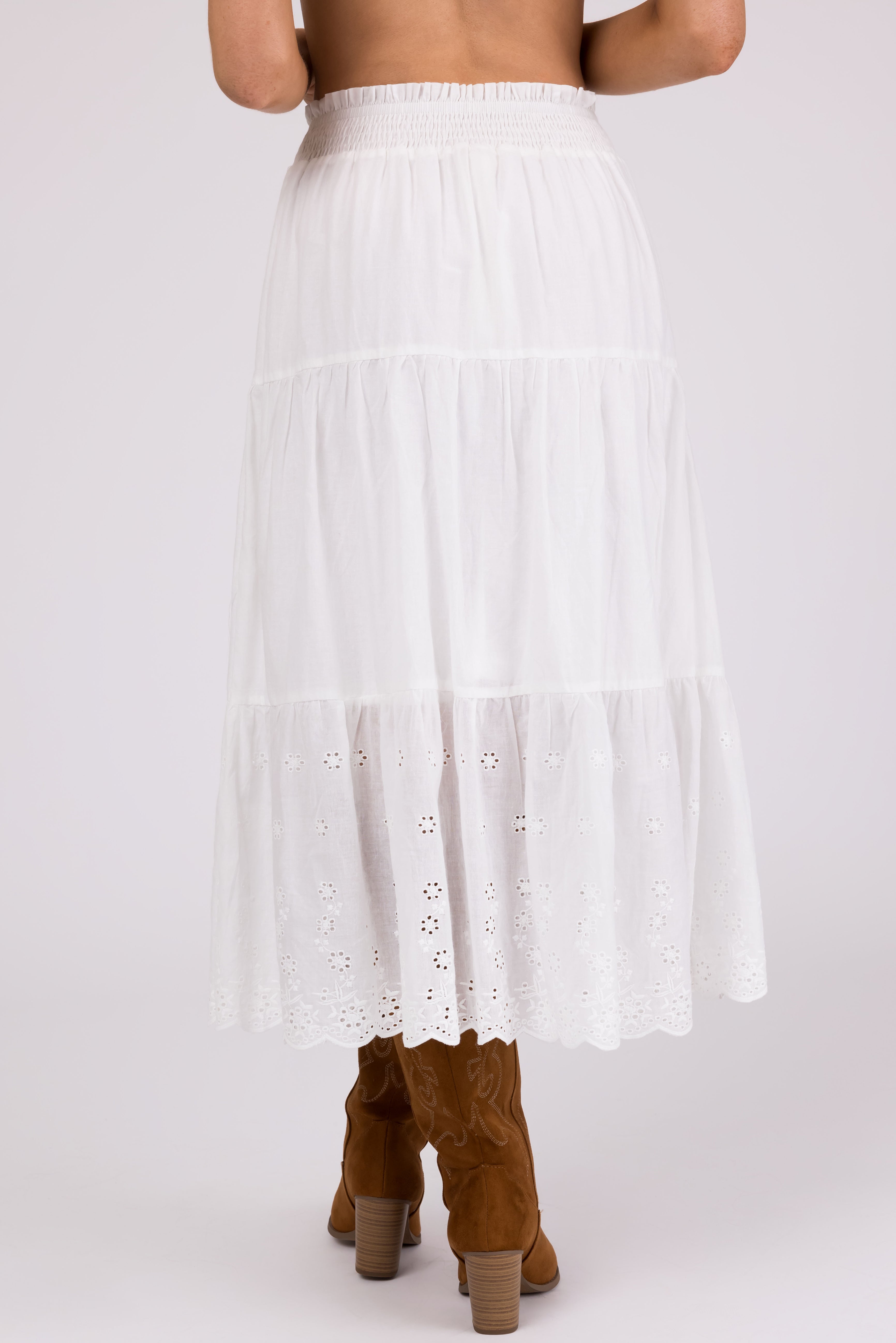 This stylish midi skirt features eyelet details and a scalloped hem, adding a charming touch to your wardrobe. Made of 100% cotton with a smocked waistband and a front tie detail, the skirt is perfect for casual and daytime wear. The lining is 100% polyester for added comfort. Available in sizes S, M, and L. Gentle wash cold, do not bleach, hang to dry, cool iron. Model is wearing a size Small, with a profile of Size 1, Height 55″, Bust 31″, Waist 24″.