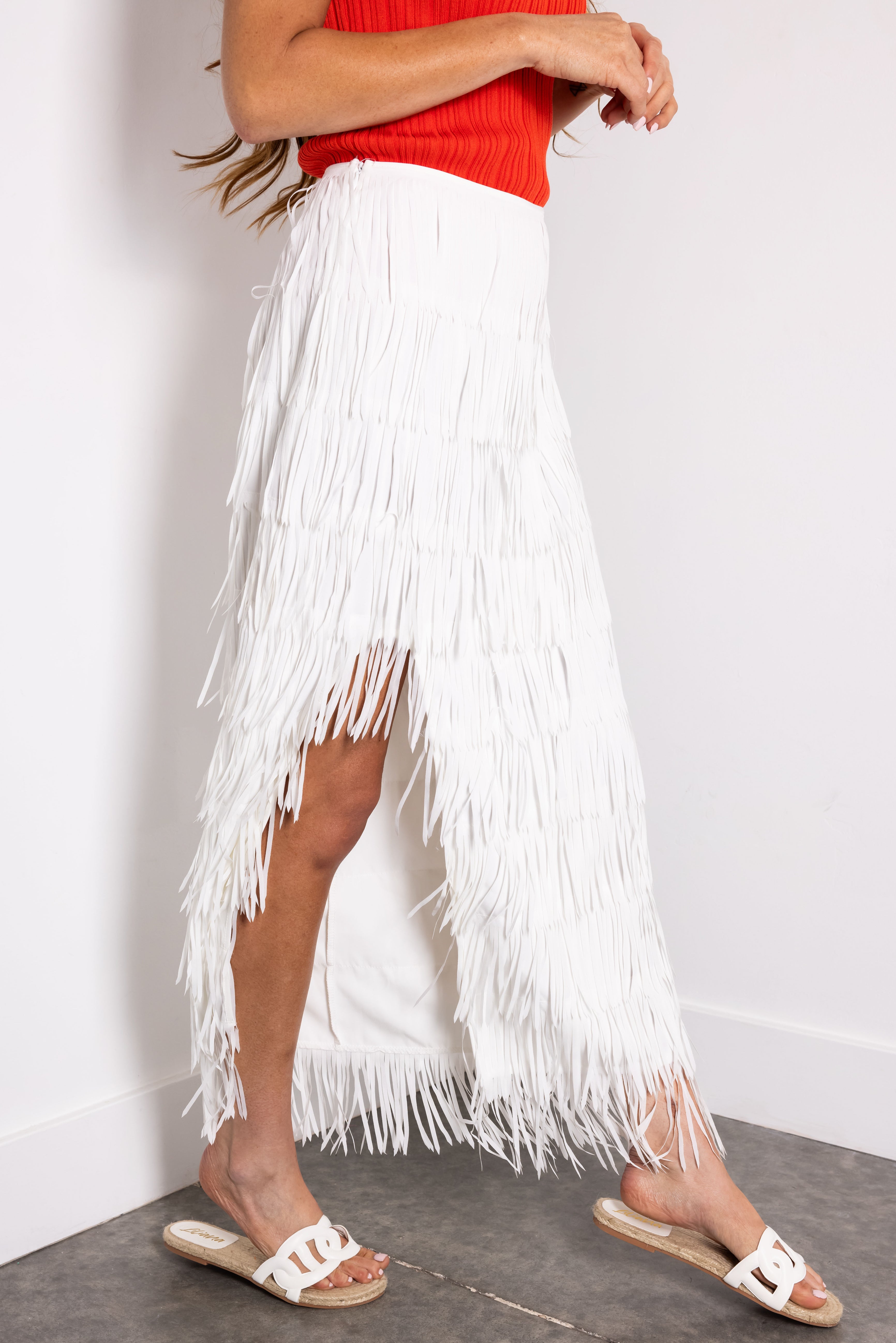 Upgrade your wardrobe with this stylish White Tiered Fringe Midi Skirt . Crafted from a semi-stretchy woven fabric, this skirt features a side zipper for easy wear and a trendy fringe detail for added flair. Perfect for date nights, going out, or parties, this skirt comes in sizes Small, Medium, and Large, with waist measurements of 27, 28, and 29 inches respectively. The length ranges from 33.5 to 37.5 inches, offering a flattering silhouette. This skirt is unlined and made of 95% Polyester and 5% Spandex for comfort and style. Hand wash cold, iron low, and avoid tumble drying to prolong the life of this chic piece. Model is wearing a size Small and has a Size 2 profile, measuring at 58″ with a bust size of 32 inches and a waist of 25 inches.