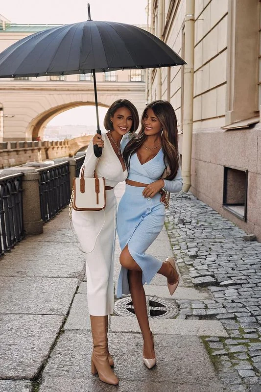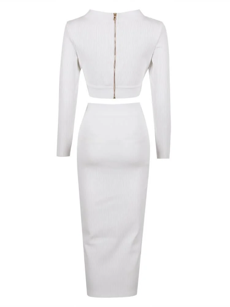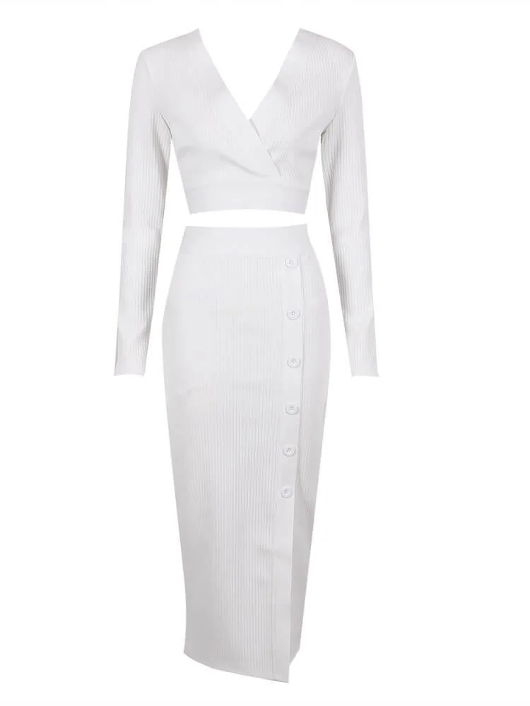 Elevate your style with this chic White Bandage Set featuring a V-neckline and long sleeves. Made with high-stretch bandage material (95% Polyester, 5% Spandex) for a flattering fit. The midi length with side slits adds a trendy touch. Complete the look with heels for a stunning outfit. This set is machine washable and comes with a zippered back opening. Please note that color may vary due to lighting effects. Model is shown wearing size S.