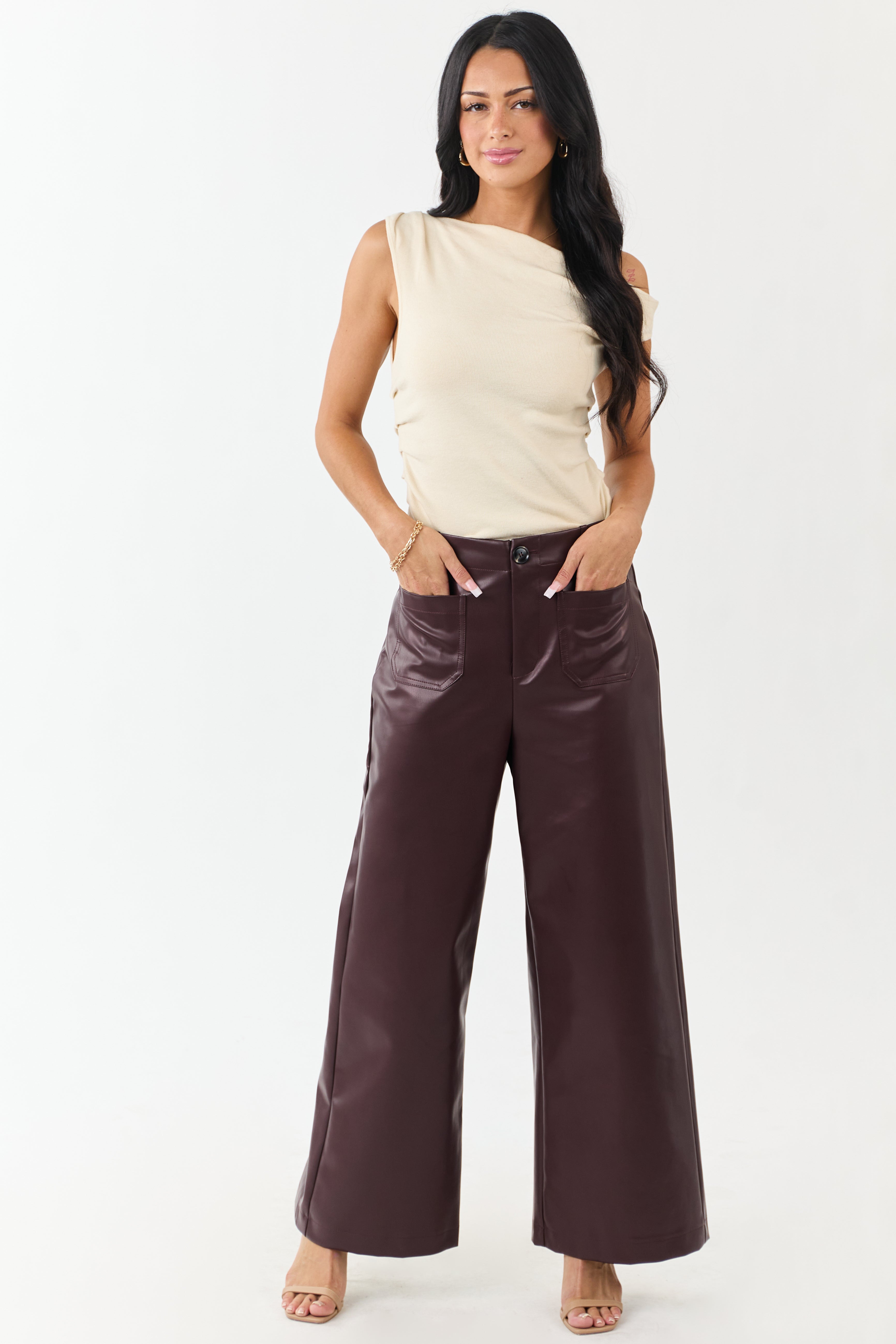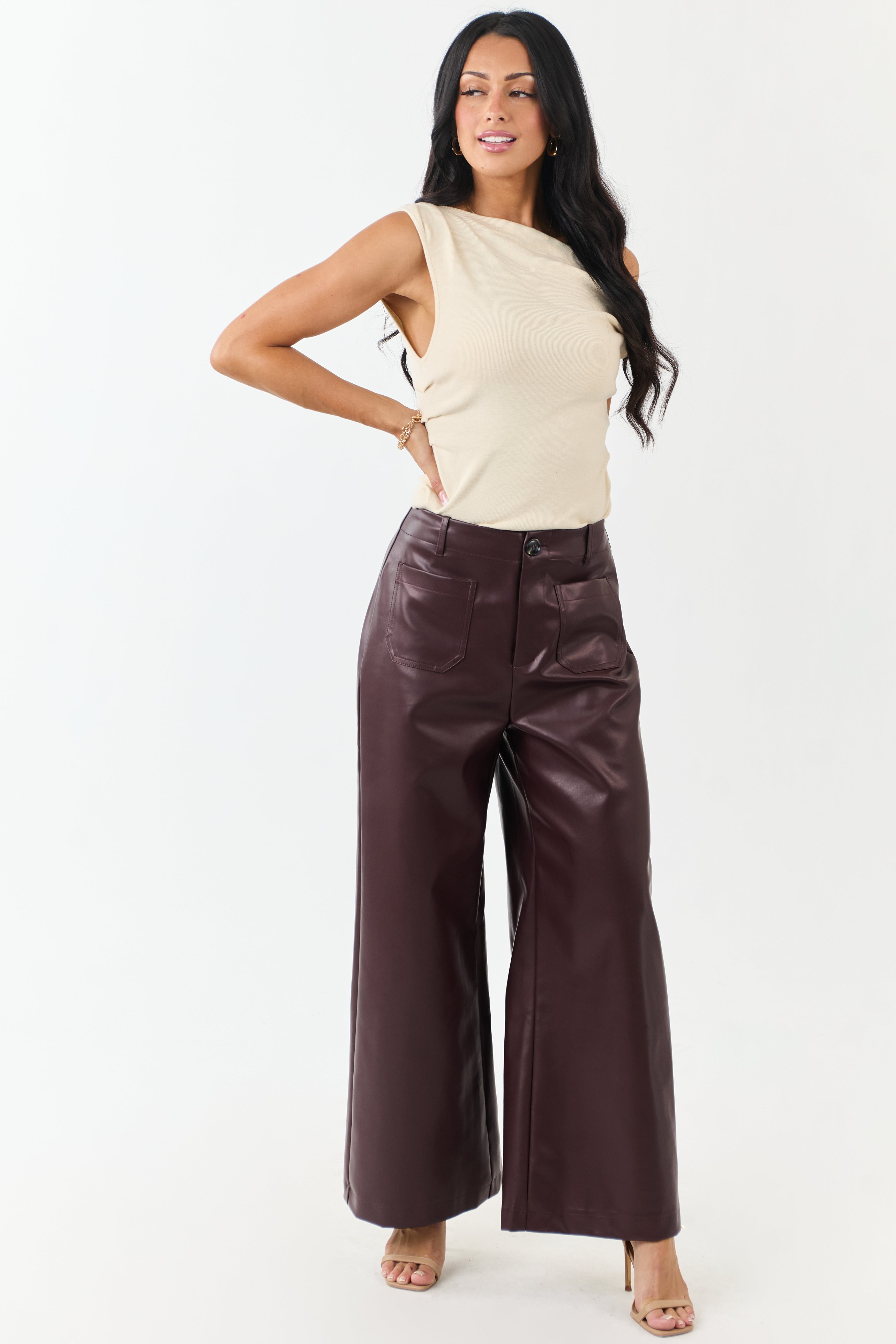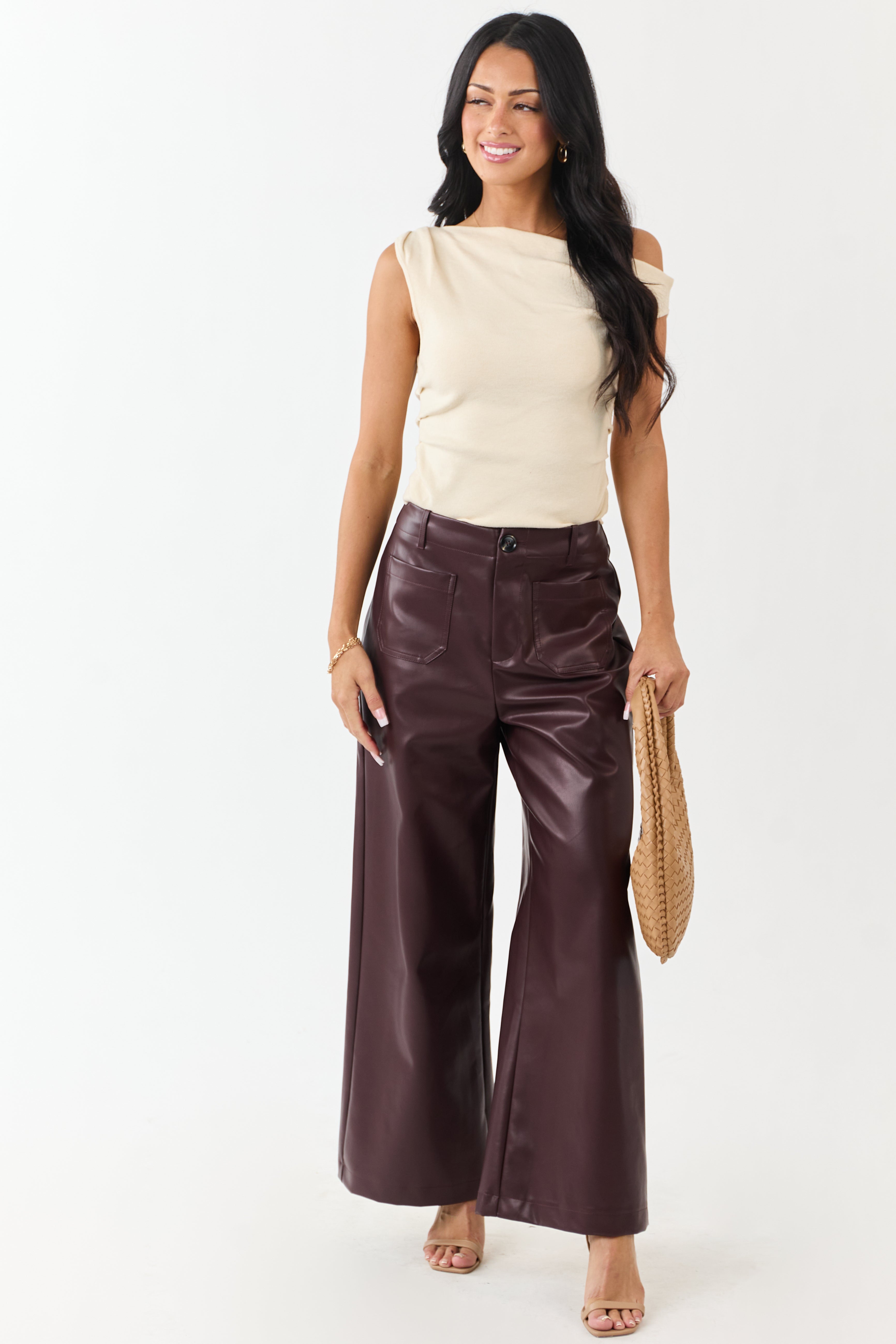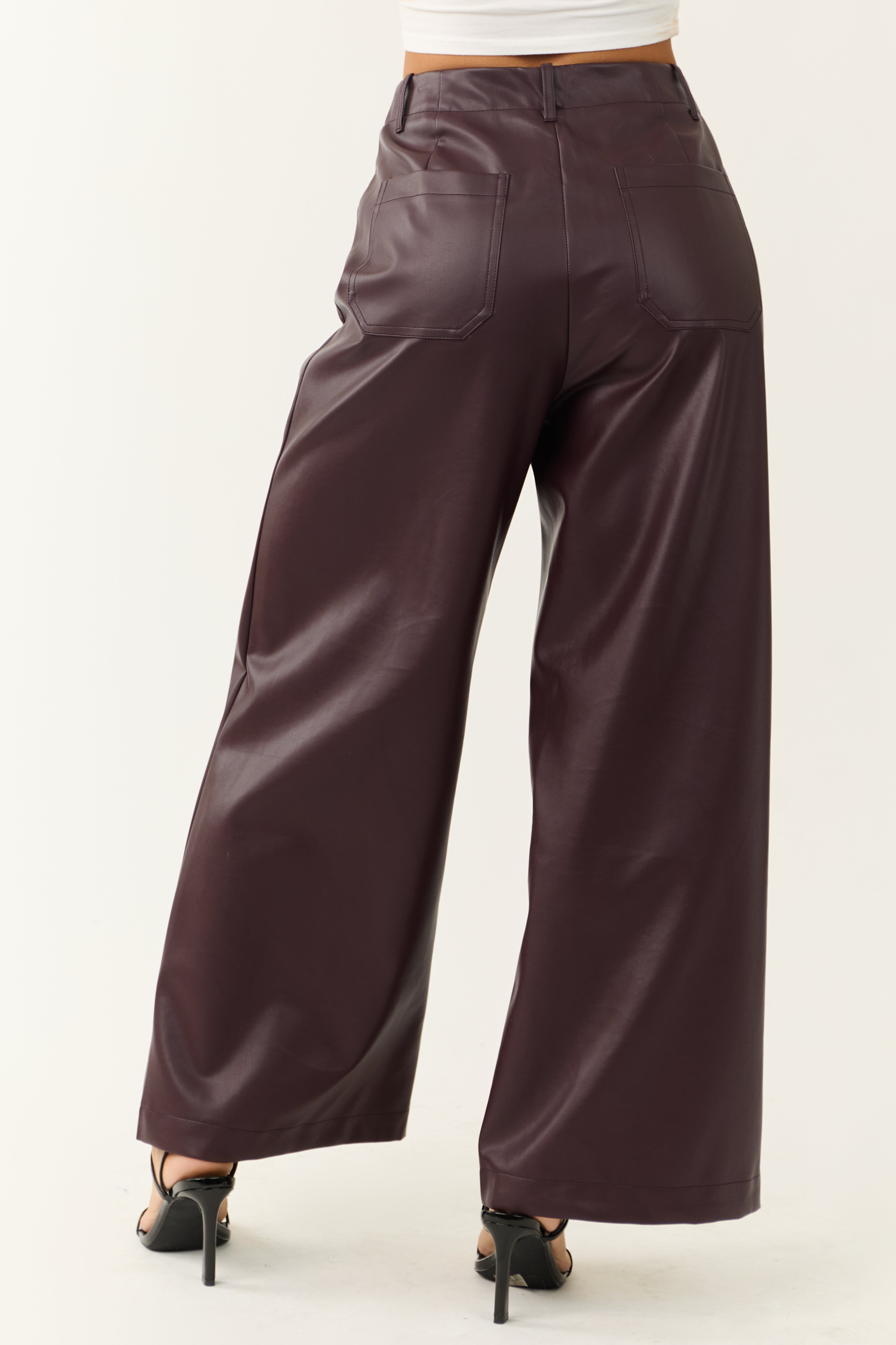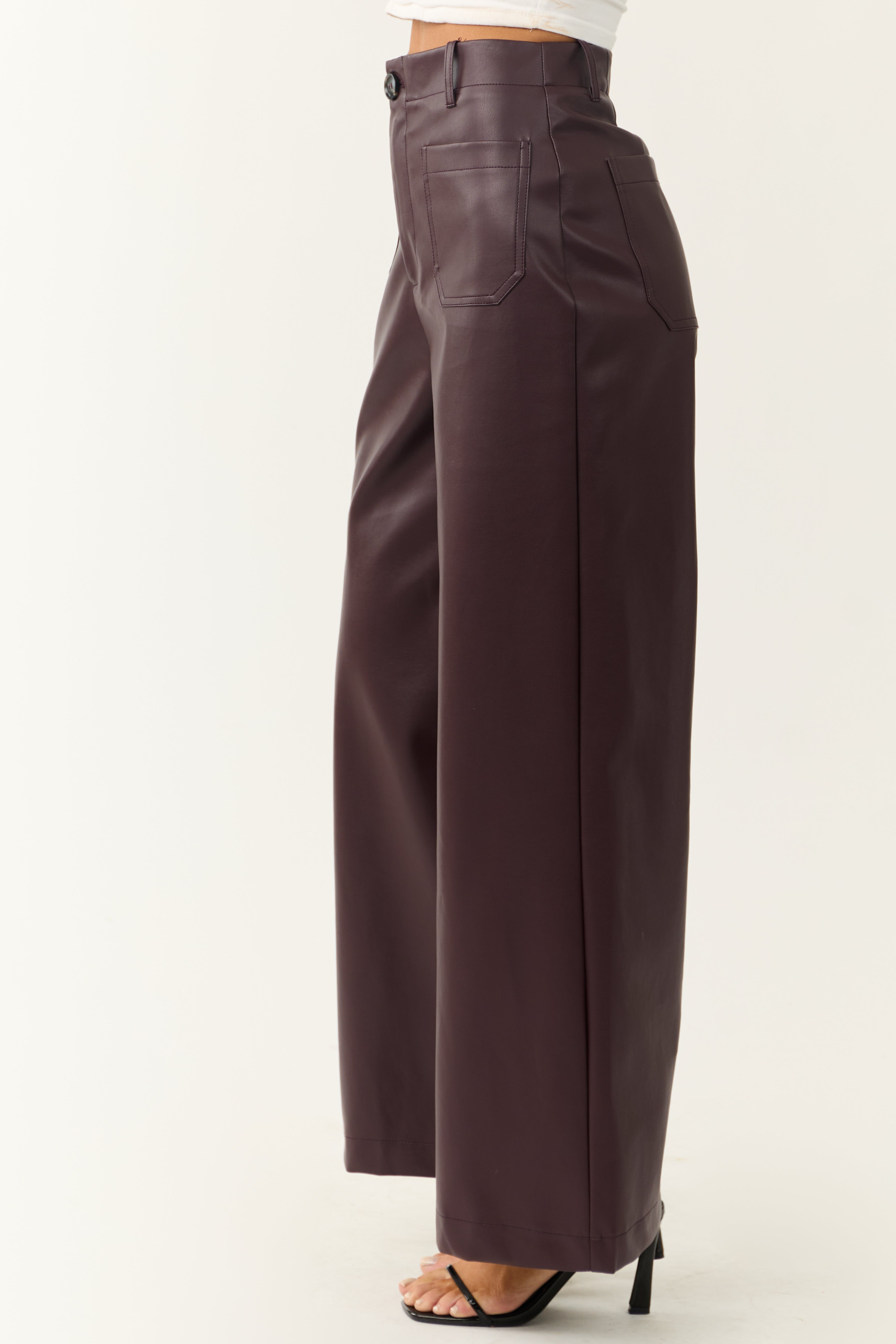 Step up your style with these rich, statement-making faux leather pants. Featuring a modern wide-leg silhouette and super high rise fit, these pants are perfect for any occasion. Made of non-stretchy faux leather for a luxurious feel. Includes zipper fly, button closure, belt loops, and 4 pockets. Imported 55% Cotton, 45% Polyurethane blend. Available sizes: S, M, L.