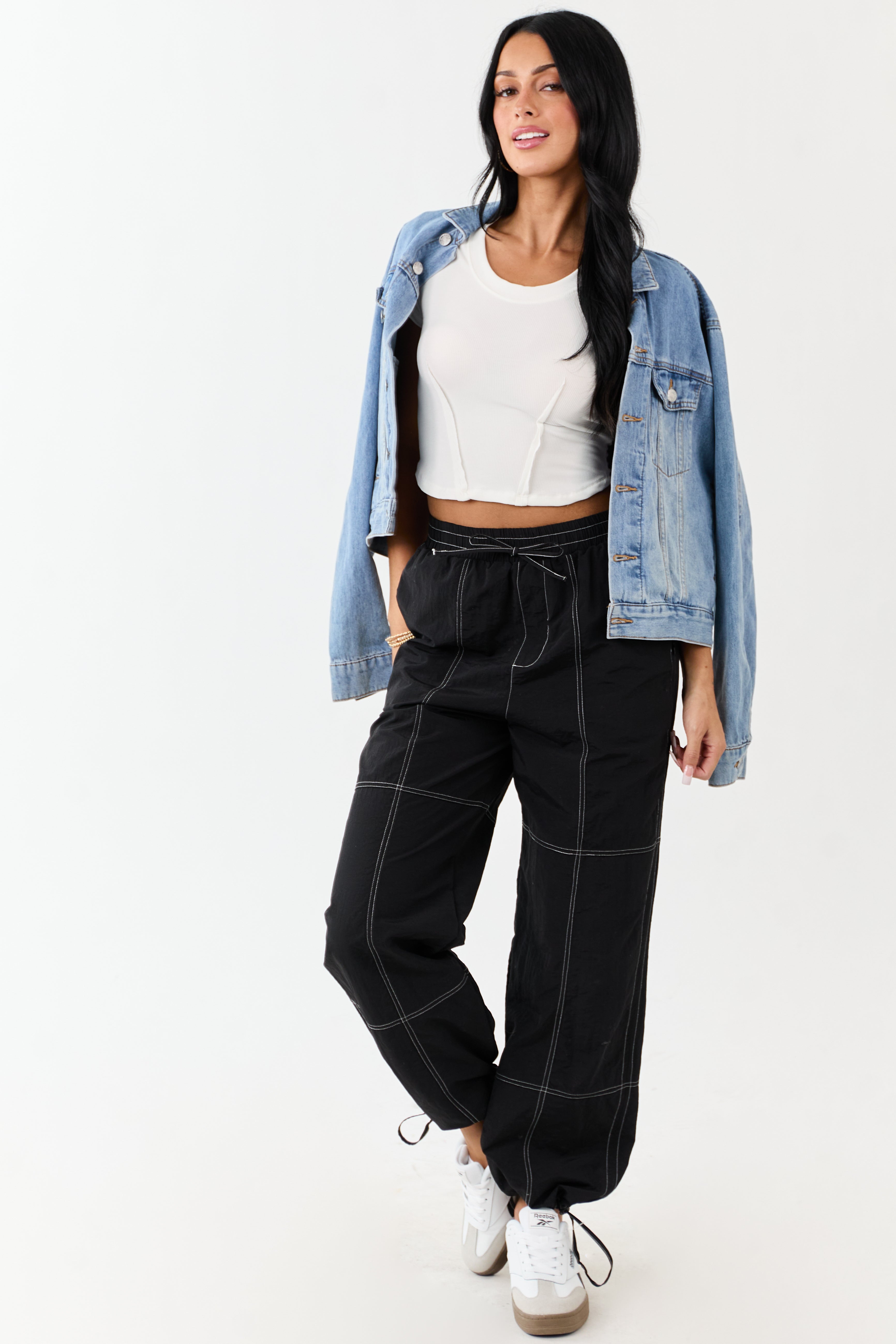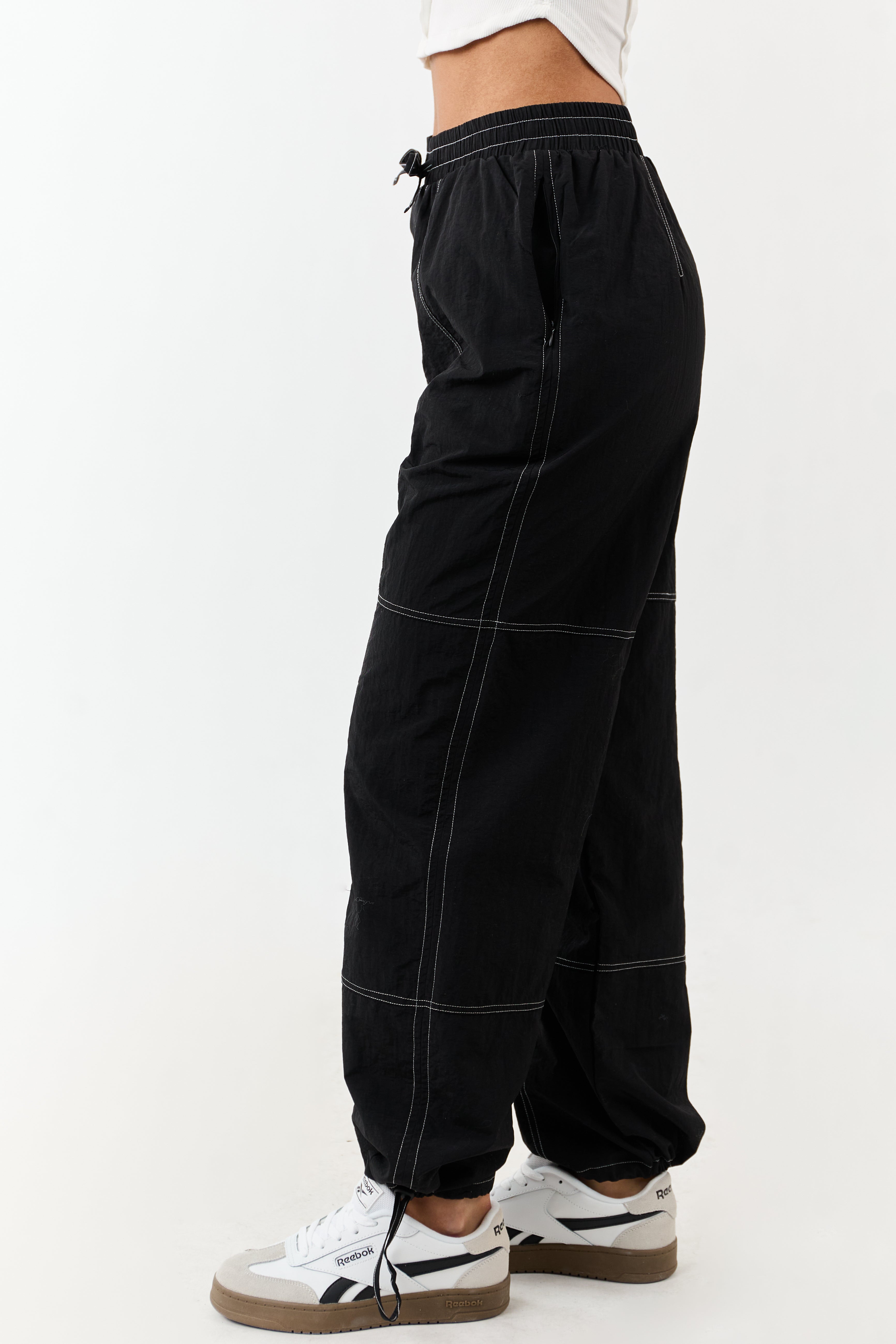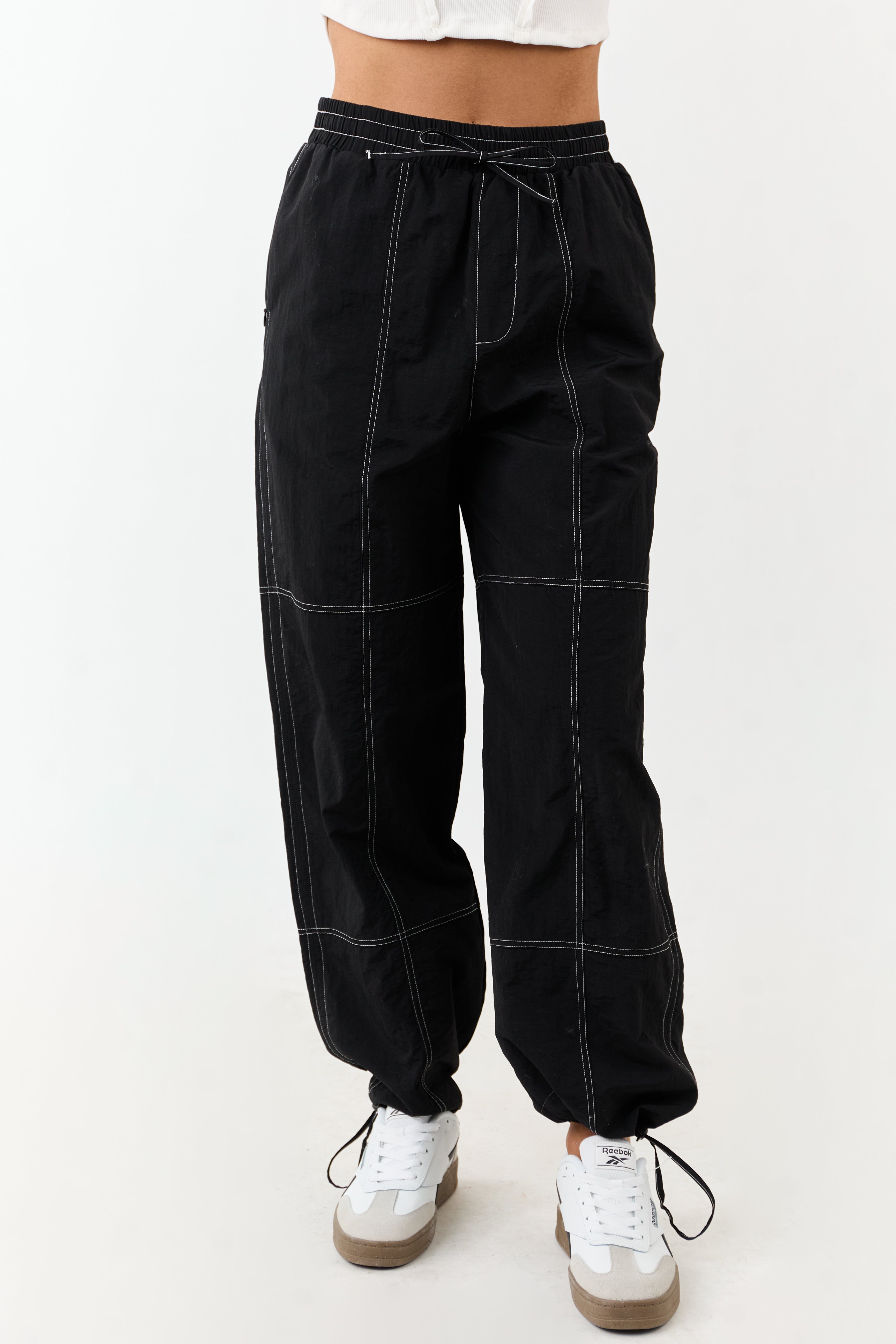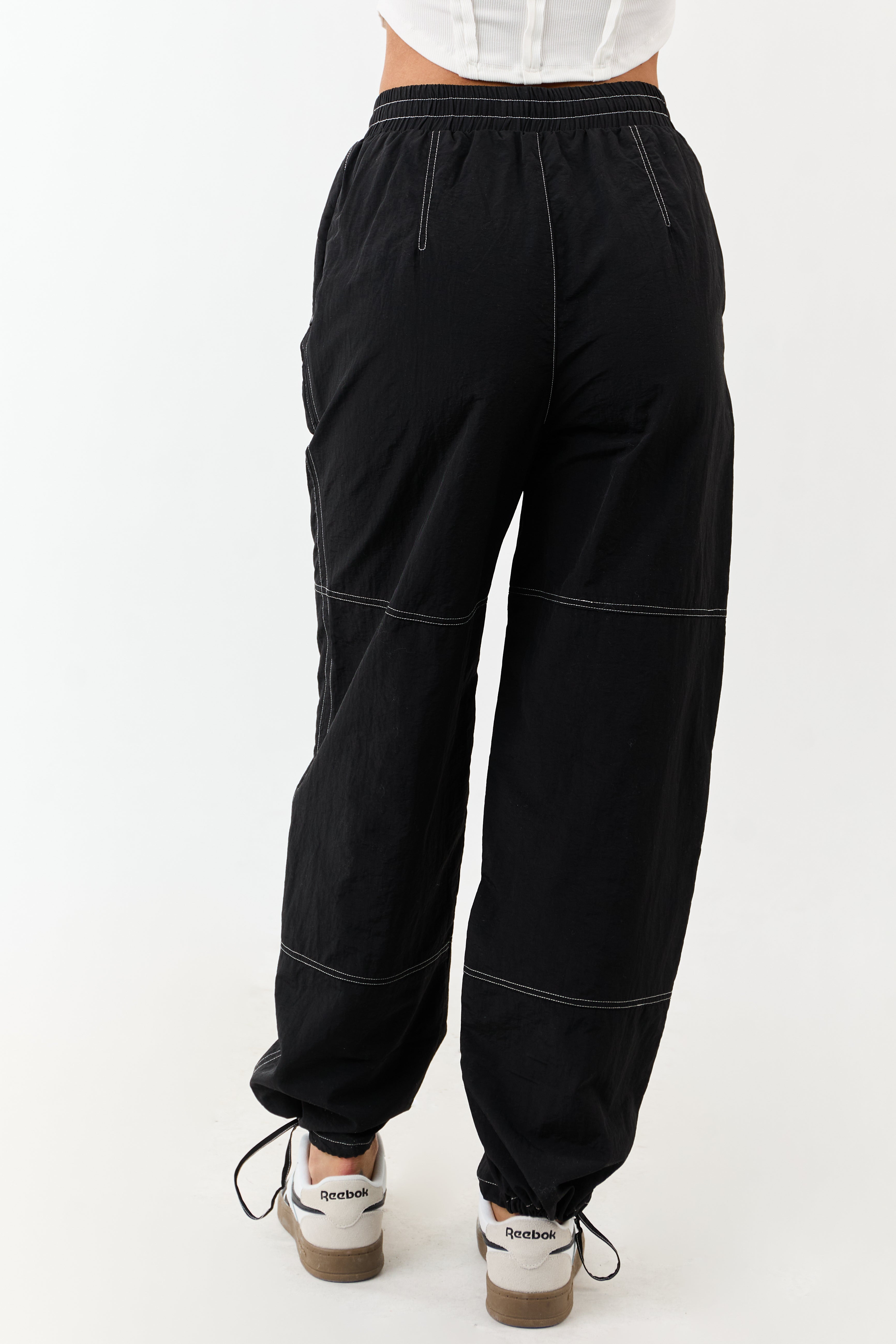 Enhance your wardrobe with these versatile wide-leg drawstring pants in timeless black color. Crafted from 100% polyester, these pants feature striking ivory contrast stitching, a comfortable drawstring waist, and functional zipper pockets. The high-waisted design with smocked details ensures a flattering fit, perfect for everyday wear. With a 29″ inseam and adjustable drawstring waistband, these lined pants are as stylish as they are practical. Complete your look with a chic twist by cinching the cuffs. Available in sizes XS to XL.
