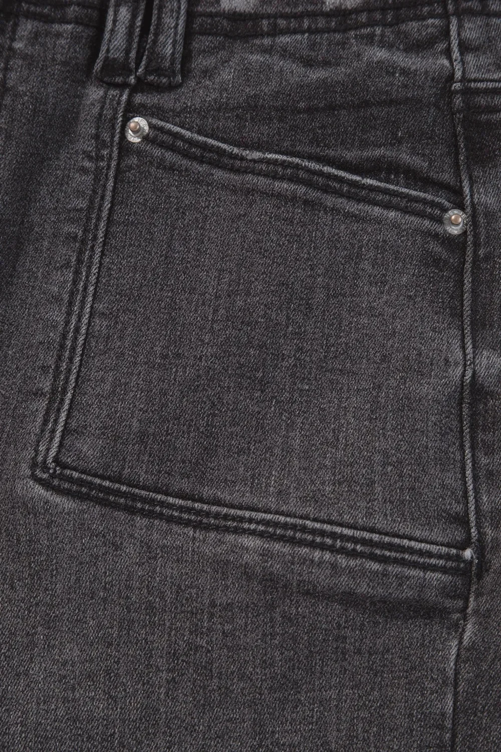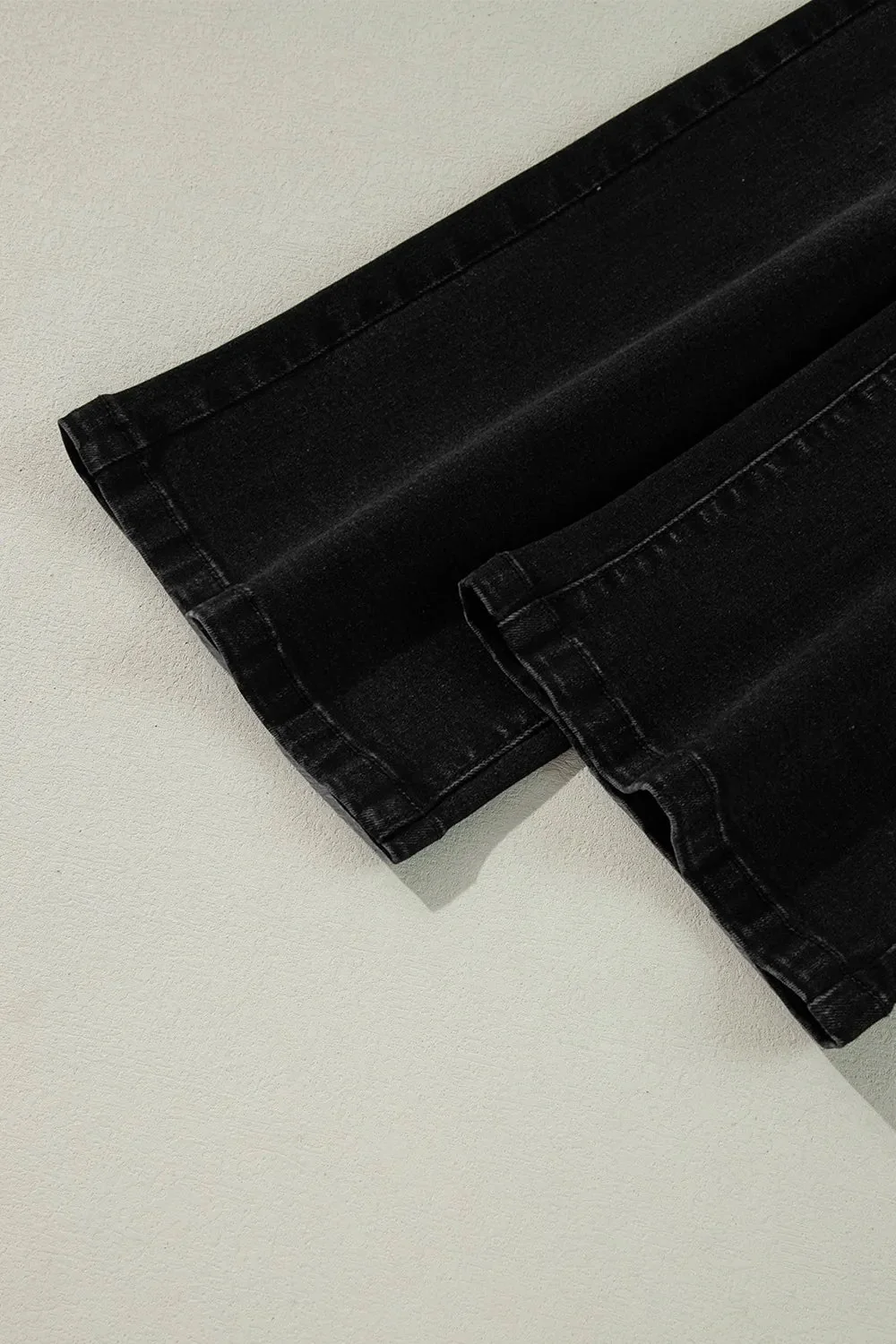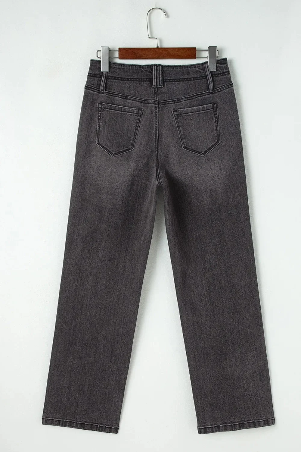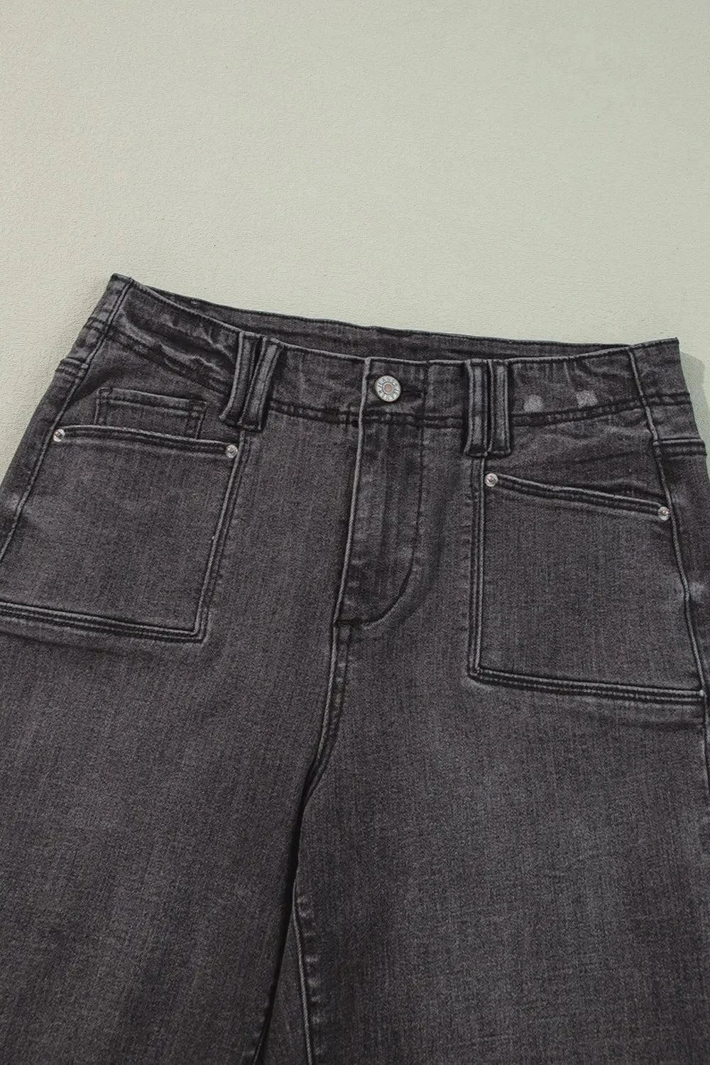 Upgrade your wardrobe with our wide-leg vintage wash jeans in dark gray, dusty blue, and black. Featuring pockets and a flattering high-waist design. Crafted with 65% polyester, 33% cotton, and 2% elastane for comfort and style. Machine wash cold and tumble dry low for easy care. Available in various sizes from 4 to 14.