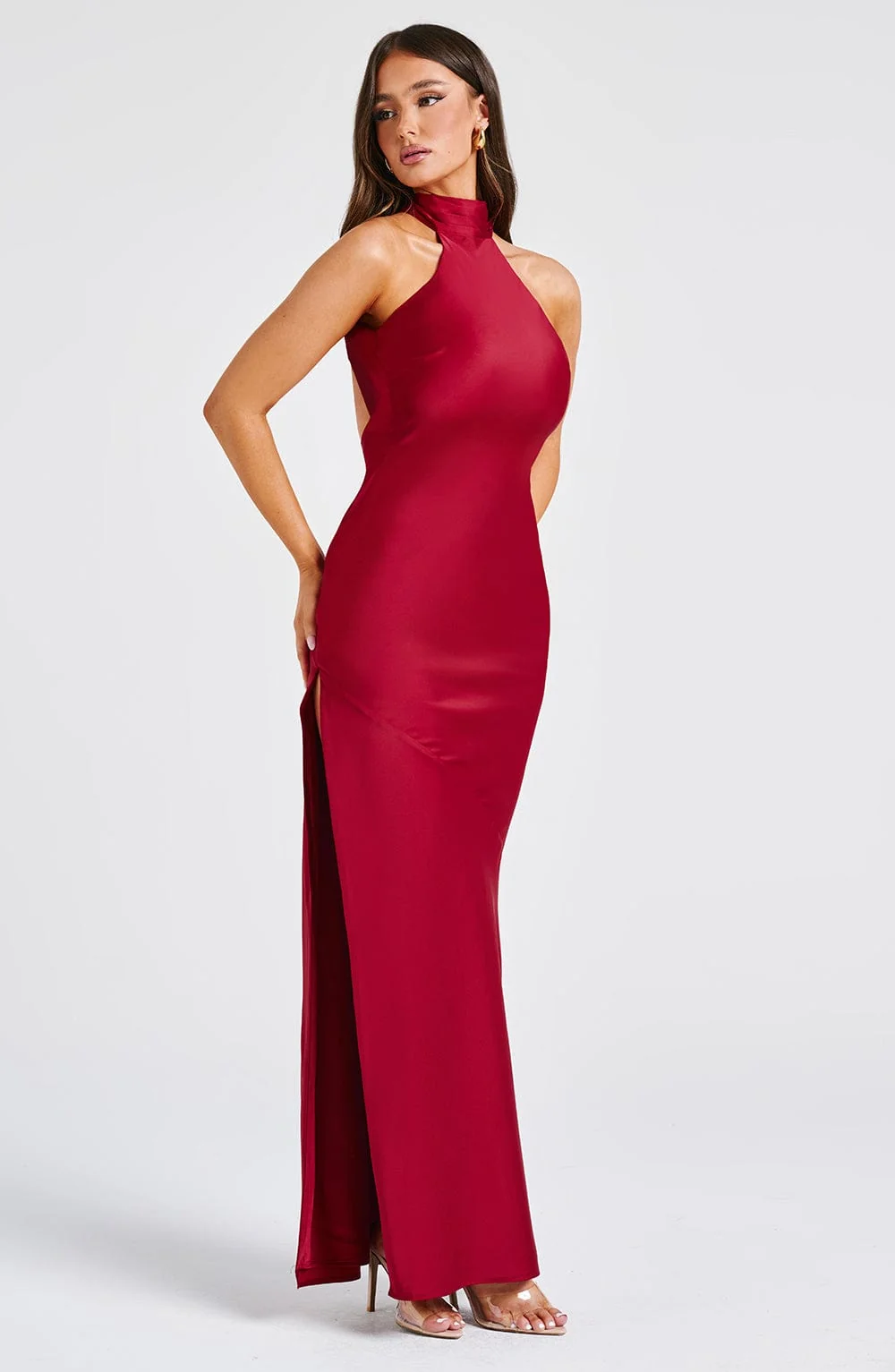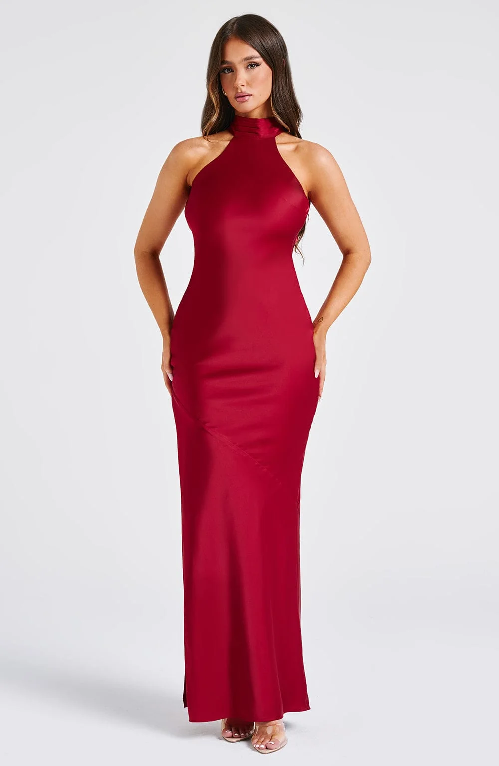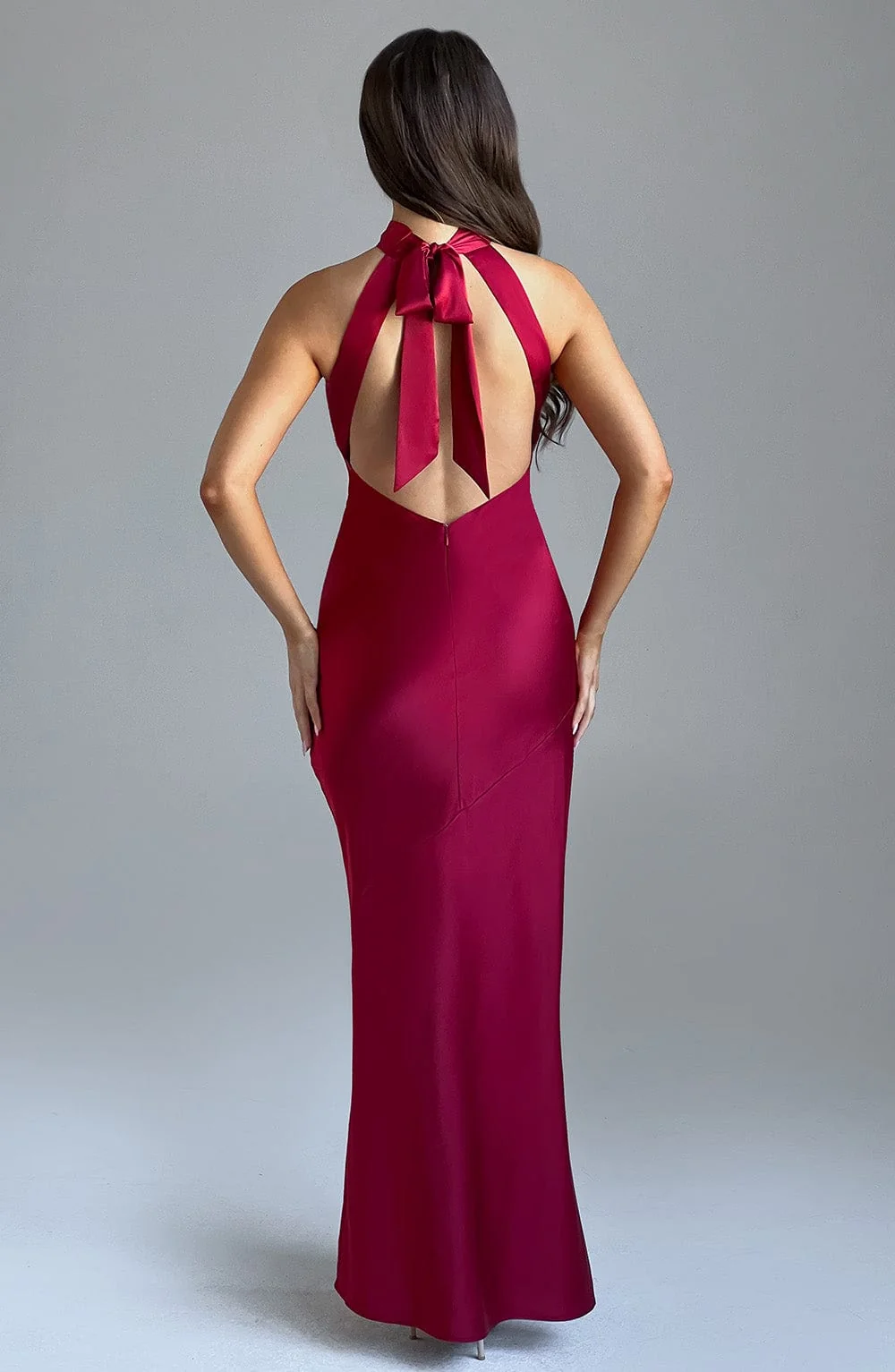 Indulge in unforgettable nights with our Etta maxi dress in wine. Crafted from luxurious bias cut satin, this gown features a high neckline, backless design, and oversized tie neck detail. Flatter your figure as it gently flares at the hem, enhancing your elegant look. Perfect for formal occasions and weddings, this maxi dress exudes sophistication and style. Elevate your ensemble with platform heels and exude timeless elegance.