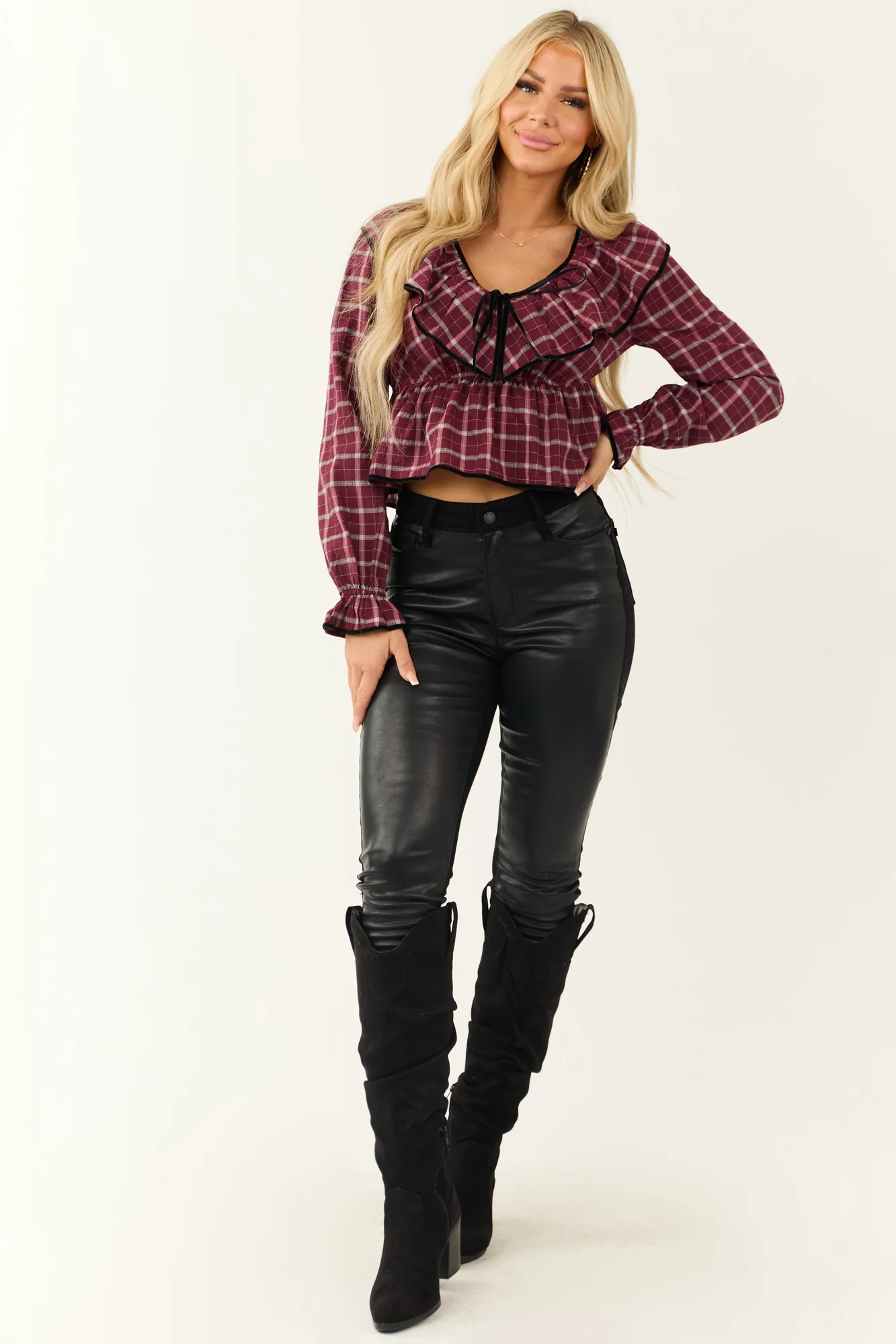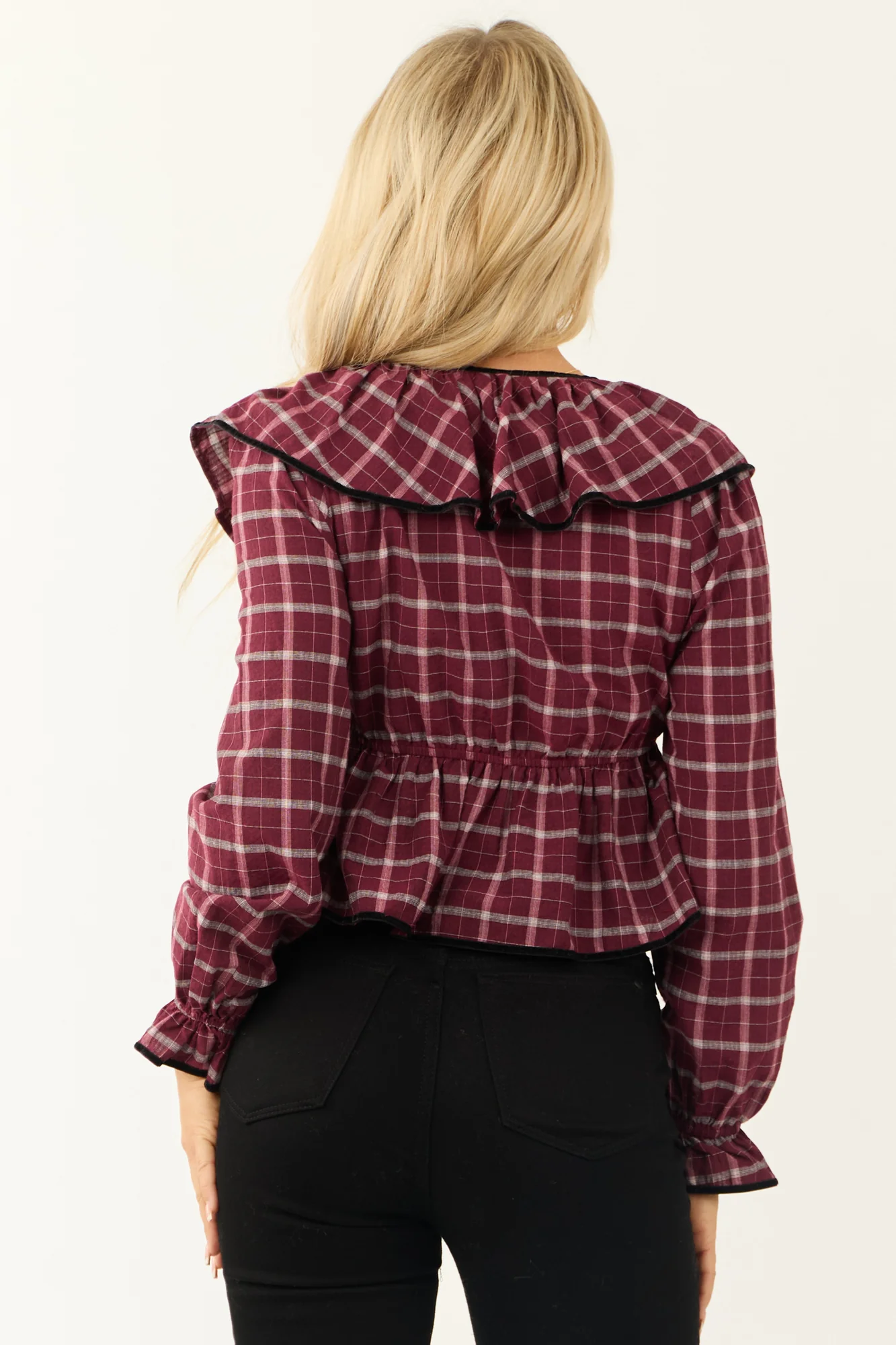 Indulge in the charming elegance of this wine-colored plaid V-neck top with luxurious velvet trim. This semi-cropped top features ruffle detailing, elastic flare cuffs, an adjustable tie at the neckline, and an elastic peplum waist for a flattering fit. Step out in style with the perfect blend of comfort and sophistication. Crafted from non-stretchy woven cotton, this top is ideal for any casual or formal occasion. Hand wash cold for lasting quality. Model is wearing a size Small. Model’s Profile: Size 1, Height 57″, Bust 34″, Waist 26″.