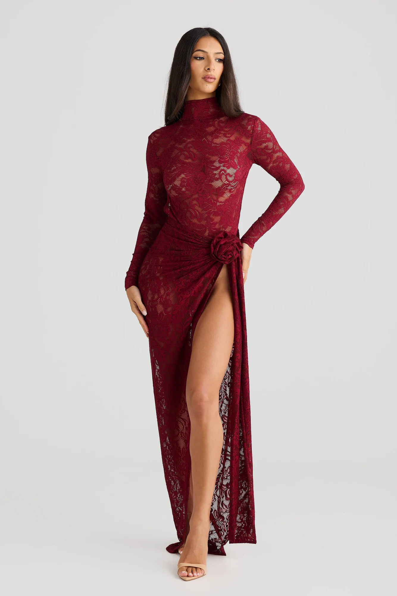 Enhance your wardrobe with Albane, a timeless lace backless bodysuit dress set that brings elegance to any outfit. This two-piece ensemble features sheer lace, a stretchy fabric, neck button closure, and a low V back detail. Perfect for pairing with various bottoms or styling with your favorite denim. Available in wine red color and sizes S, M, and L. True to size.