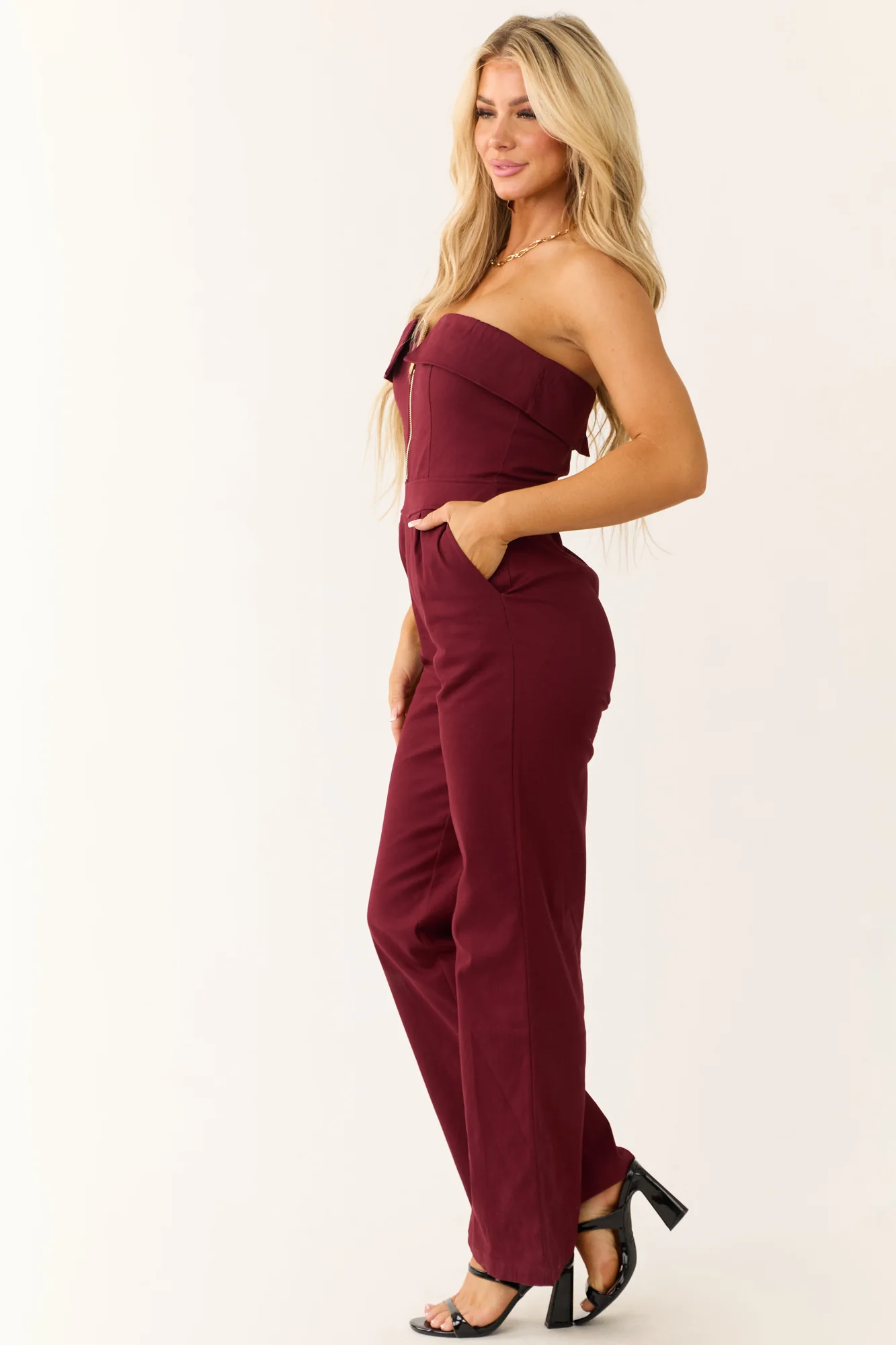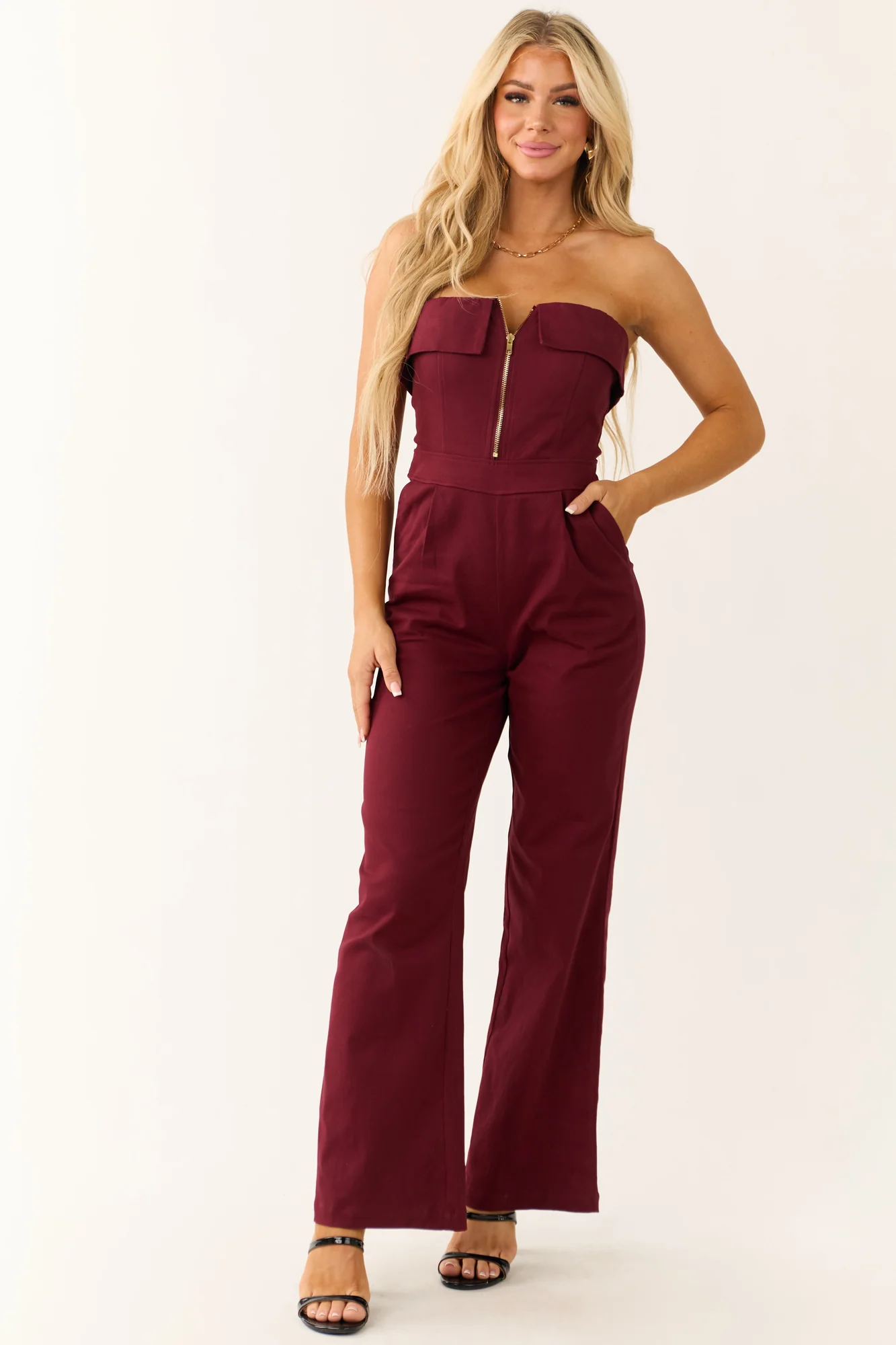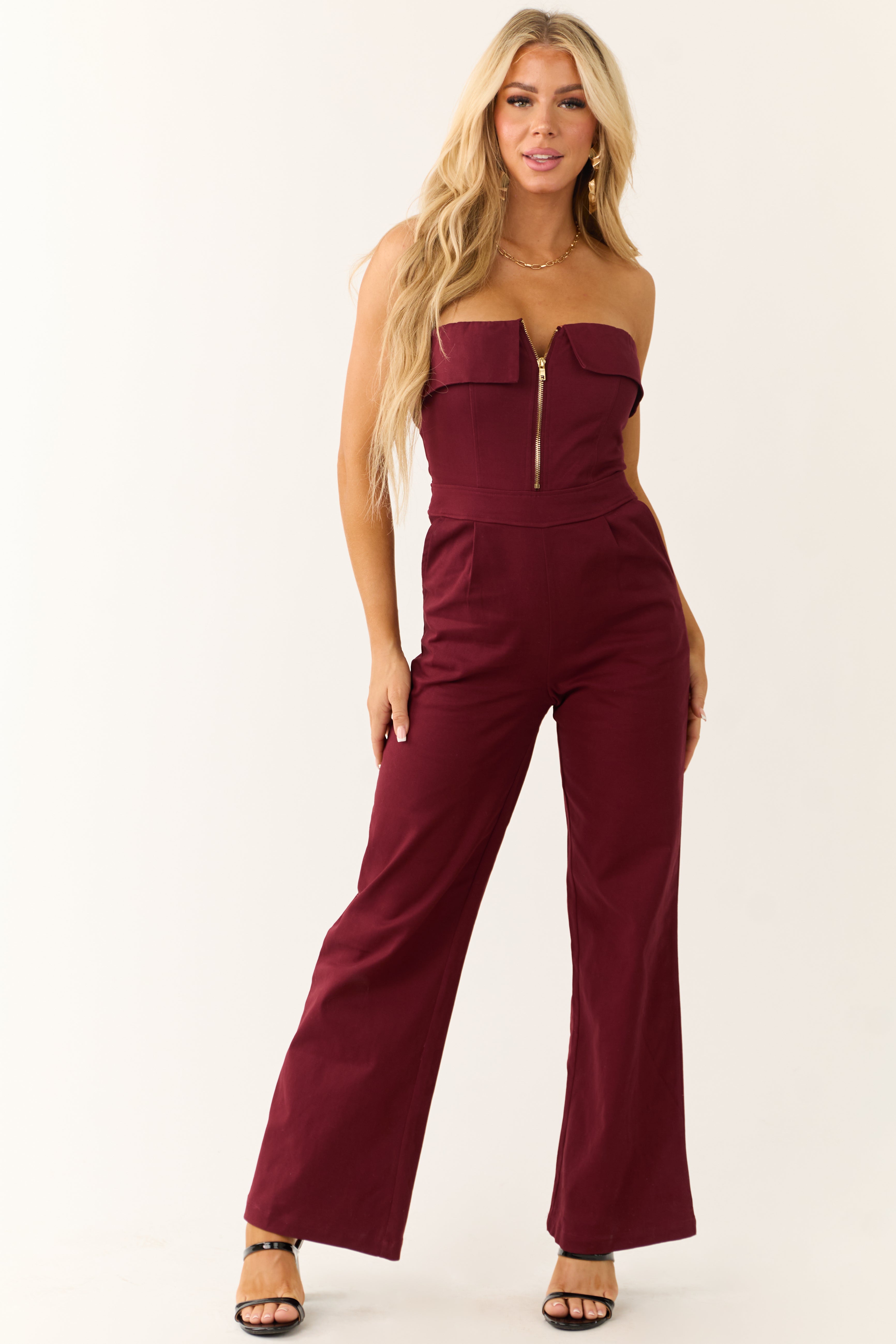 This stunning Wine Strapless Zip Jumpsuit is a must-have for your wardrobe. Available in sizes S, M, and L, with a zipper front and back for easy wear. Made of 97% Rayon and 3% Spandex, this non-stretch woven jumpsuit features wide legs and pockets. Dress up for any occasion with this chic and comfortable outfit. Please hand wash cold and hang to dry for best care.
