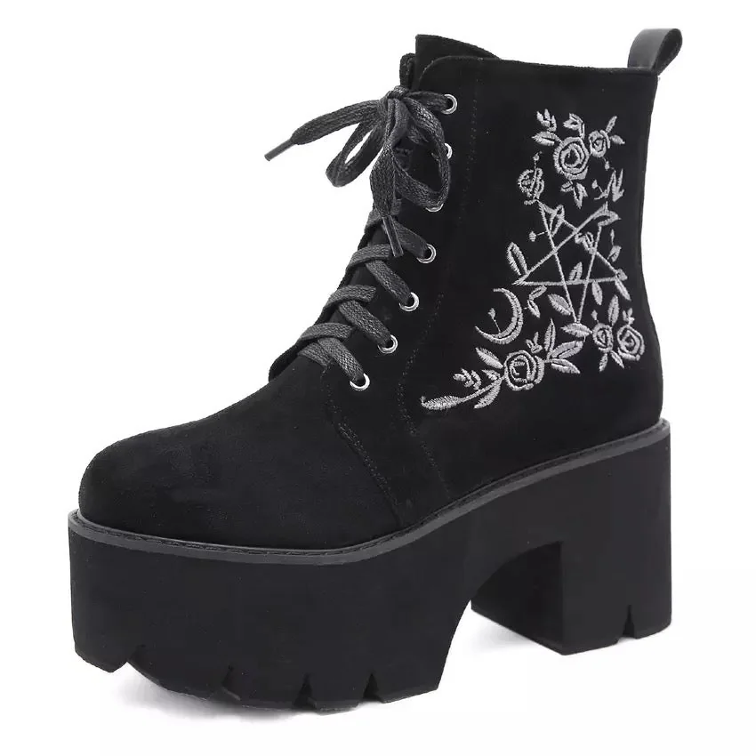 Indulge in the enchanting allure of the Witchy Floral Ankle Boots. These lace-up daily wear boots feature a captivating floral foliage and crescent moon design, accentuated by a mystical pentagram star. Crafted from high-quality Artificial P.U. Leather & Faux Suede with a durable rubber sole. Available in USA Sizes 4.5 to 9.5 (EU Sizes 35 to 42) catering to ultimate comfort and style. Elevate your look with these uniquely charming boots!