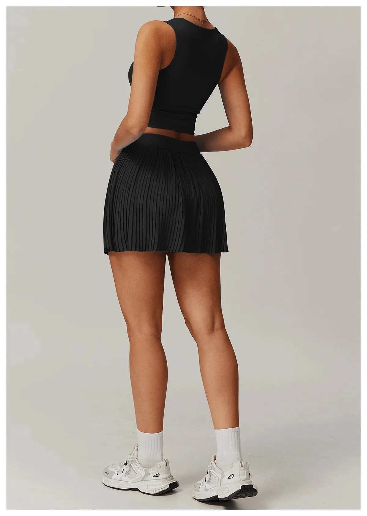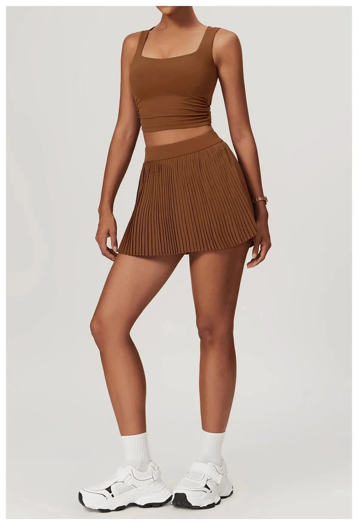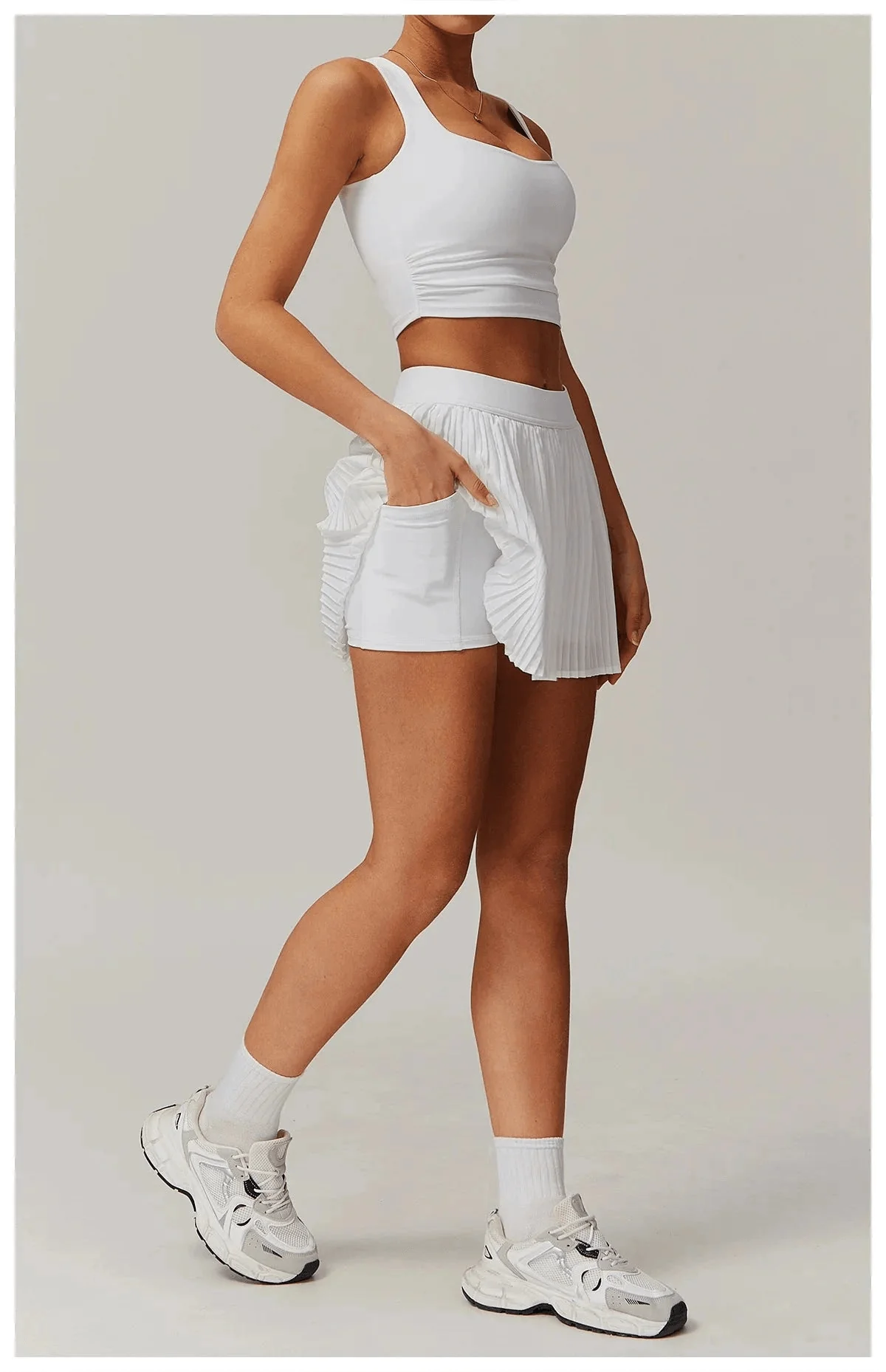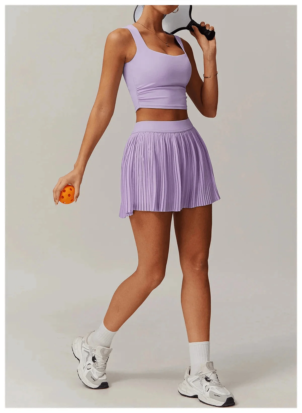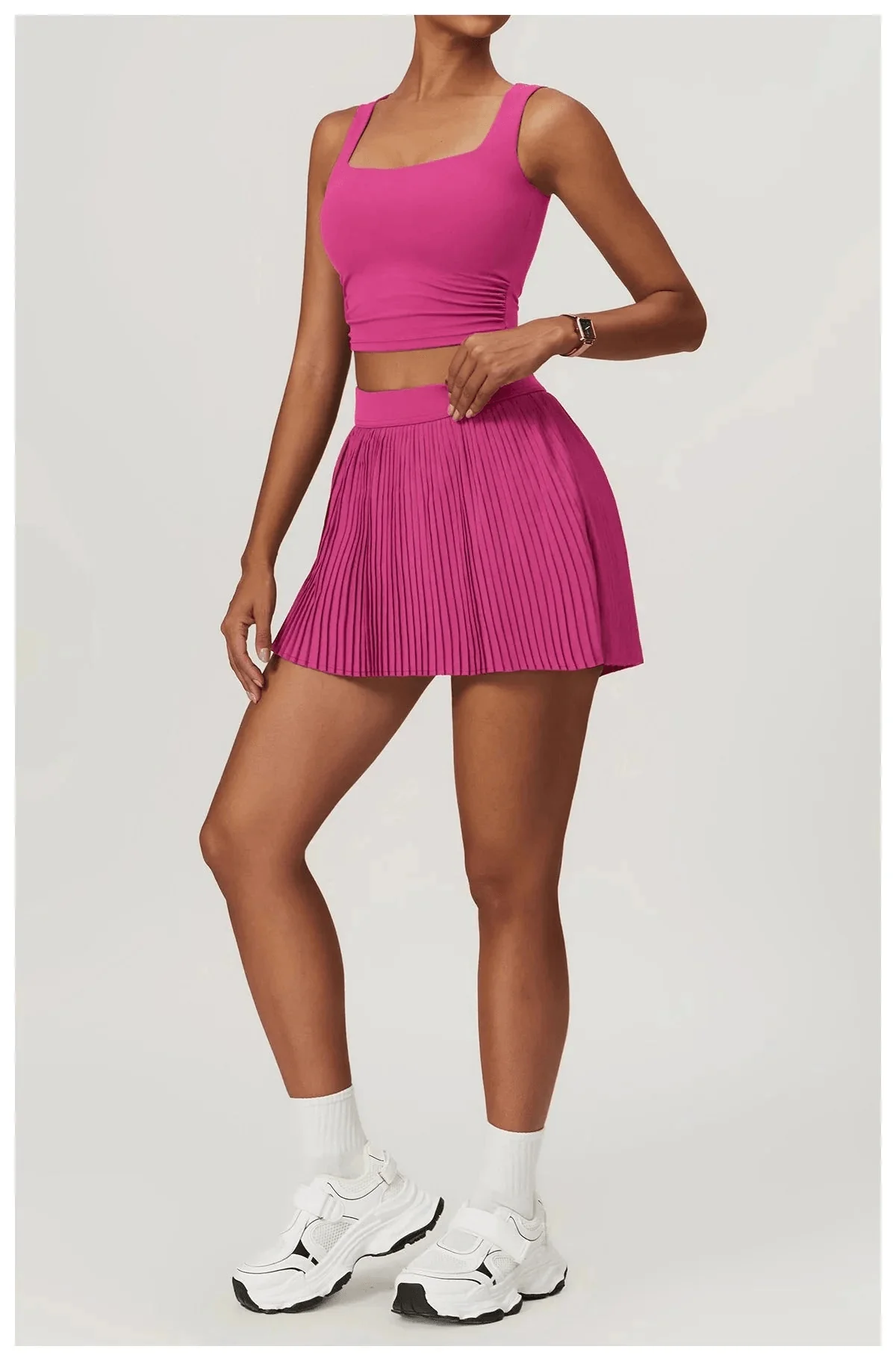 The Womens Ace Court Bra Set is designed for ultimate comfort and performance. Made of 78% Nylon and 22% Spandex, this set is perfect for daily wear, yoga, fitness activities like running, climbing, and dancing. Enjoy the freedom of movement with the breathable and elastic material. The skirt top combo ensures a fashionable and comfortable experience. Complete your OOTD with this must-have gym outfit. With a 100% money-back guarantee and secure worldwide shipping, theres no risk in trying it out!