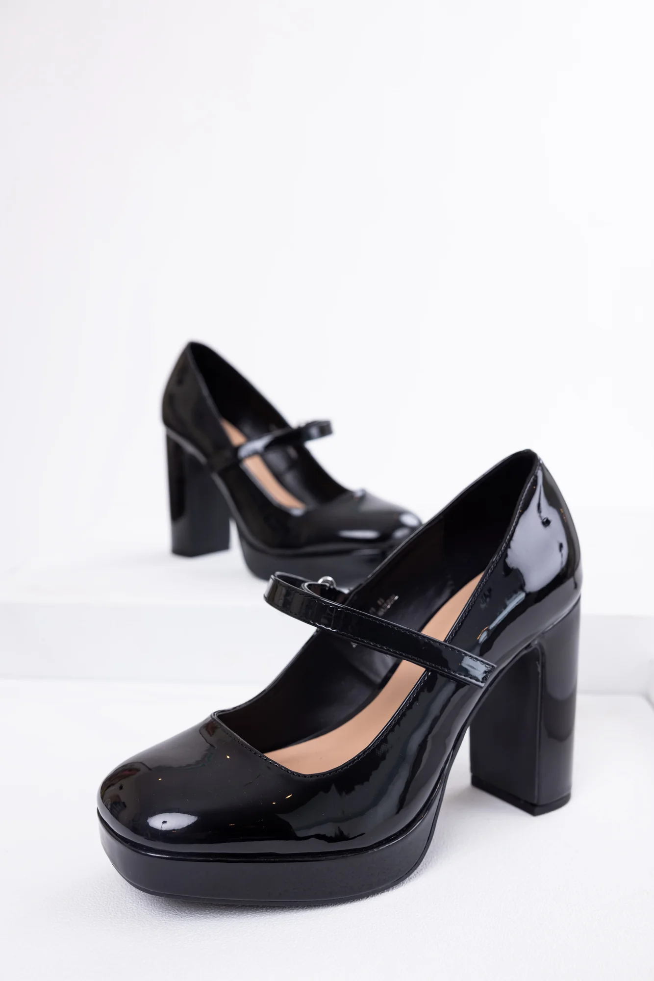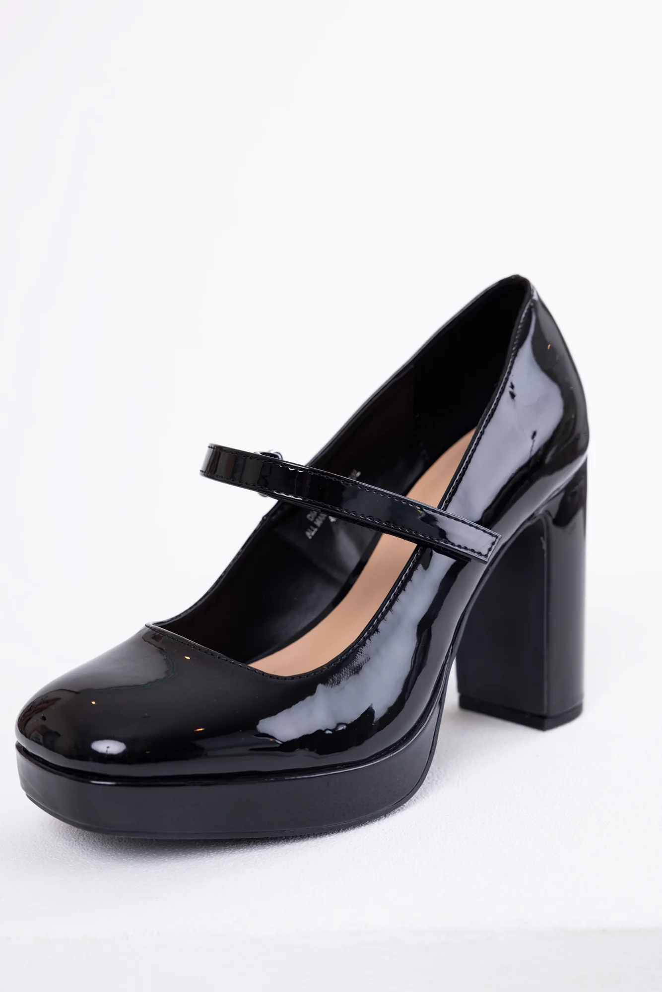 Step out in style with these womens black Mary Jane shoes featuring a shiny pleather construction, square toe, open toe design, adjustable strap, and a comfortable block heel. The rubber sole provides traction, making them perfect for all-day wear. With a heel height of 4.25 inches, shaft measuring 4 inches, and a platform of 1 inch, these shoes add a touch of sophistication to any outfit. Product measurements based on size 8.