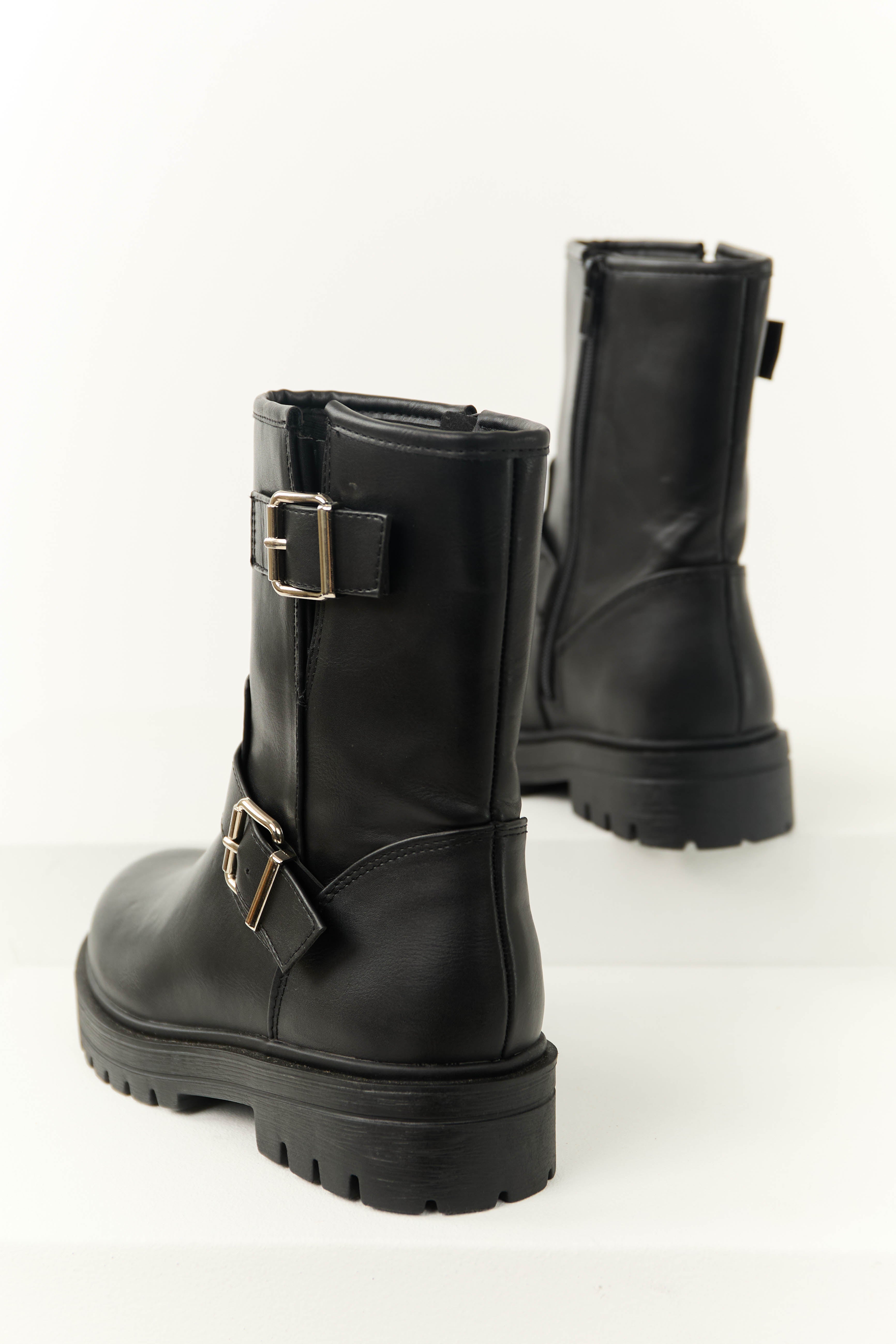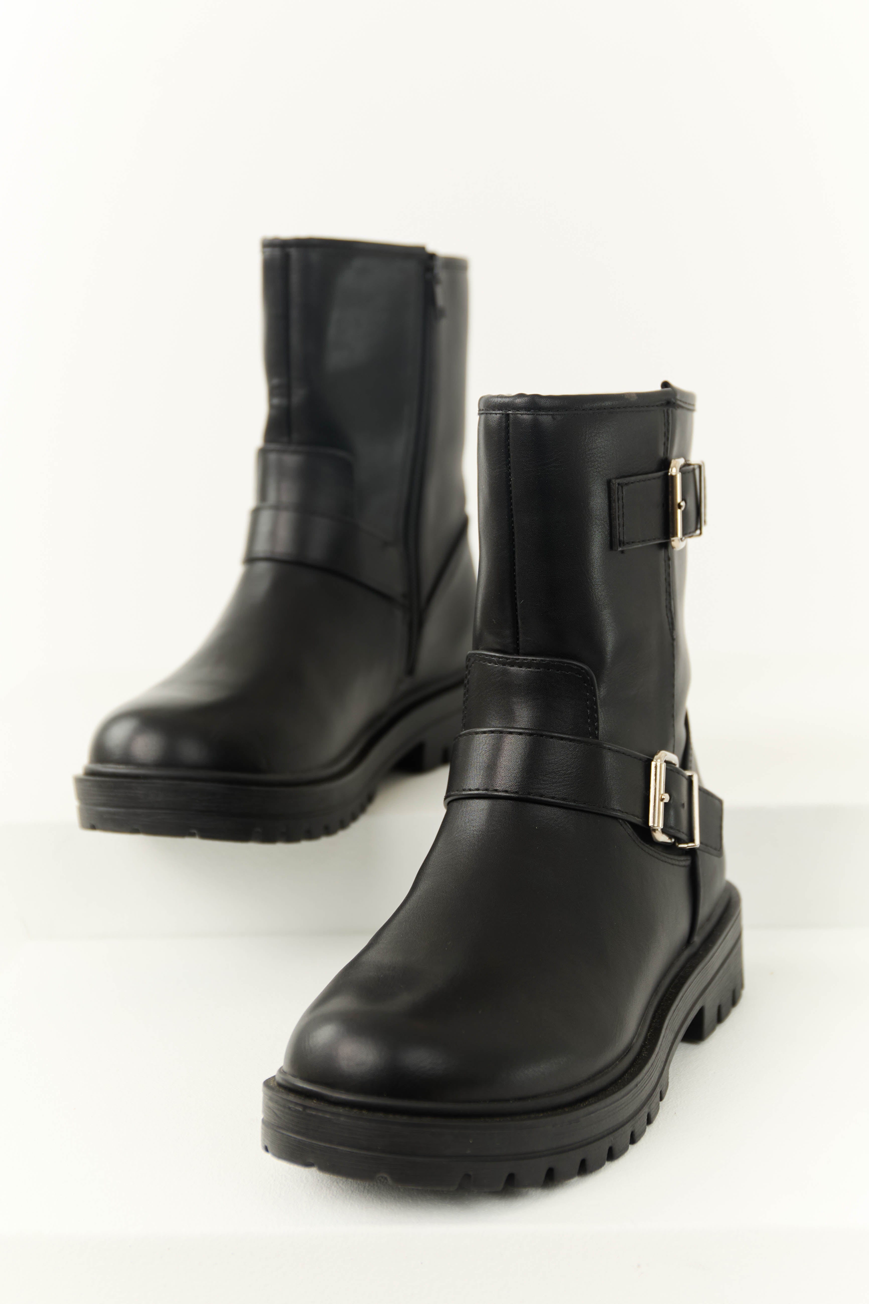 Step up your style game with these womens black ankle boots featuring faux leather construction, double buckle detail, side zipper, and a comfortable rubber sole. The shaft height is 9 inches with a circumference of 11 inches, while the heel measures 1.5 inches. Imported and available in various sizes. Elevate your casual and daytime looks with these chic boots.
