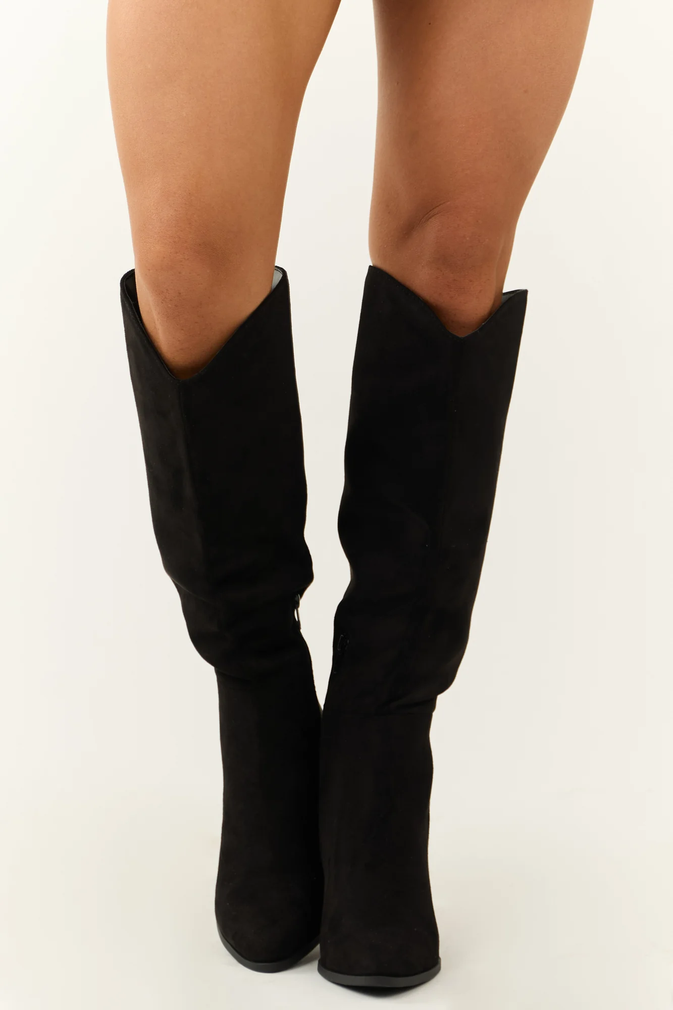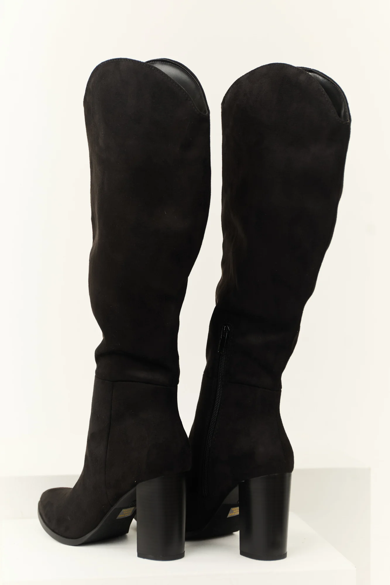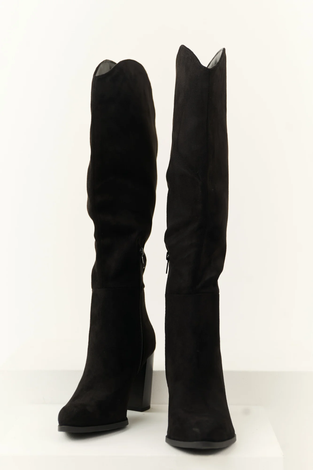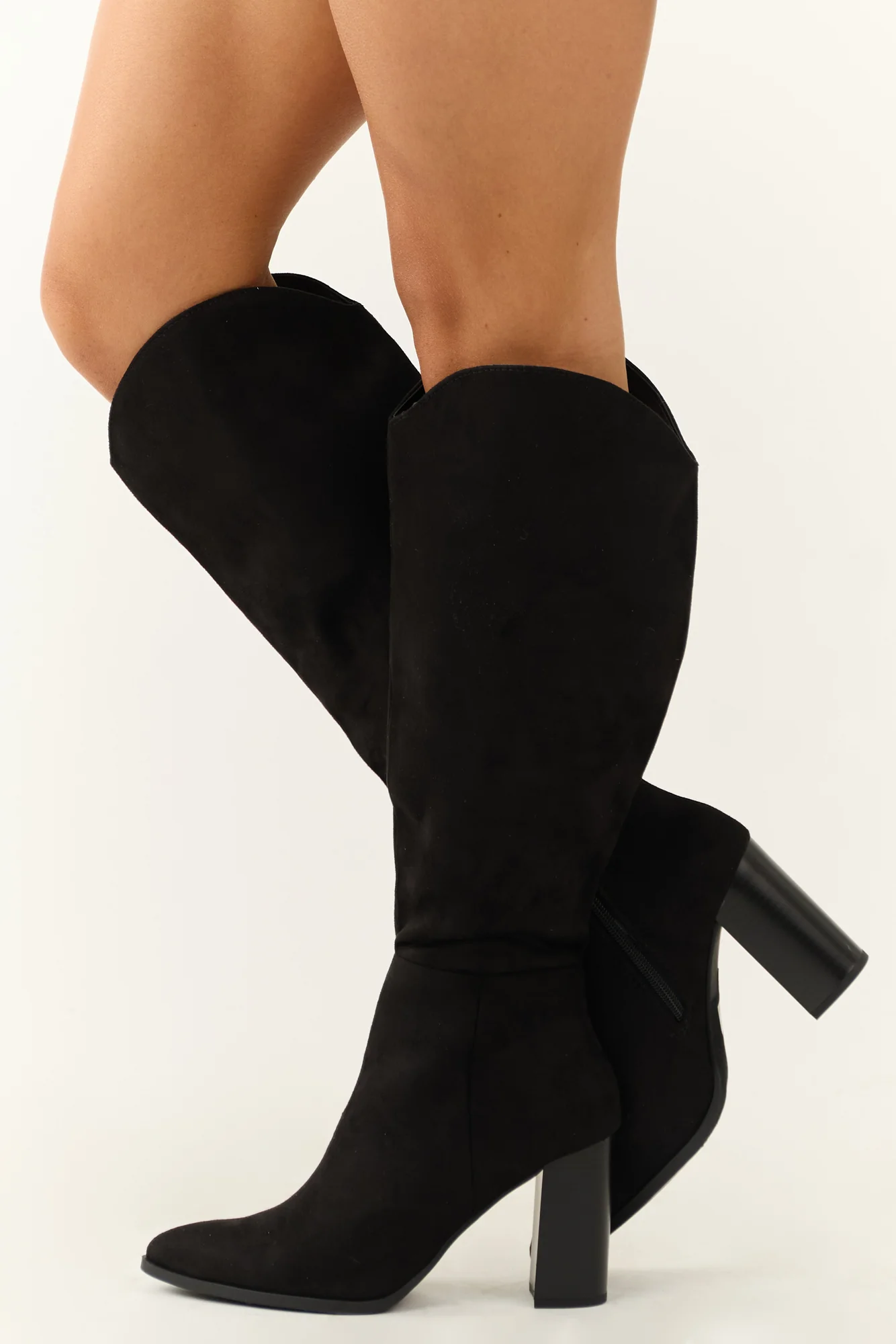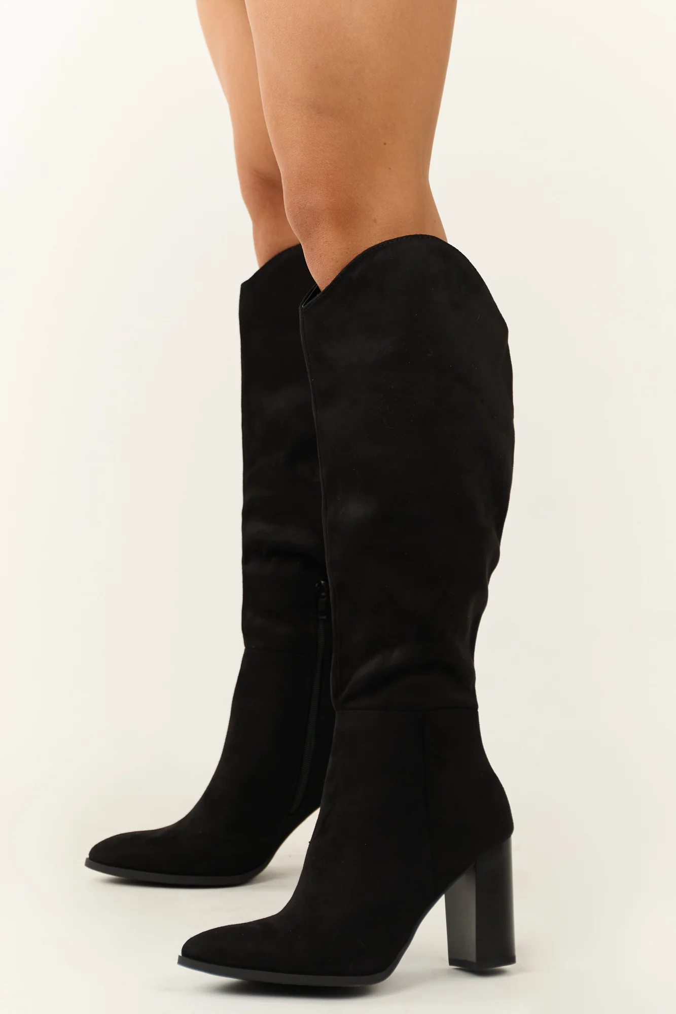 Step up your style with these womens knee-high boots in elegant black faux suede. Featuring a side zipper, pointed closed toe, and a comfortable 3.5″ block heel, these imported boots boast an 18″ shaft and 16″ circumference for a perfect fit every time. Elevate your winter wardrobe with these timeless classics , ideal for day-to-night elegance.