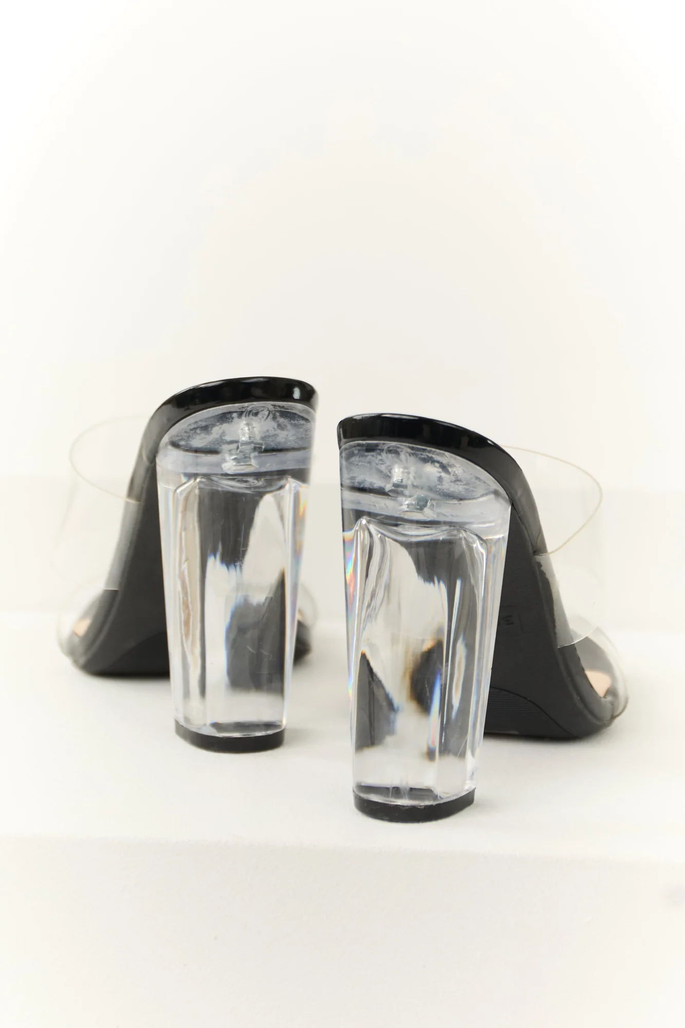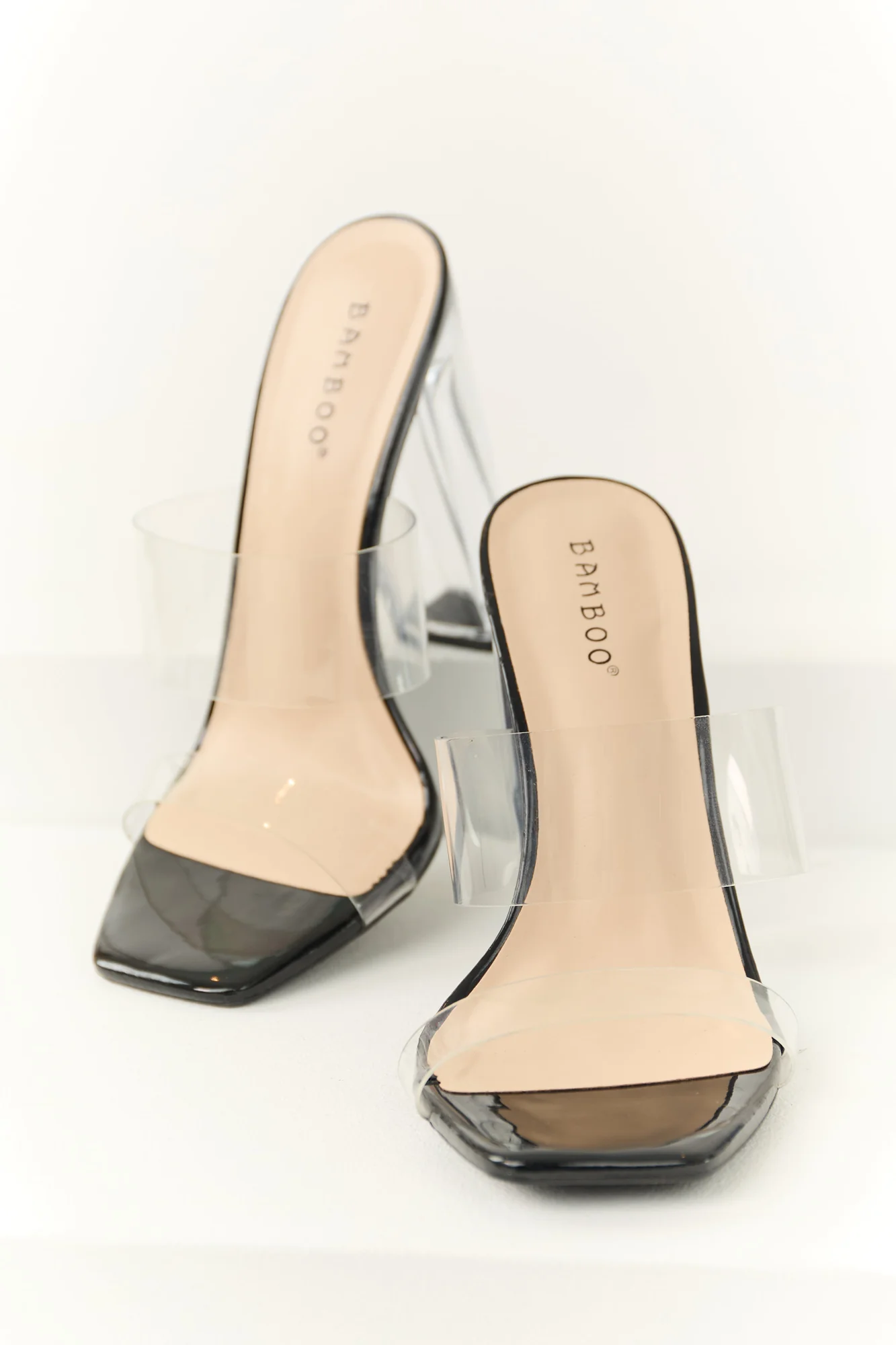 Step out in style with these womens black patent leather sandals featuring a trendy clear block heel design. Made with shiny patent leather, clear toe covers, and square toe shape. Designed with a clear vamp, two straps, and a comfortable rubber sole. Heel height: 4.75 inches. Shaft height: 3.5 inches. Circumference: 9.5 inches. Imported. Available in sizes 5.5 to 10.