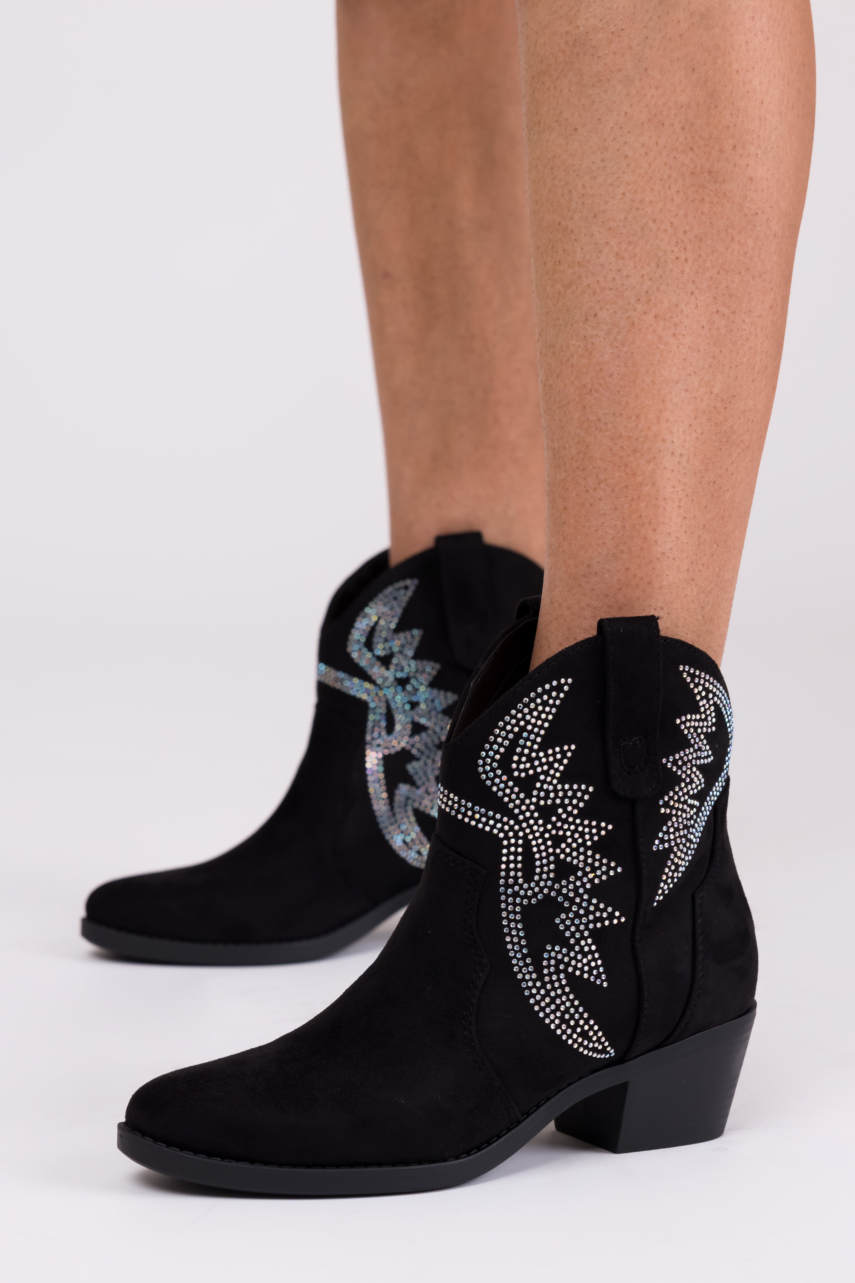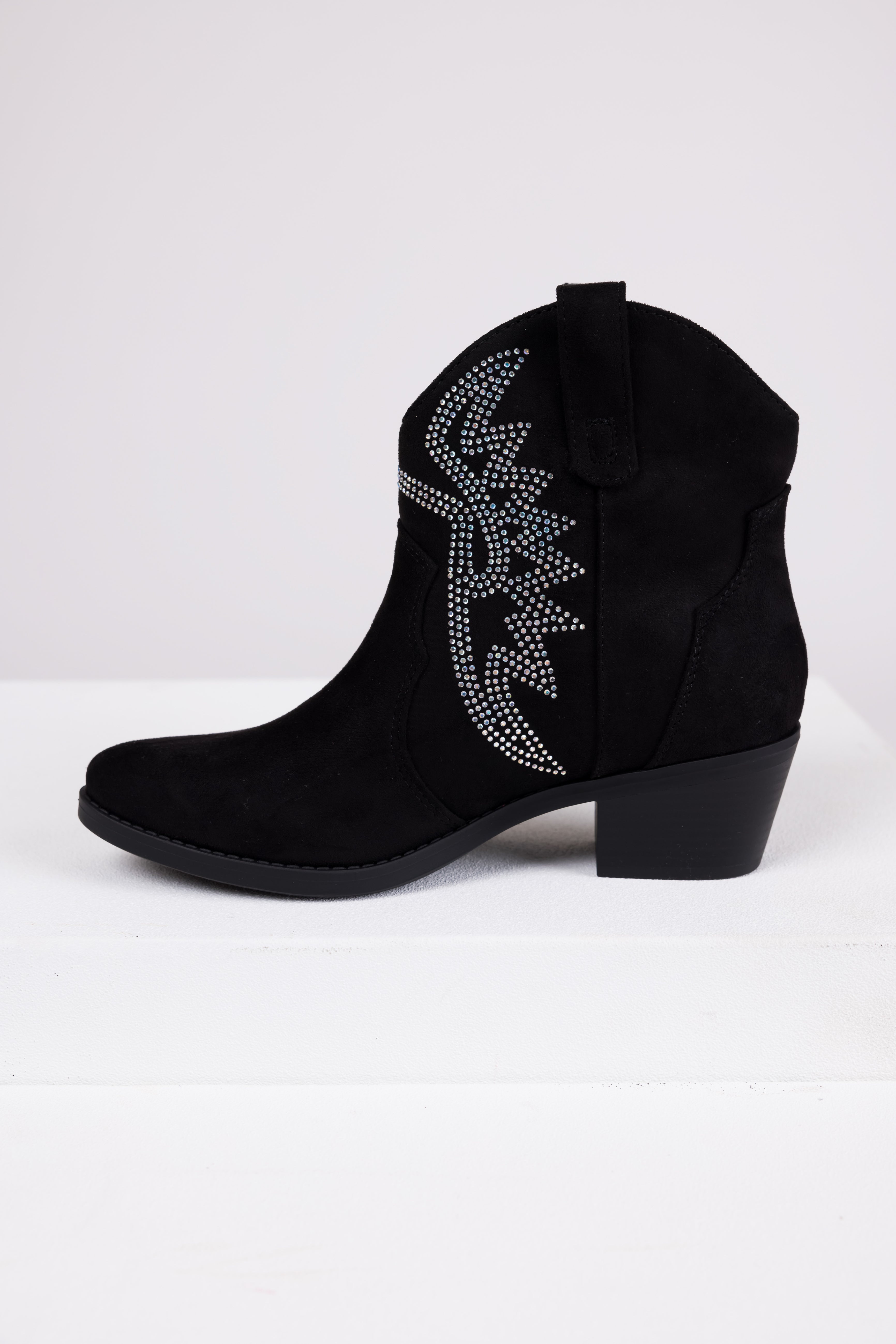 Step out in style with these womens black western ankle boots designed with faux suede, pull-on side handles, pointed toes, a stacked block heel, and a shaft height of 7 inches. The circumference is 12.5 inches, and the heel height is 2 inches. Imported. Available in various sizes.