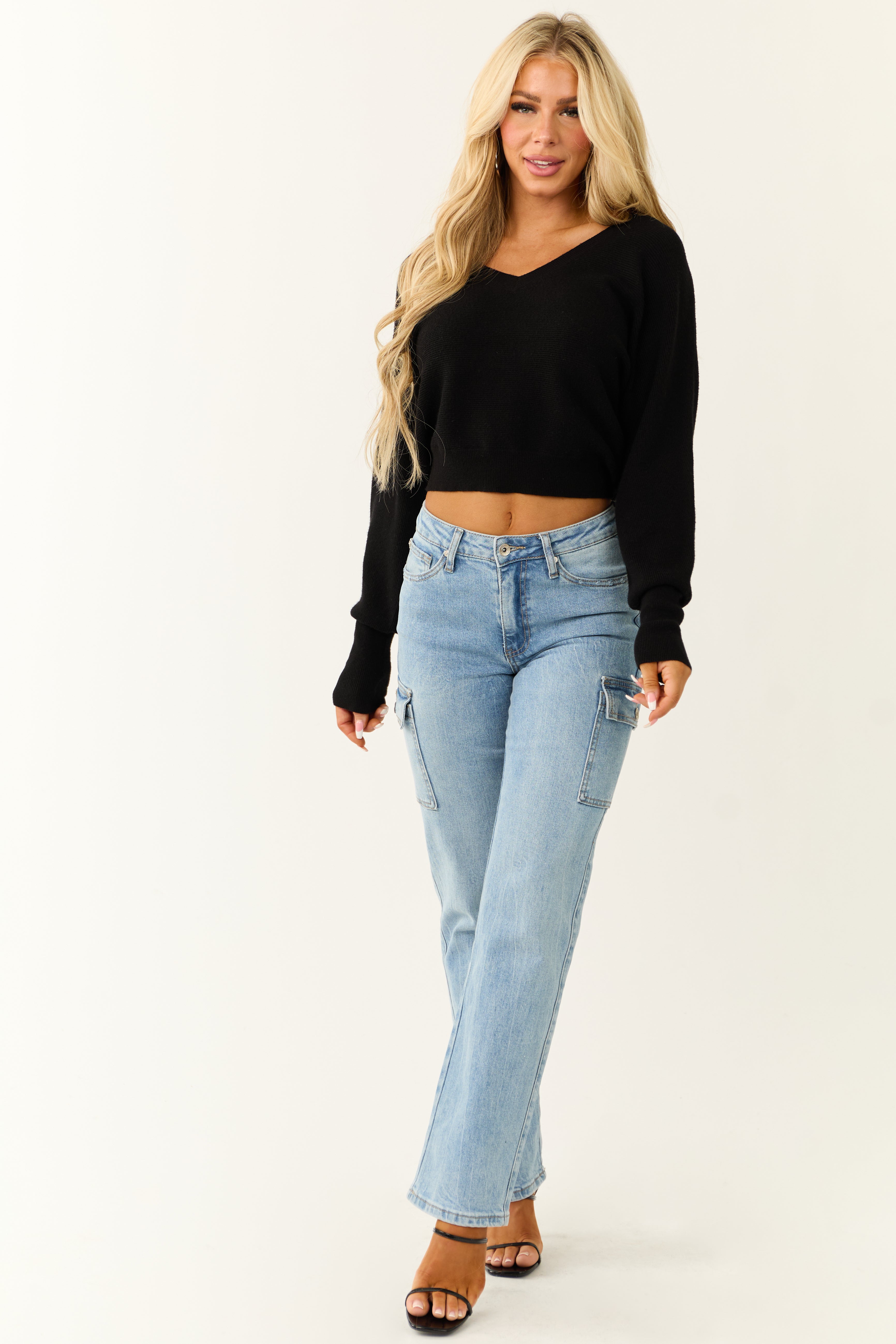 Indulge in comfort and style with our Black Ribbed Knit V-Neck Sweater. Crafted from a blend of Rayon, Polyester, and Nylon, this sweater features long puff sleeves, a flattering V neckline, and ribbed trim for added detail. The stretchy ribbed knit ensures a perfect fit for sizes S, M, and L. Whether you wear it casually or for daytime outings, this mid-length sweater will elevate your outfit effortlessly. Care Instructions: Hand wash with cold water, dry flat, do not bleach, and do not iron. Model is wearing a size Small – Size: 1, Height: 57″, Bust: 34″, Waist: 26″.