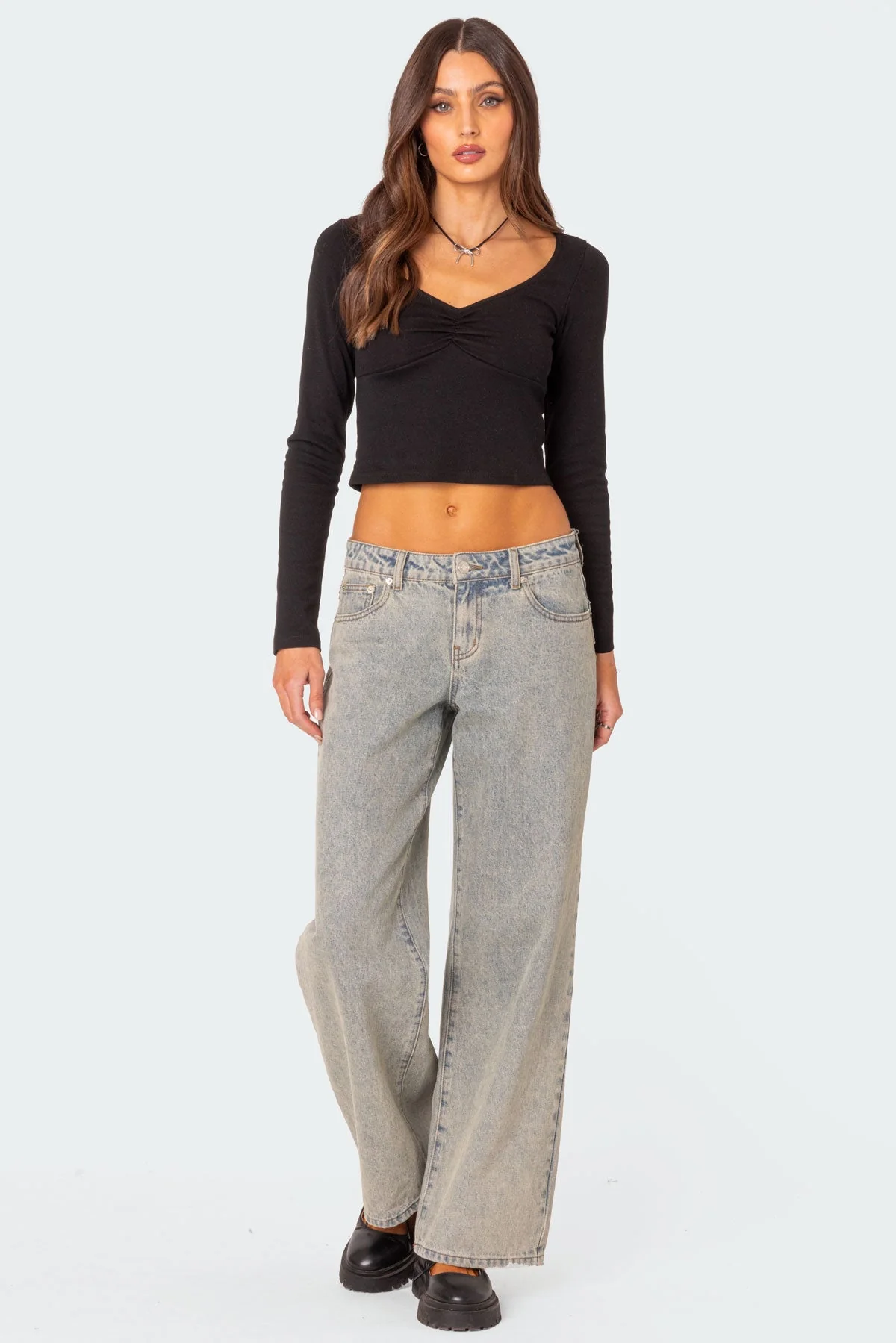 This womens black long sleeve top features a flattering V-neckline with stylish center ruching. Made of polyester and cotton for comfort and durability. Perfect for casual wear or dressing up. Machine washable. Available in sizes XS to XL.