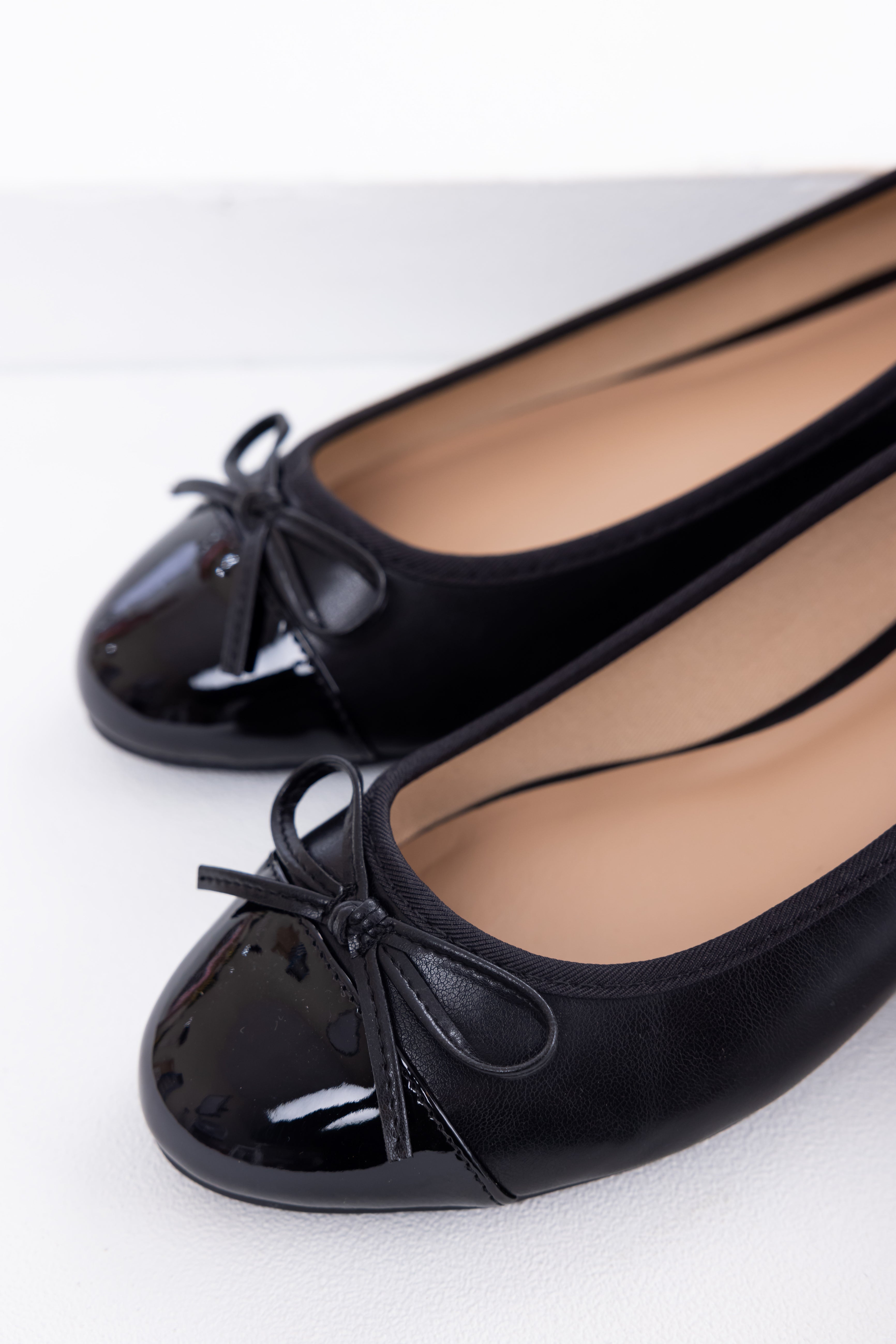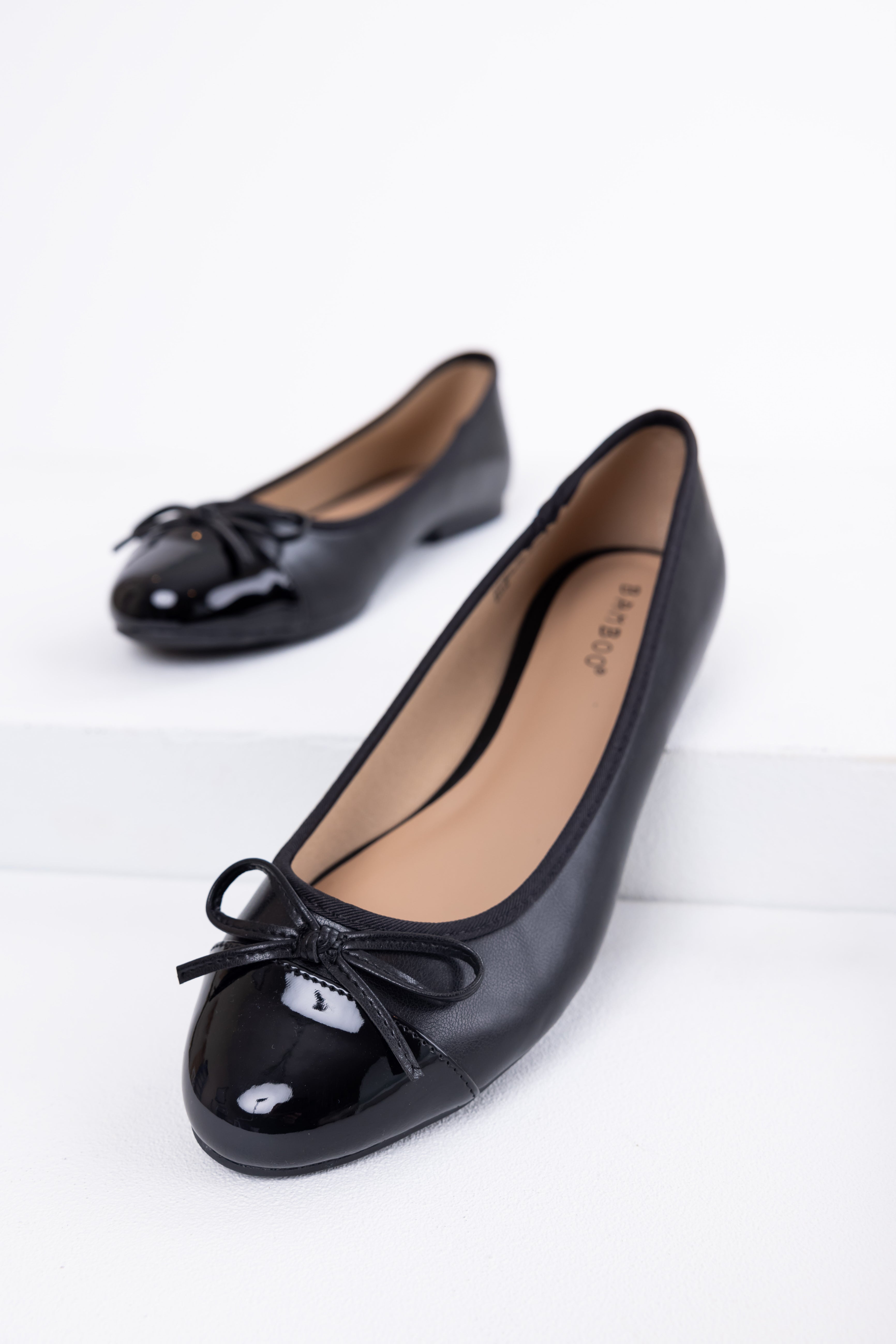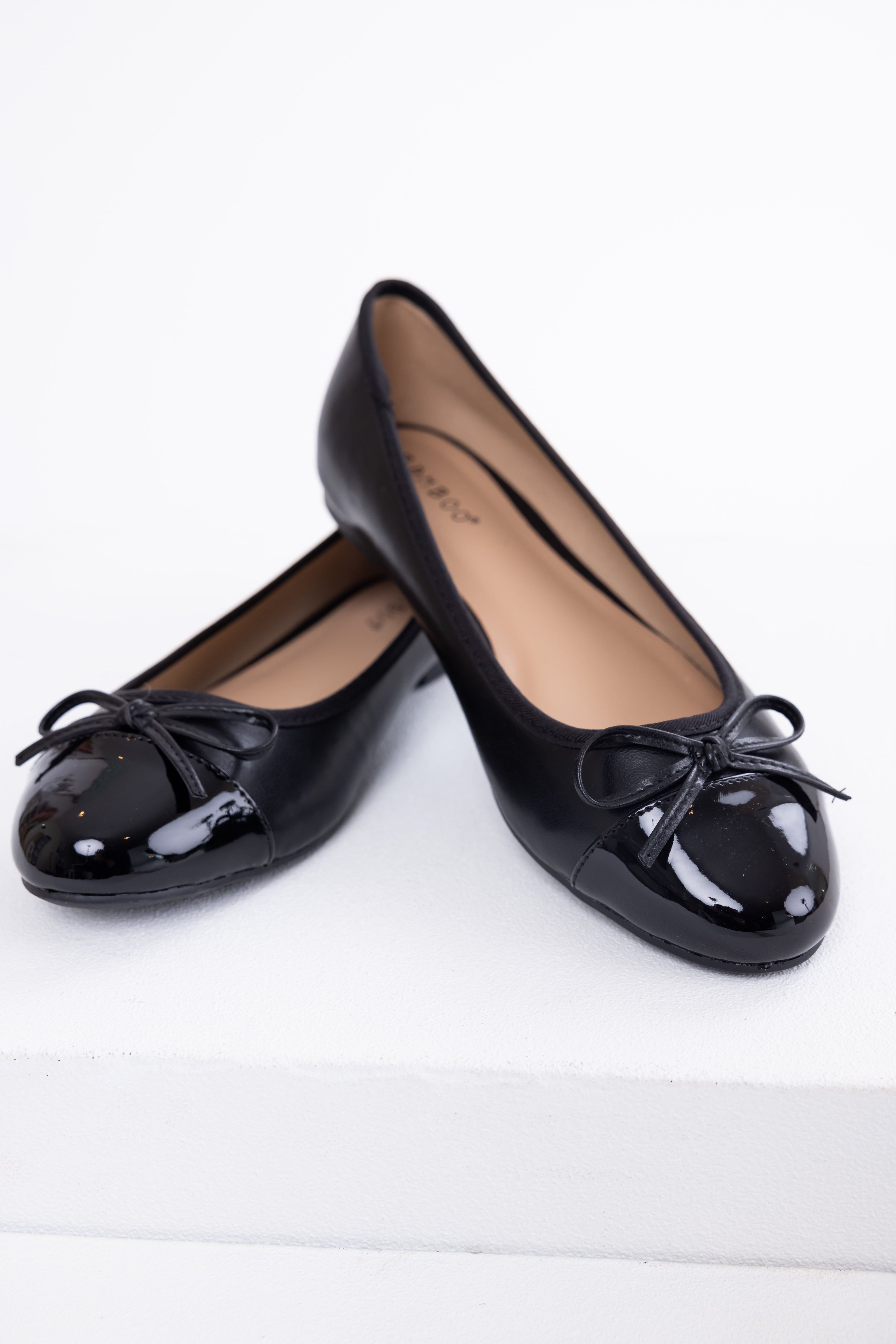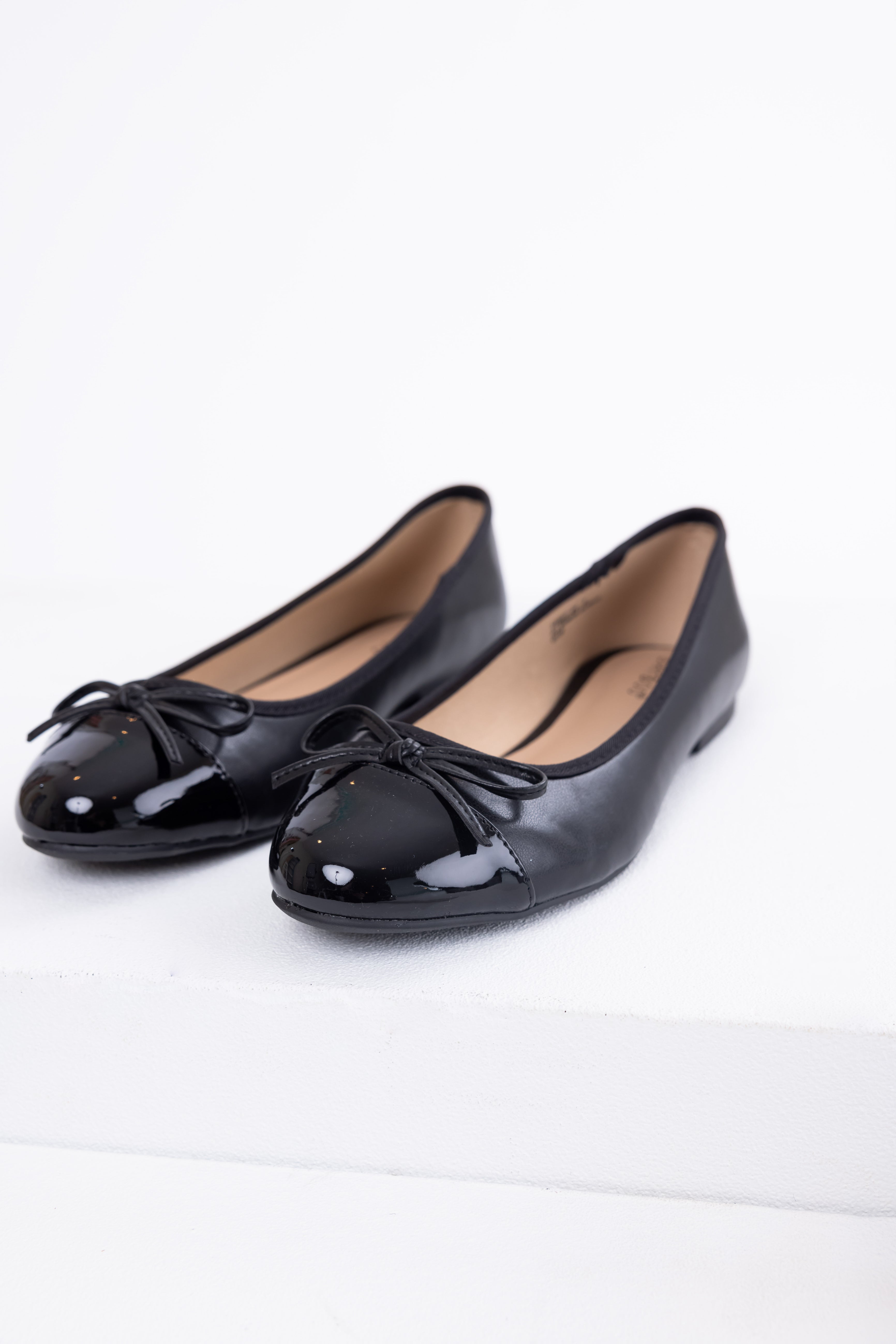 Step into style and comfort with these womens black shiny ballerina flats. Crafted from faux leather with a shiny patent toe and a charming bow detail, these shoes feature a rubber sole for durability. The circumference measures 18.5 inches, based on a size 8 measurement. Perfect for casual daytime wear during spring and summer.