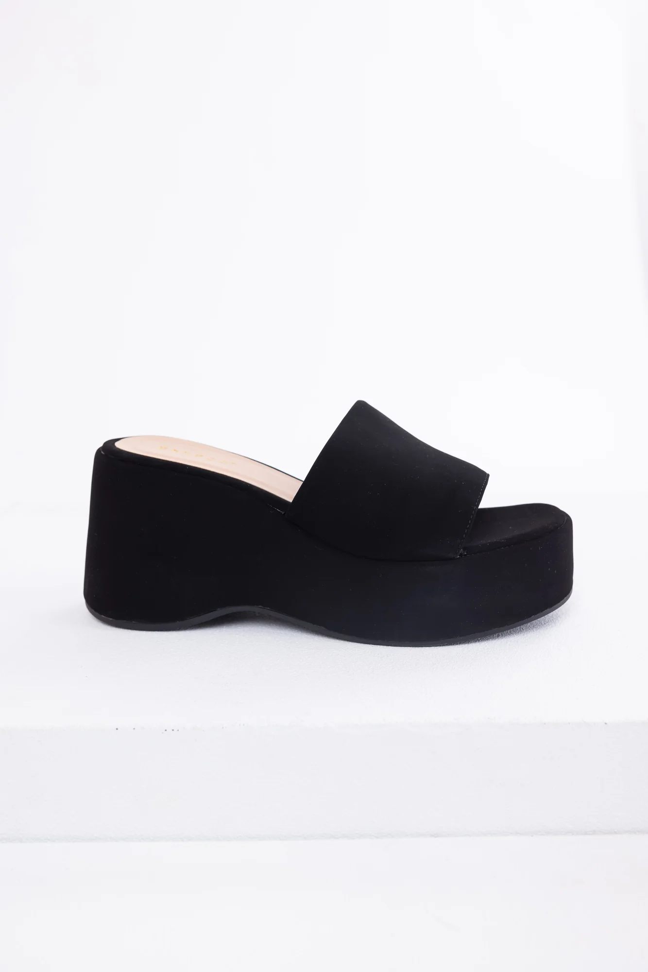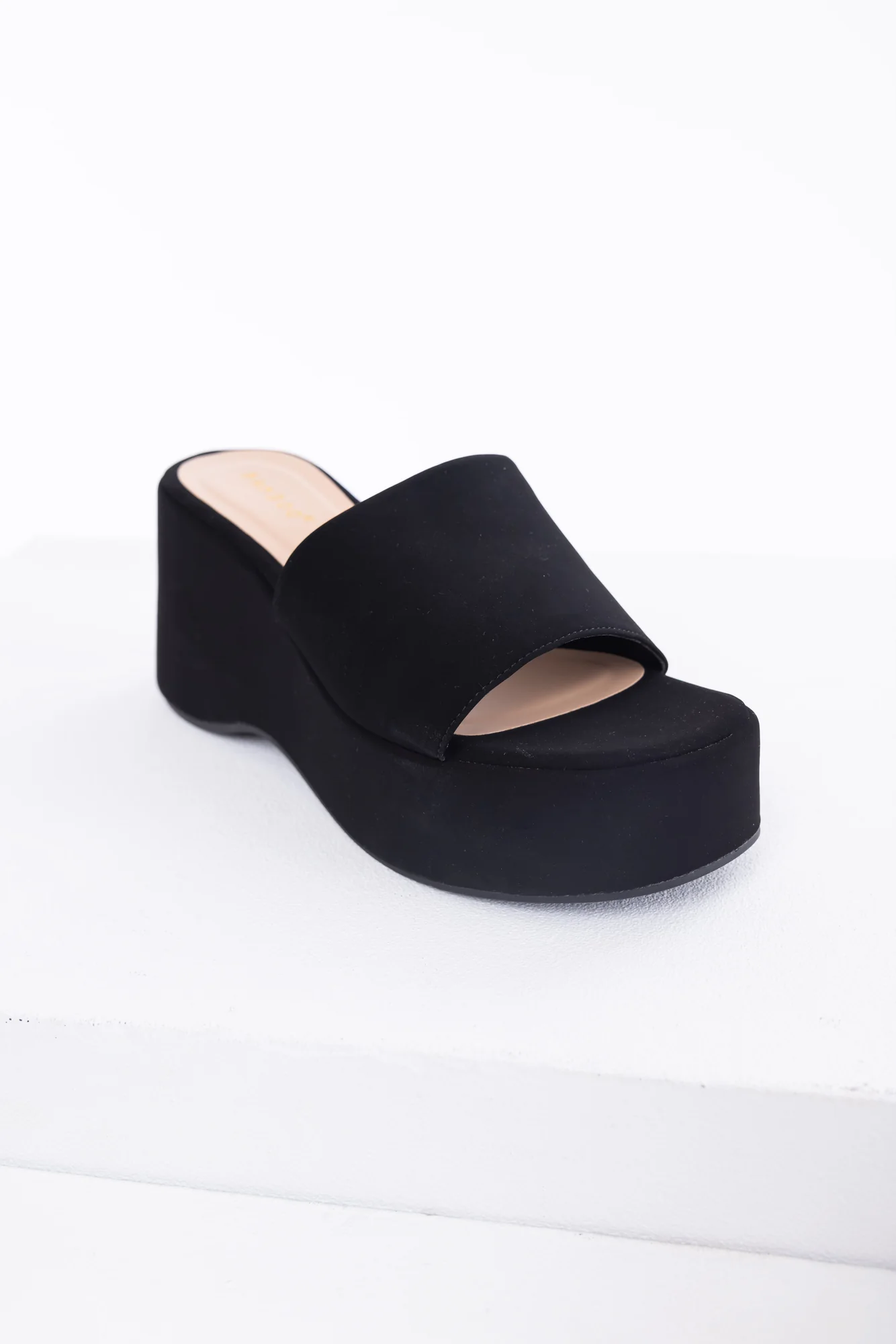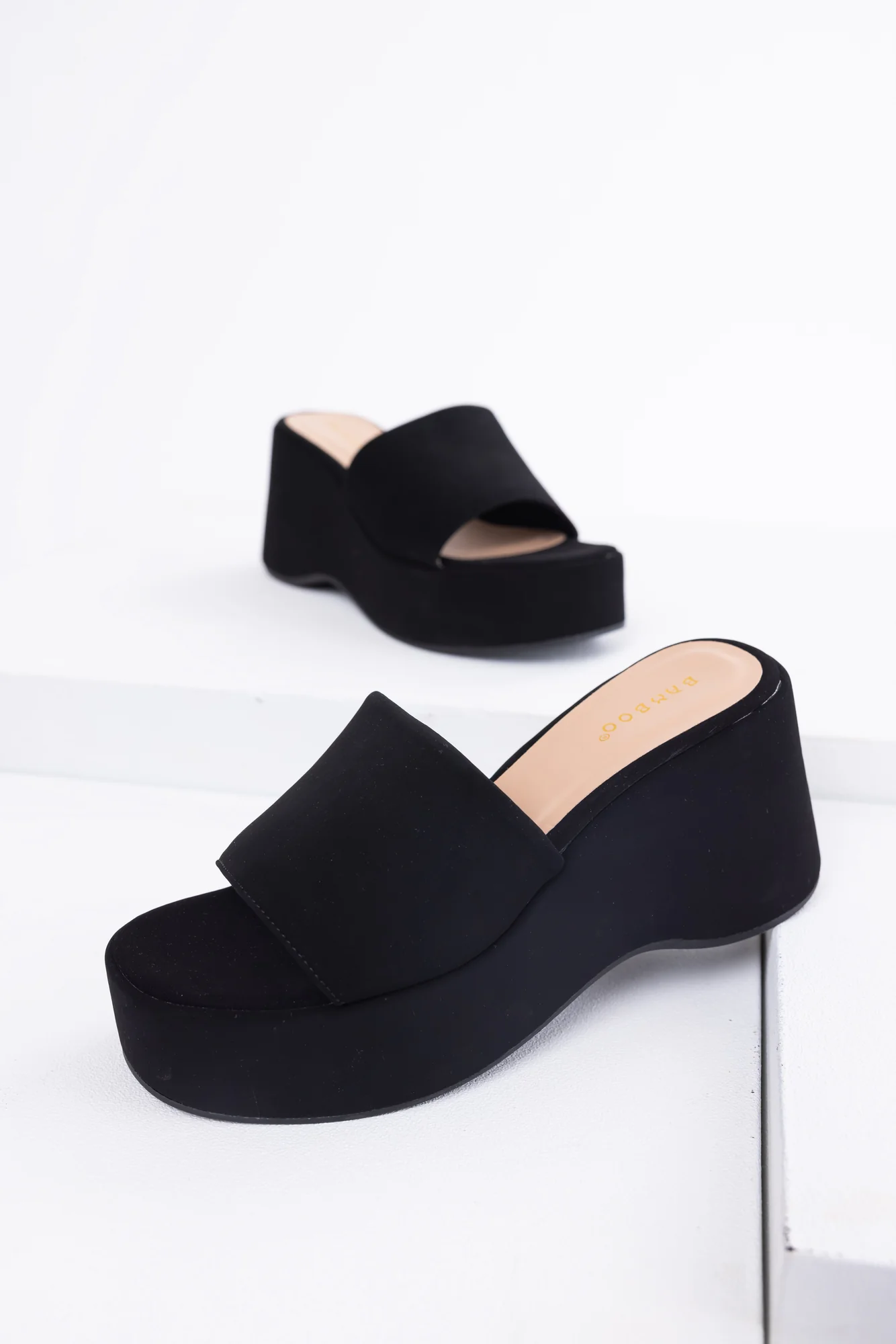 Enhance your casual and daytime style with these womens black suede platform wedge sandals. Crafted from nubuck suede, they feature an open toe, rounded toe, slip-on design, wide single band, and adjustable ankle strap. The platform height is 1.5 inches providing comfort with a 3.25-inch heel. The strap length is 3 inches with a circumference of 9 inches, making them a fashionable choice for various occasions. Imported product available in sizes 5.5 to 10.