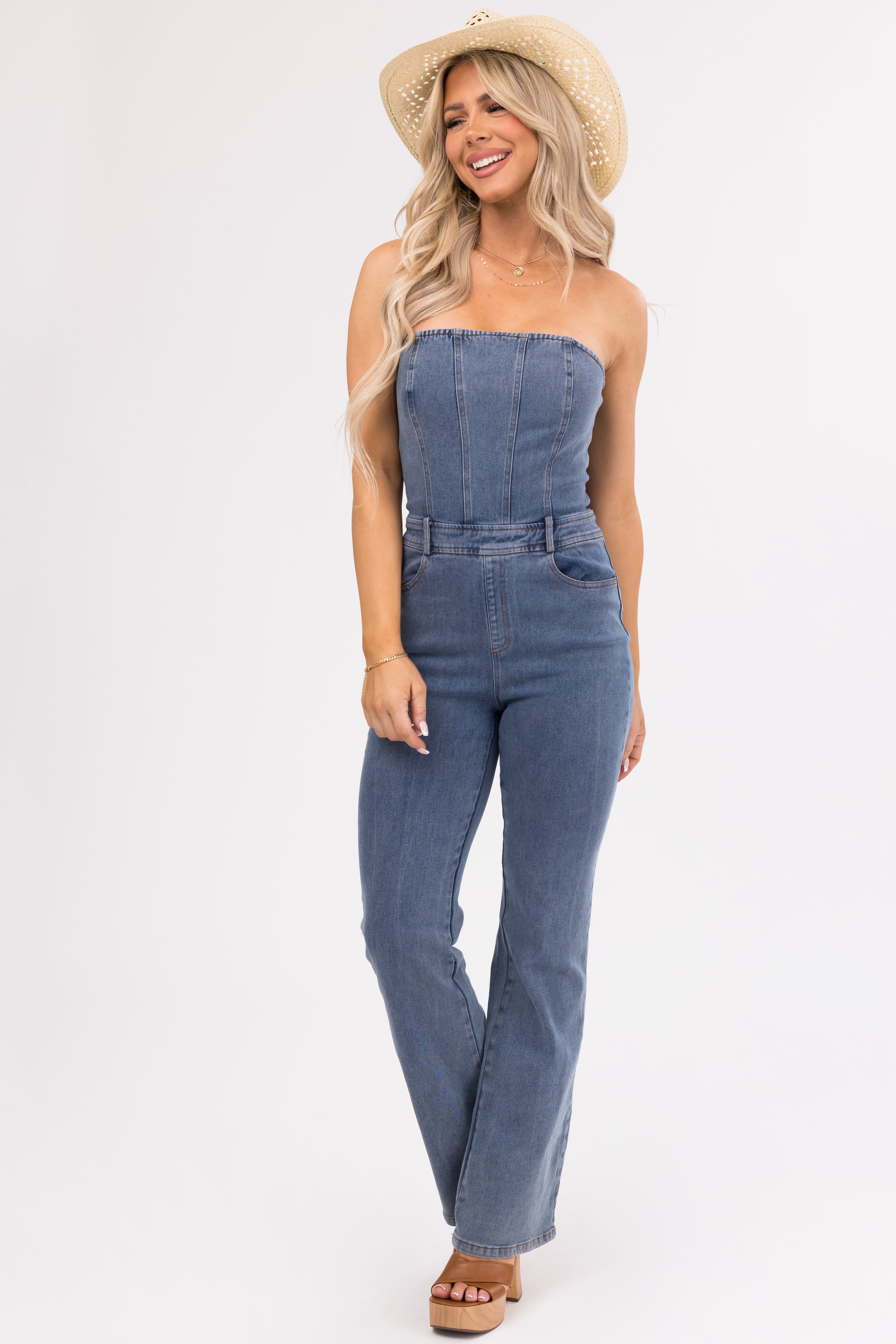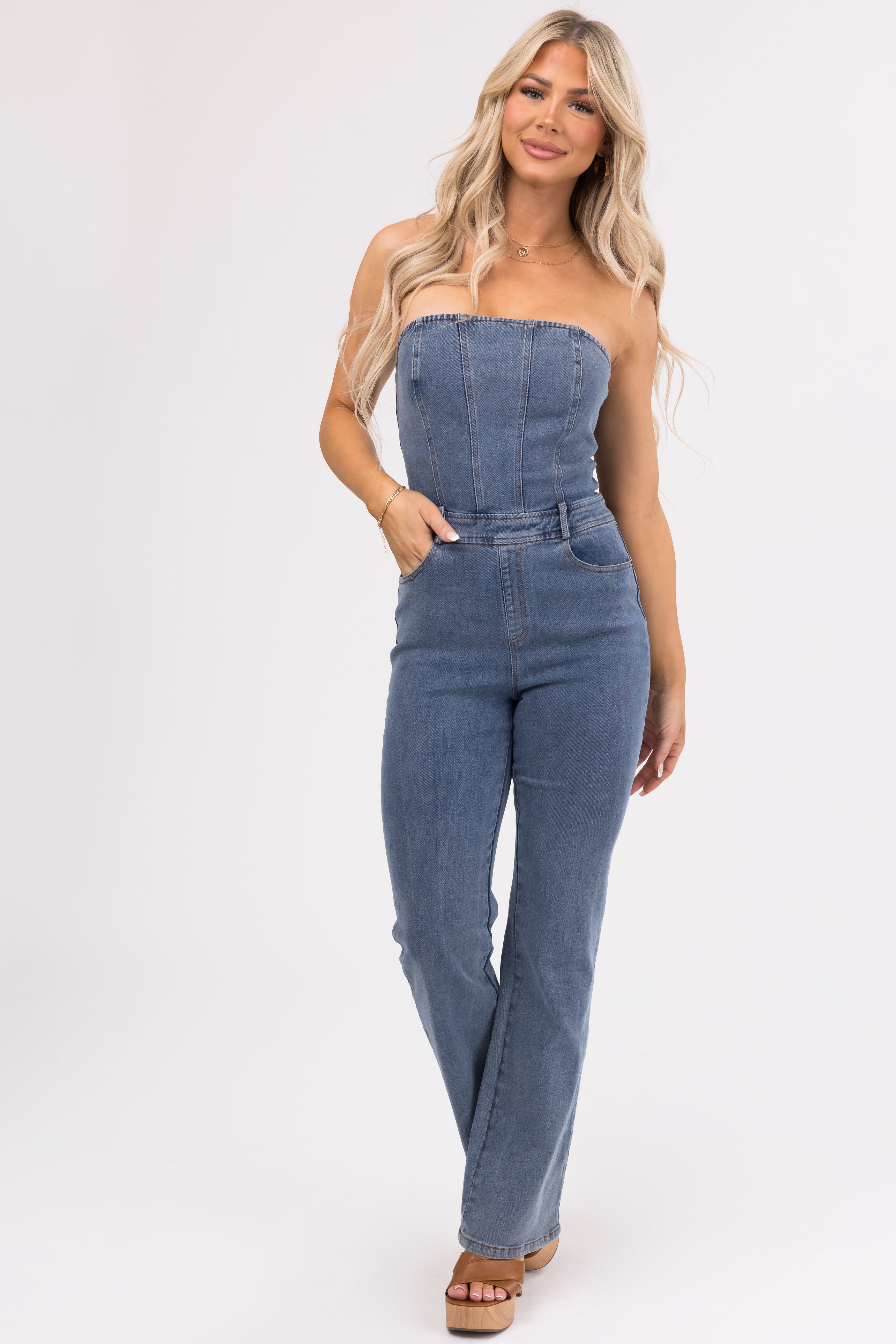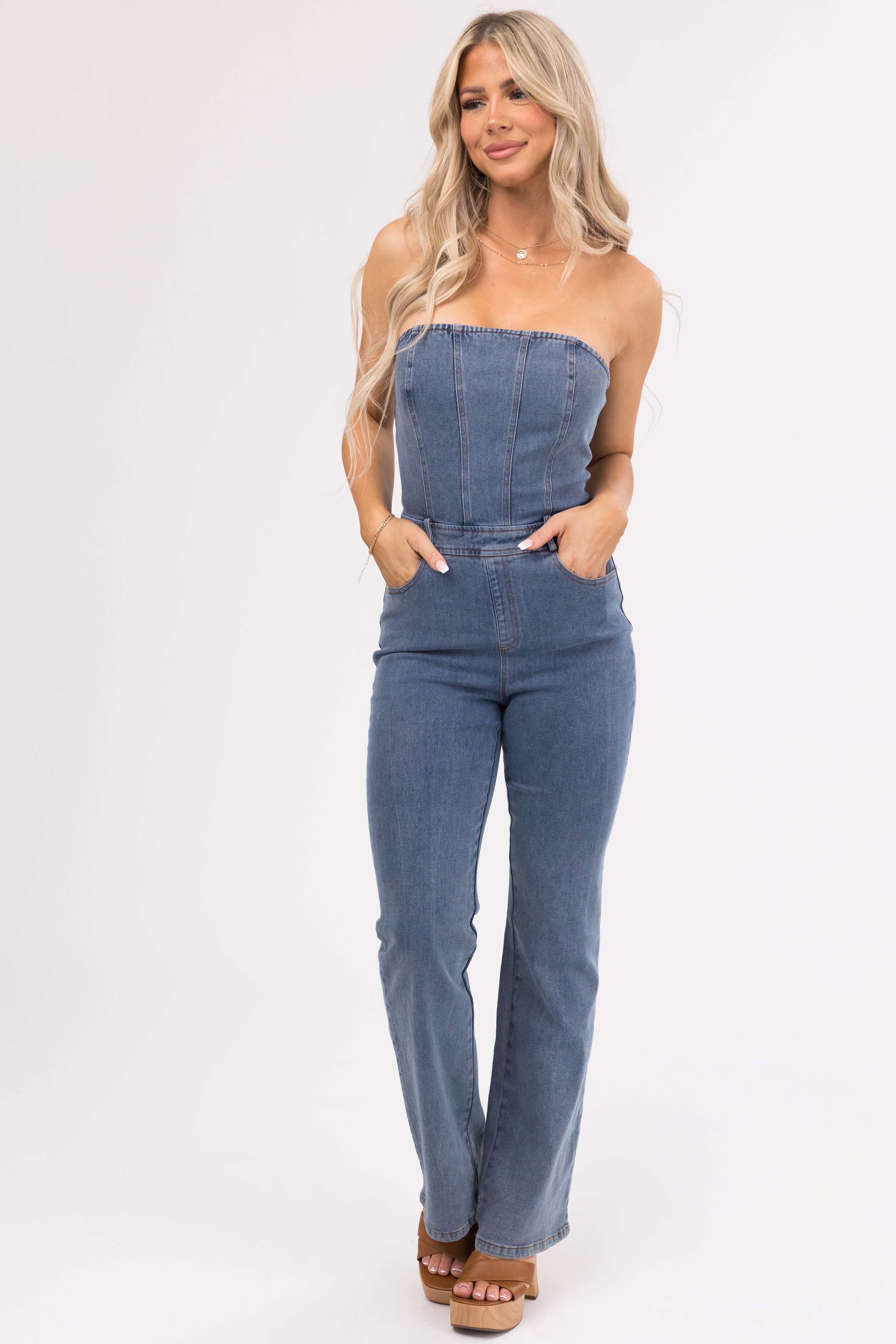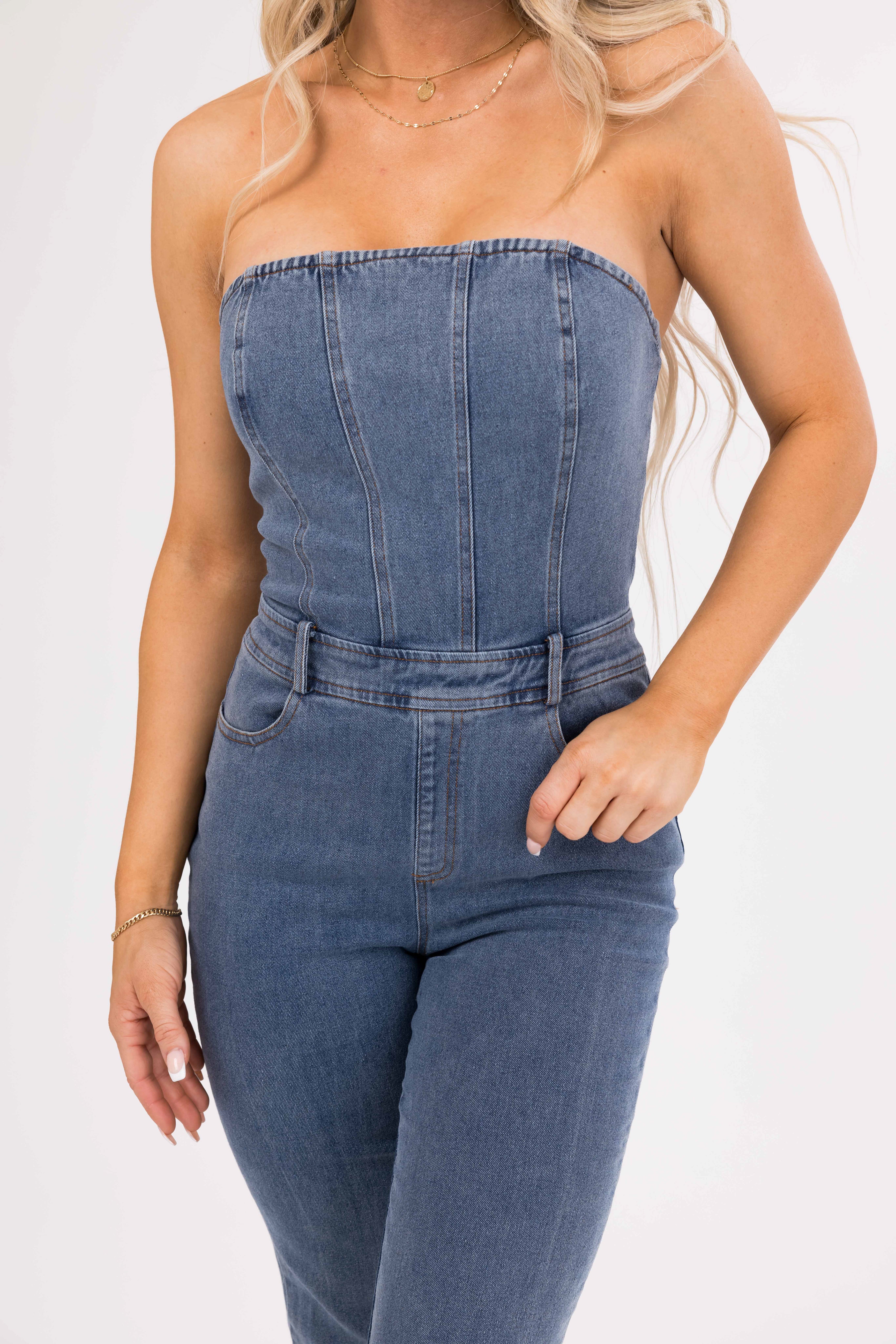 Stay stylish with our Denim Strapless Jumpsuit! Made from comfortable fabric blend with semi-stretchy denim for a perfect fit. Features a belted waist, back zipper, hook and eye closure, and four functional pockets. This jumpsuit is perfect for daytime occasions. Care instructions: Hand wash cold, wash colors separately, do not bleach, flat dry, cool iron if necessary. Available in sizes XS, S, M, and L. Model is wearing size XS. She is 57″ tall with a 34″ bust and 26″ waist.