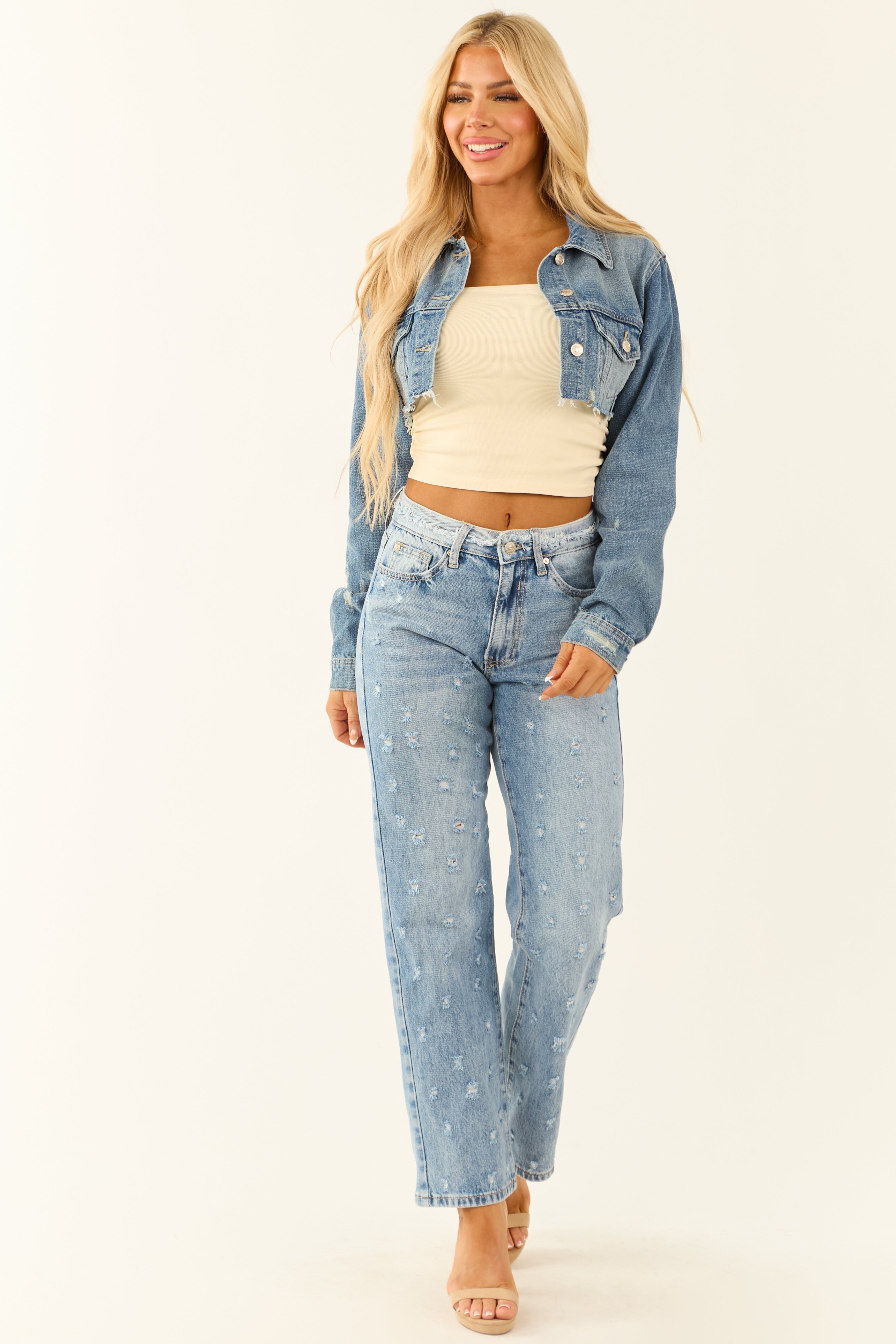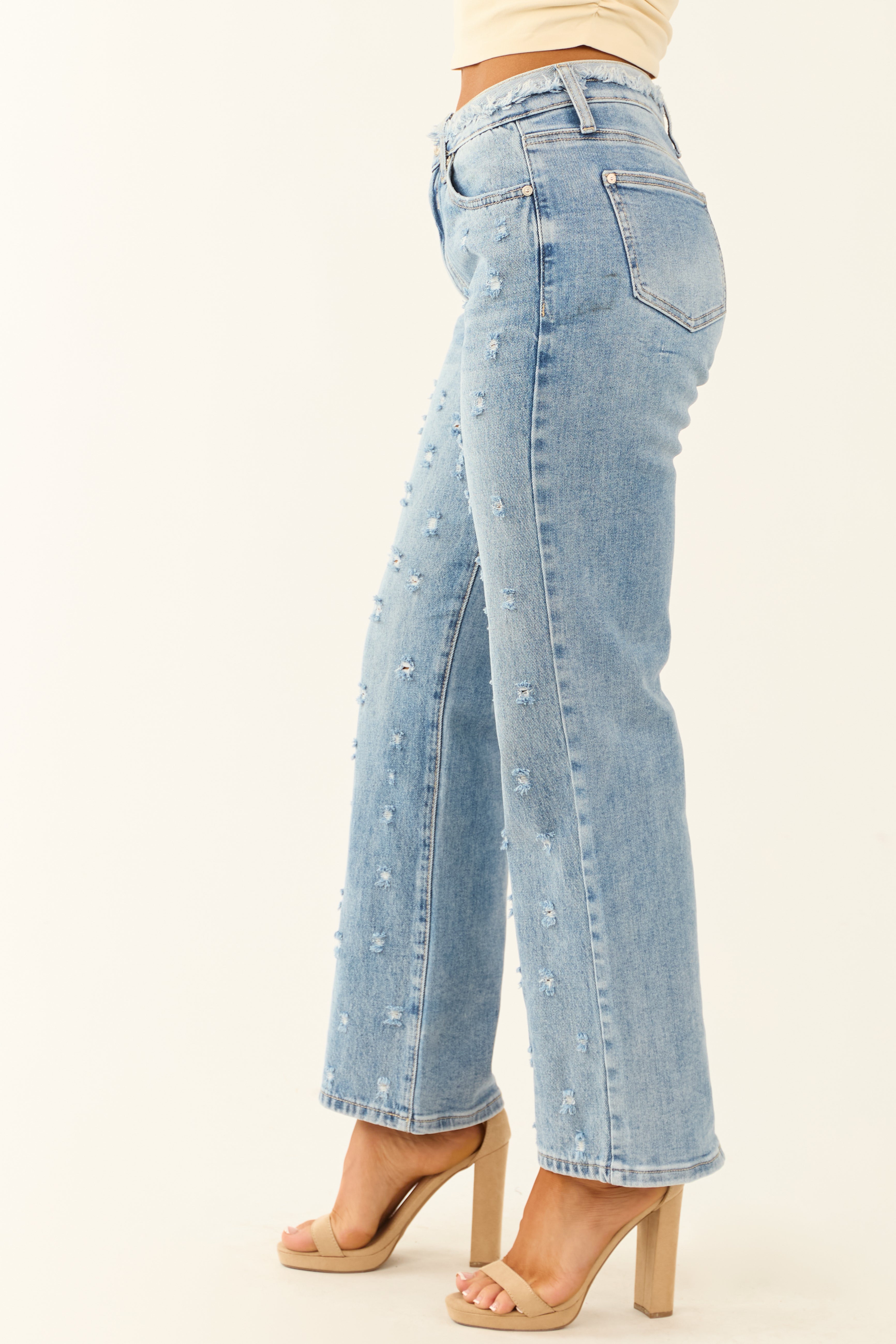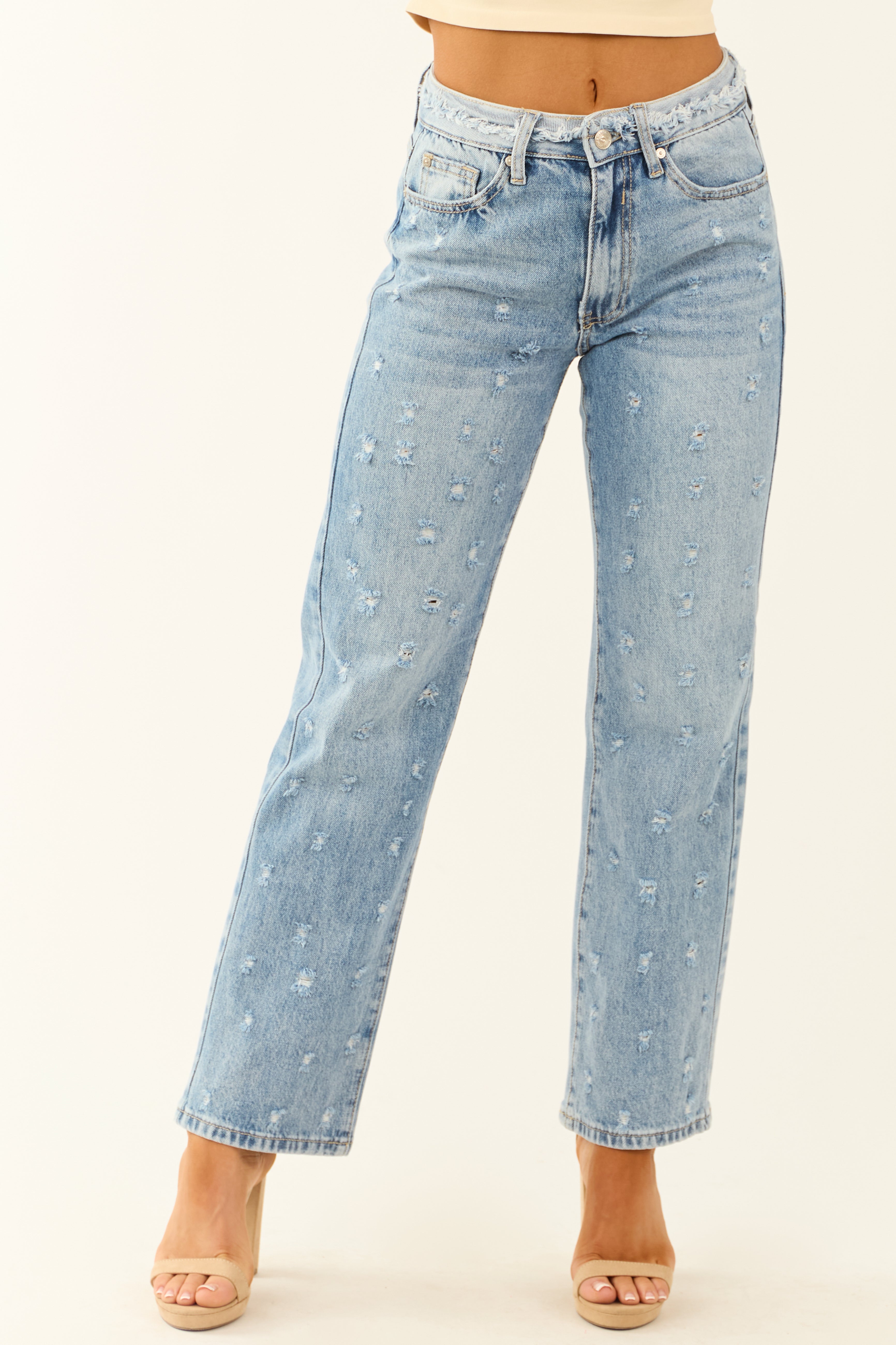 Experience the perfect blend of style and comfort with our Womens Distressed Medium Wash Straight Leg Jeans. Made from a stretchy denim blend for a flattering fit, these jeans feature all-over distressing, a high rise design, frayed waistline, and 5 functional pockets. The fabric composition includes 95% Cotton and 5% Polyester for durability and comfort. Whether for a casual day out or a chic evening look, these jeans are a versatile wardrobe essential that youll love wearing. Order yours today!