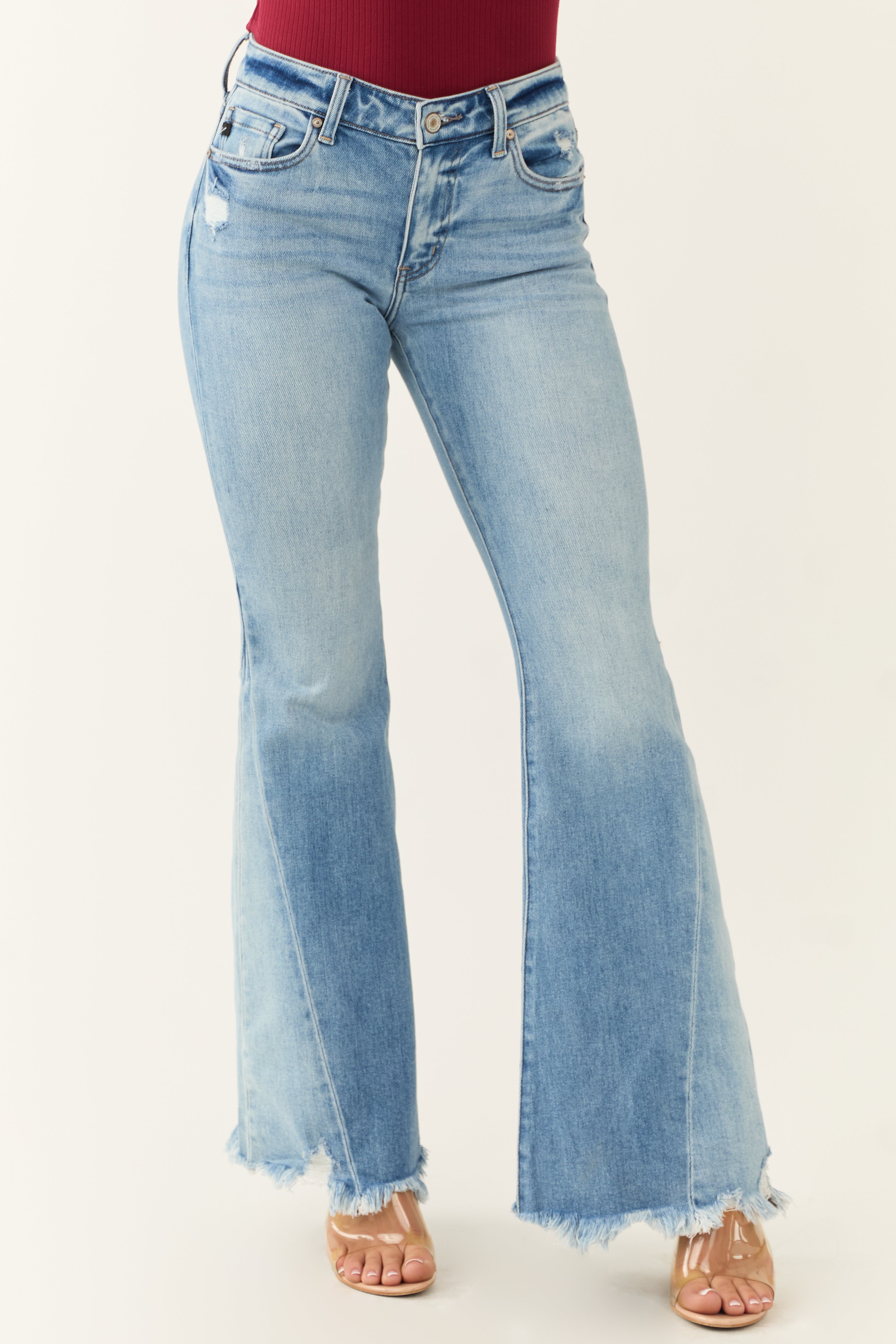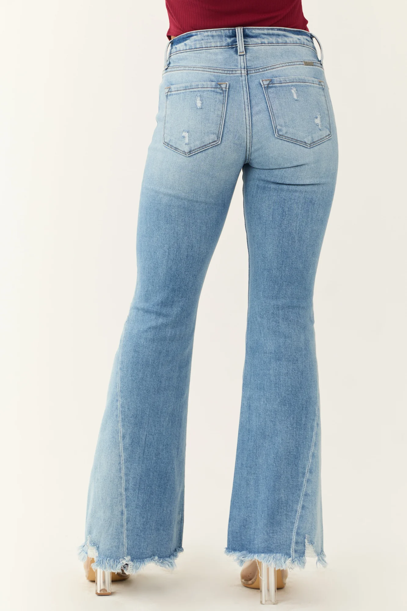 Experience comfort and style in these womens flare jeans . With a flattering mid-rise fit, stretchy denim material, and chic side flare seam details, these jeans are perfect for everyday wear. The distressed hem, functional pockets, and zipper with button fly closure add trendy touches. Made of 93% cotton, 5% polyester, and 2% spandex. Available in waist sizes 24″ to 32″. Machine wash cold with like colors, tumble dry low. Model is 57″ and wearing a size 1.