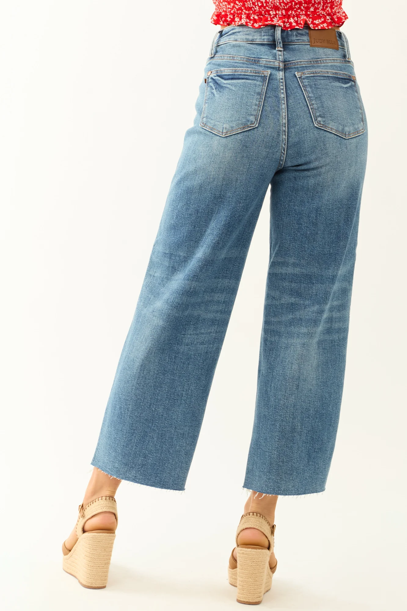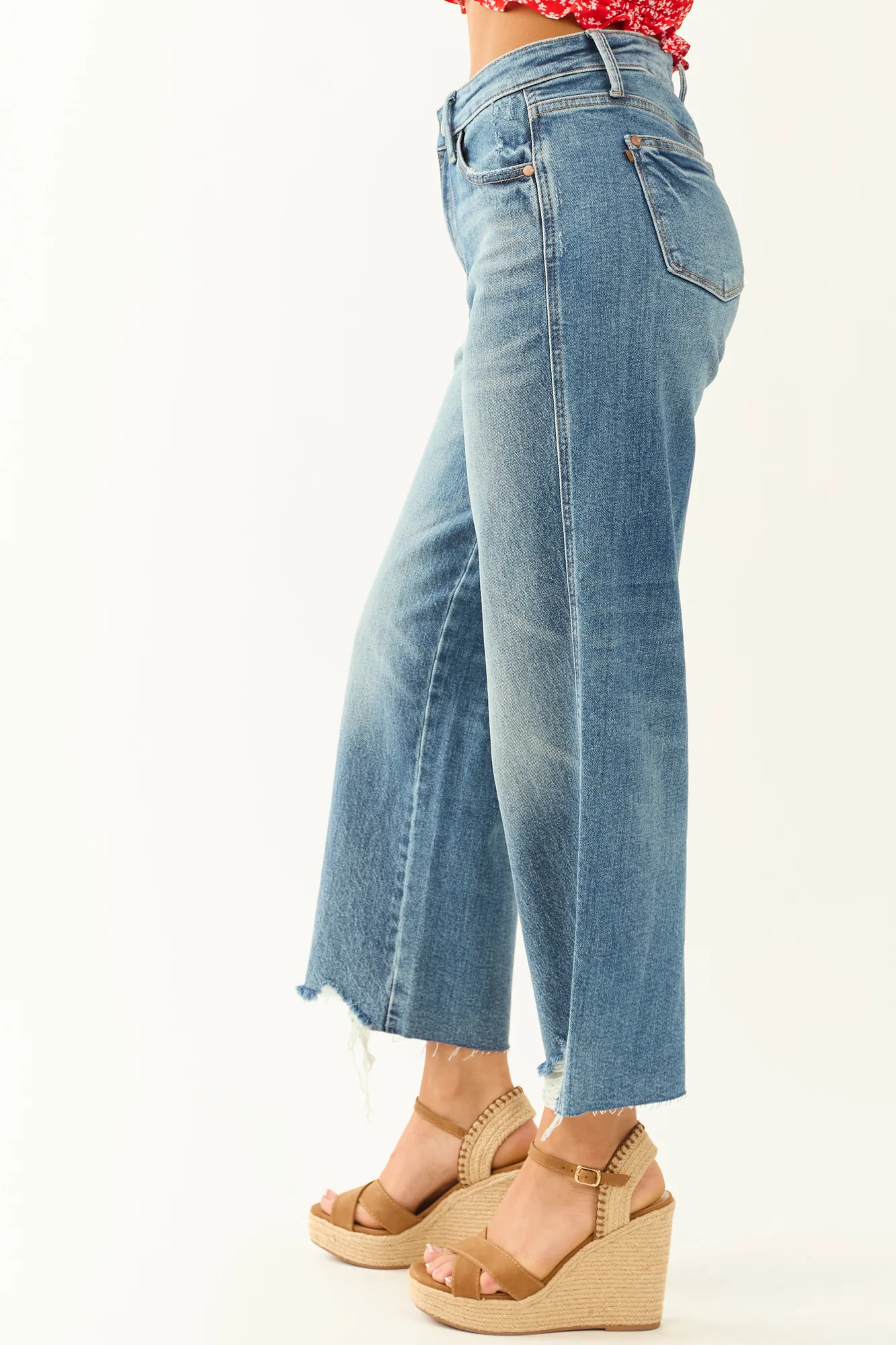 Elevate your style with the Womens Medium Wash Cropped Wide Leg Denim Jeans . Crafted with magic denim for comfort and stretch, these high-rise jeans feature a flattering fit with a distressed front, 5 functional pockets, and a destroyed hem. The medium wash and whiskering add a trendy touch. Whether its for a casual day out or a laid-back evening, these jeans are a must-have in your wardrobe. Available in various sizes to perfectly fit your shape.