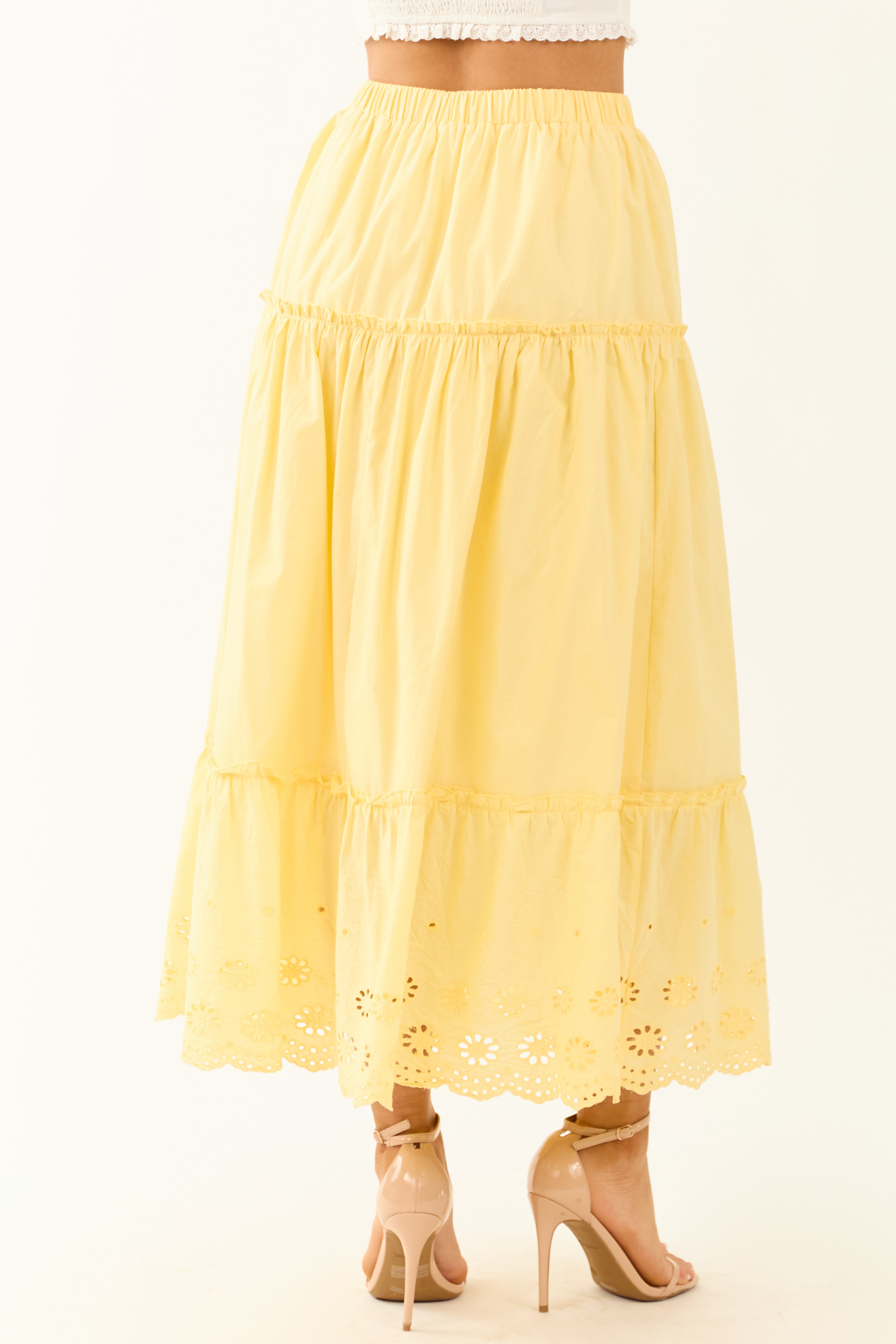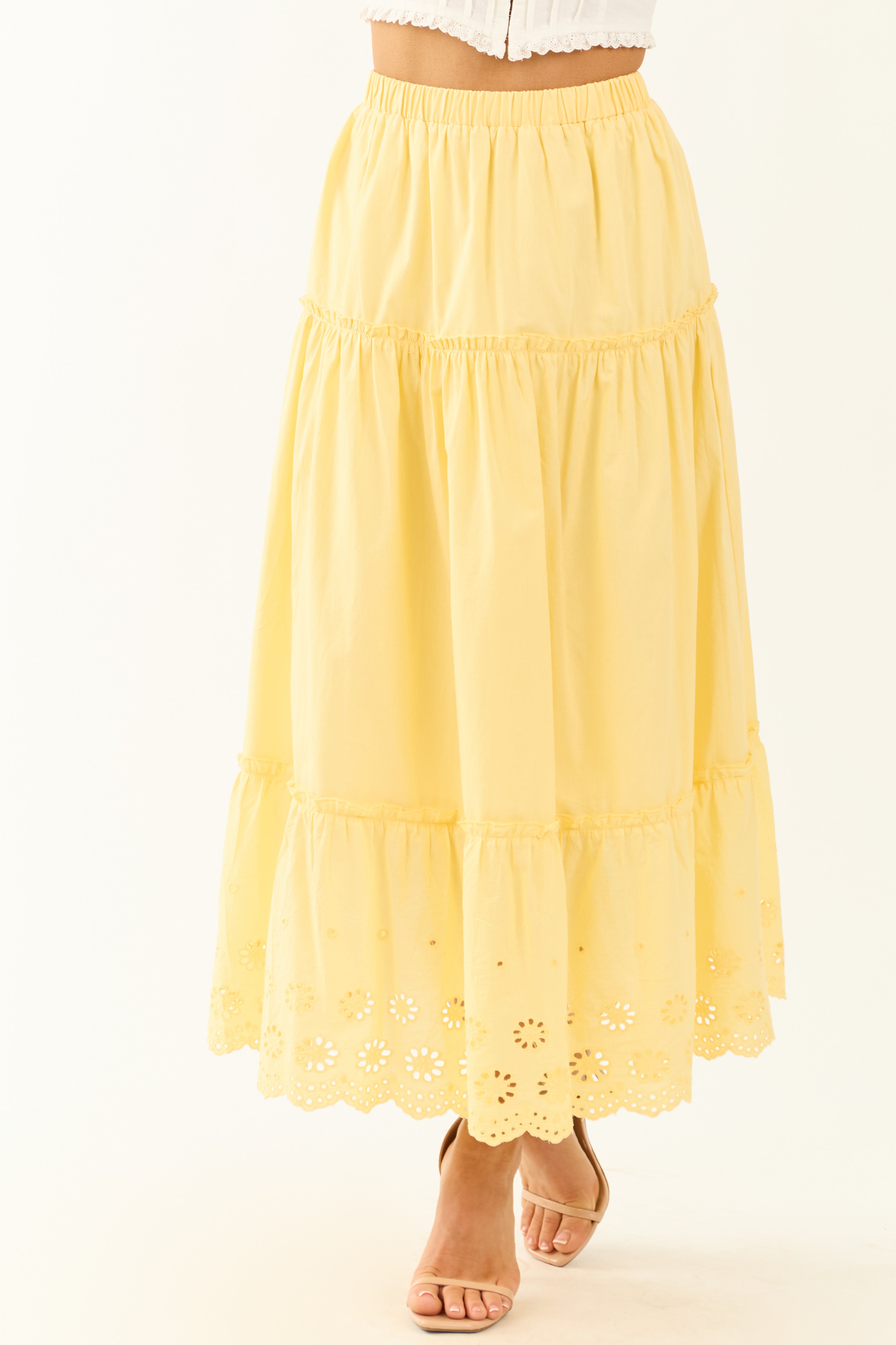 Indulge in feminine elegance with our Yellow Cotton Maxi Skirt featuring exquisite tiered frill detailing. Crafted from 100% Cotton, this skirt offers comfort with an elastic waistband allowing a perfect fit. The scalloped hem and lining add delicate charm to this non-stretchy woven skirt. Perfect for Spring and Summer, this imported skirt is a must-have staple for your wardrobe. Care Instructions: Hand wash with cold water, line dry, iron on low, and refrain from dry cleaning to maintain its quality and style. Model is wearing a size Small. Model’s Profile: Size 1, Height 57″, Bust 34″, Waist 26″.