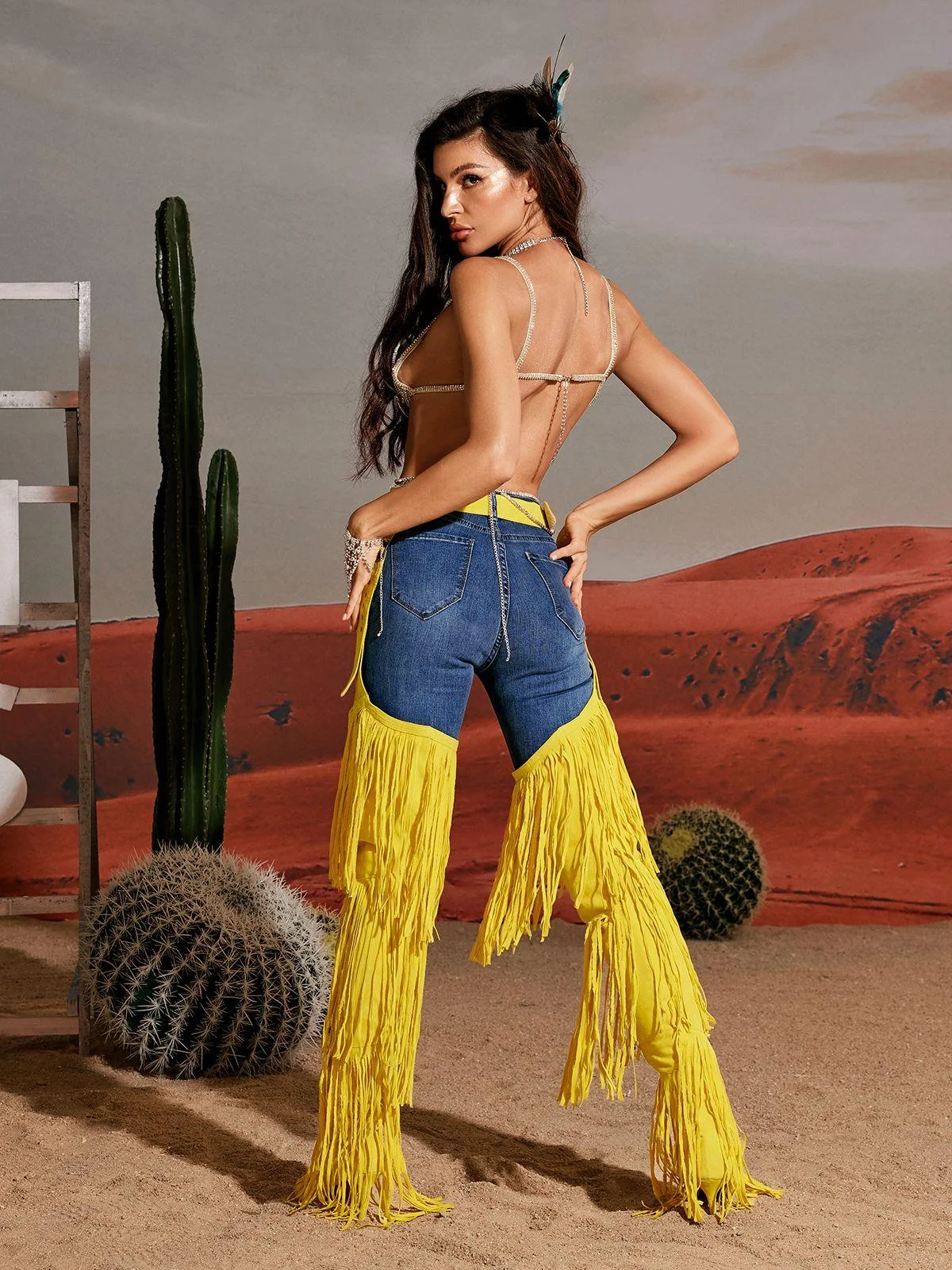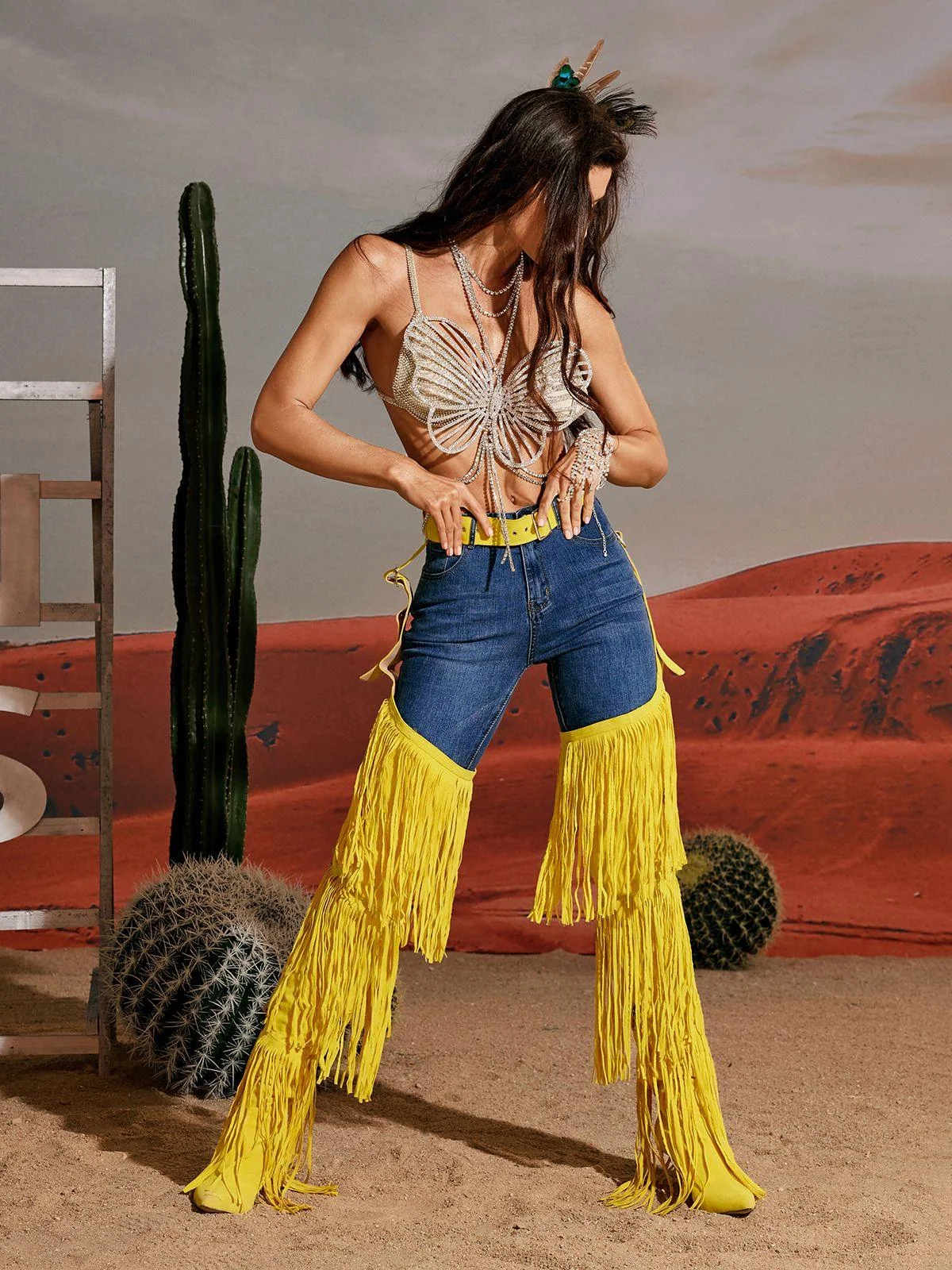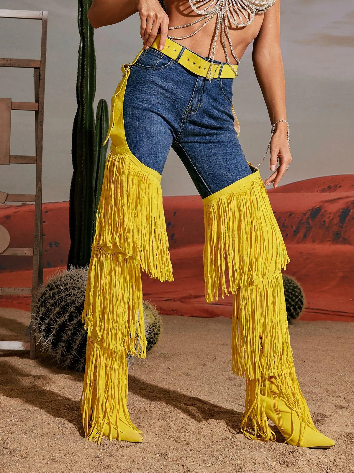 Elevate your fashion game with these Yellow Denim Fringe Boots. Crafted from unique denim material with playful fringe accents, these boots in sunny yellow add a vibrant touch to any outfit. The pointed toe and 10 cm heel make them both stylish and comfortable. Please note that the pants and boots are separate pieces, not attached.