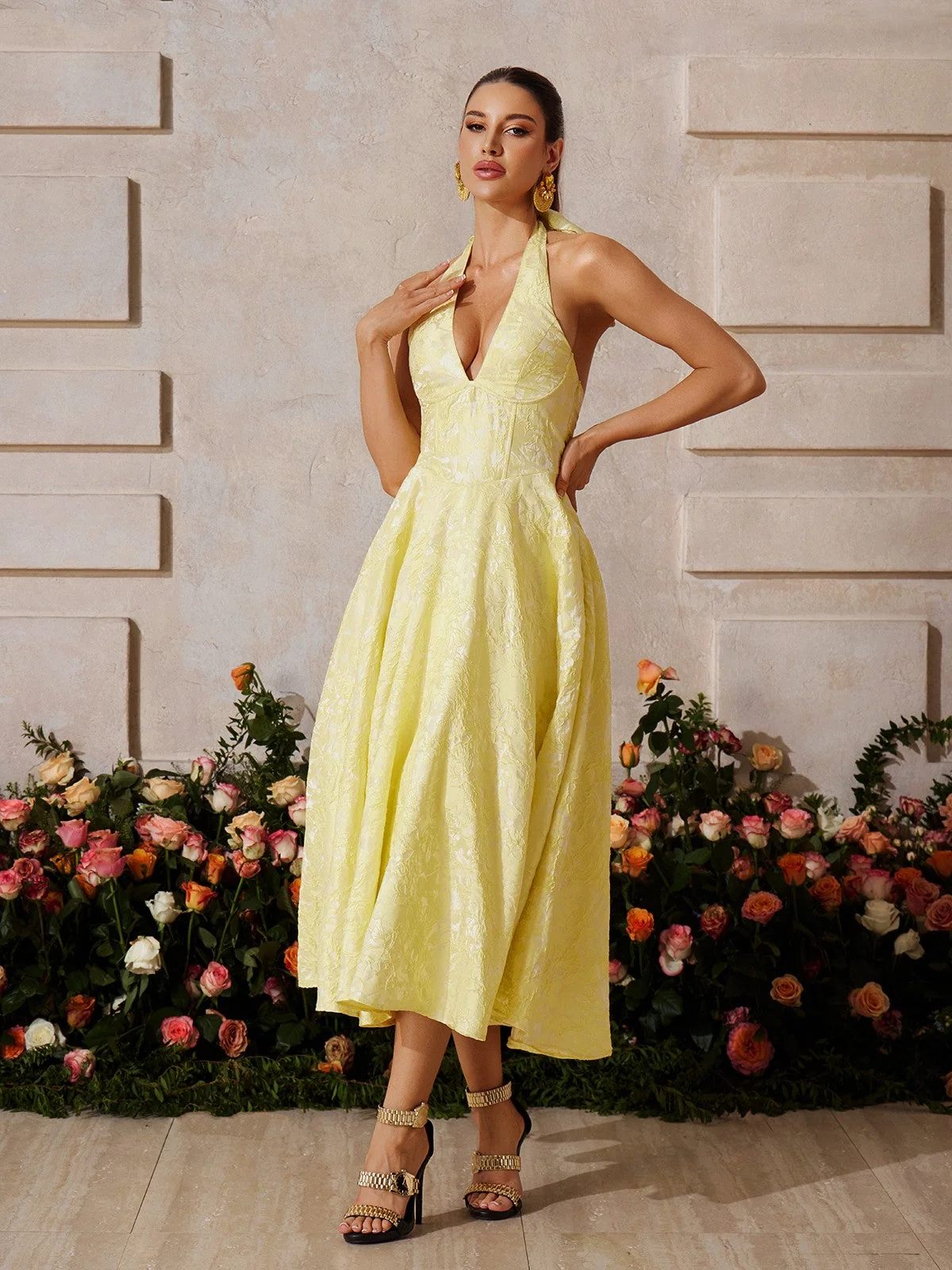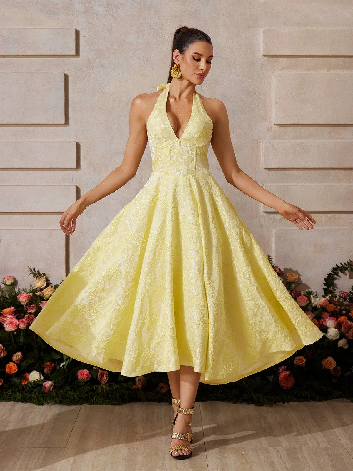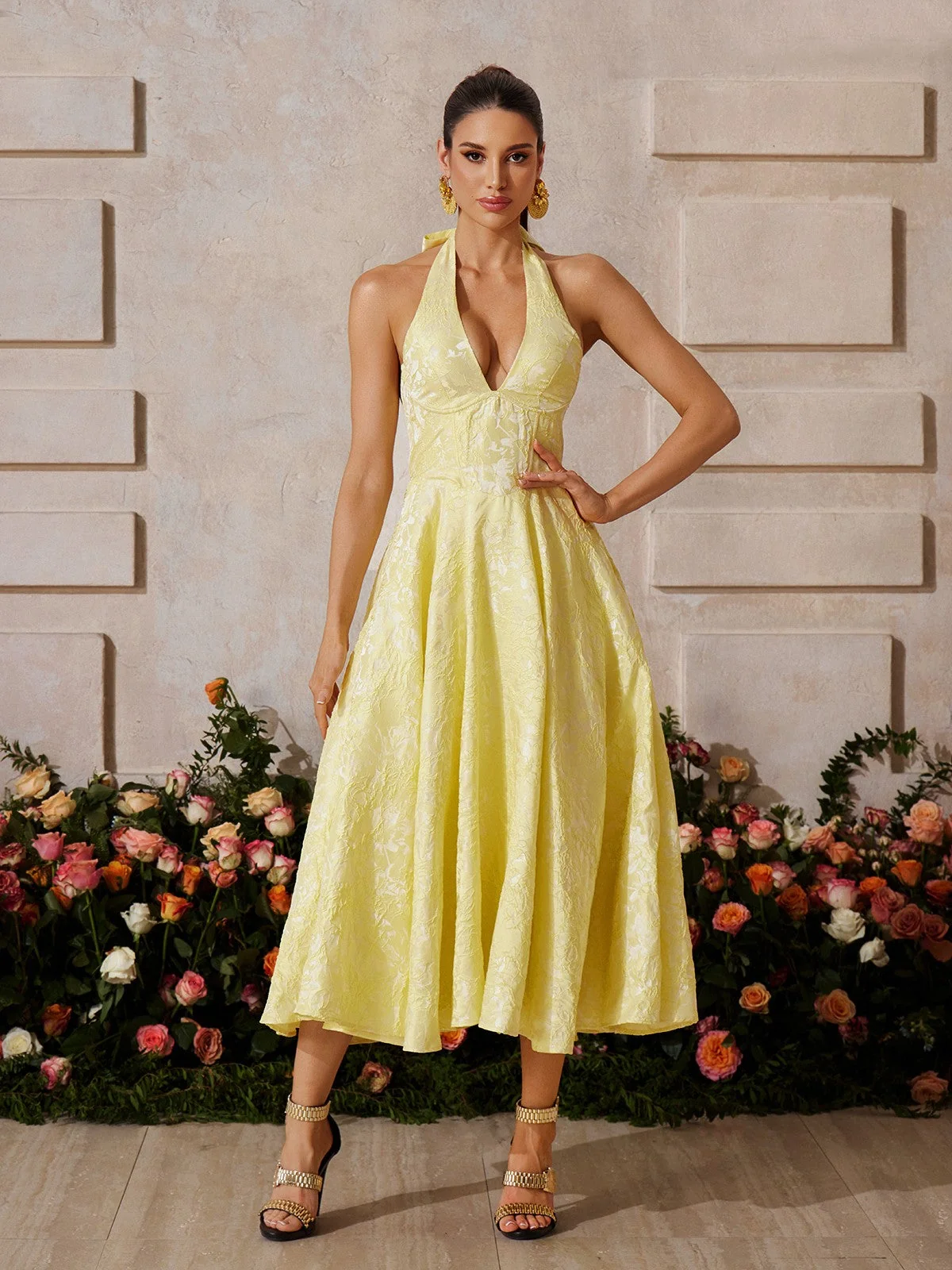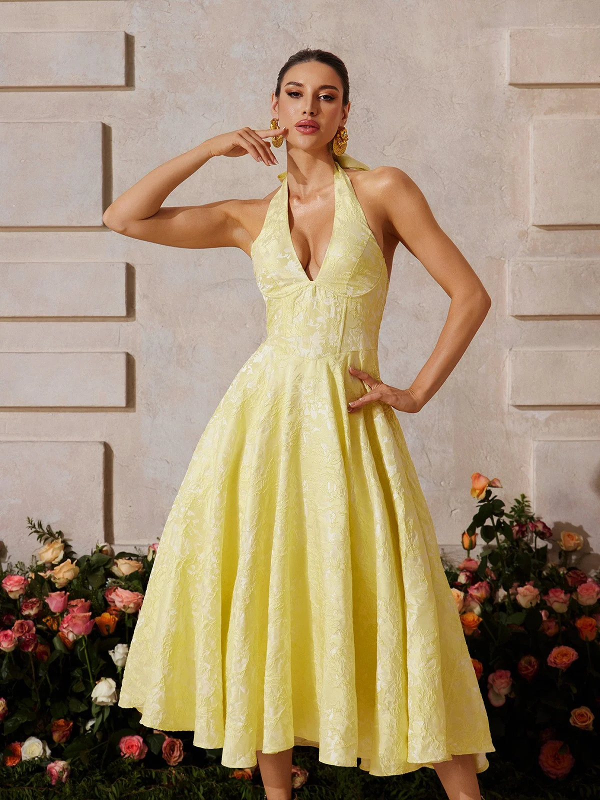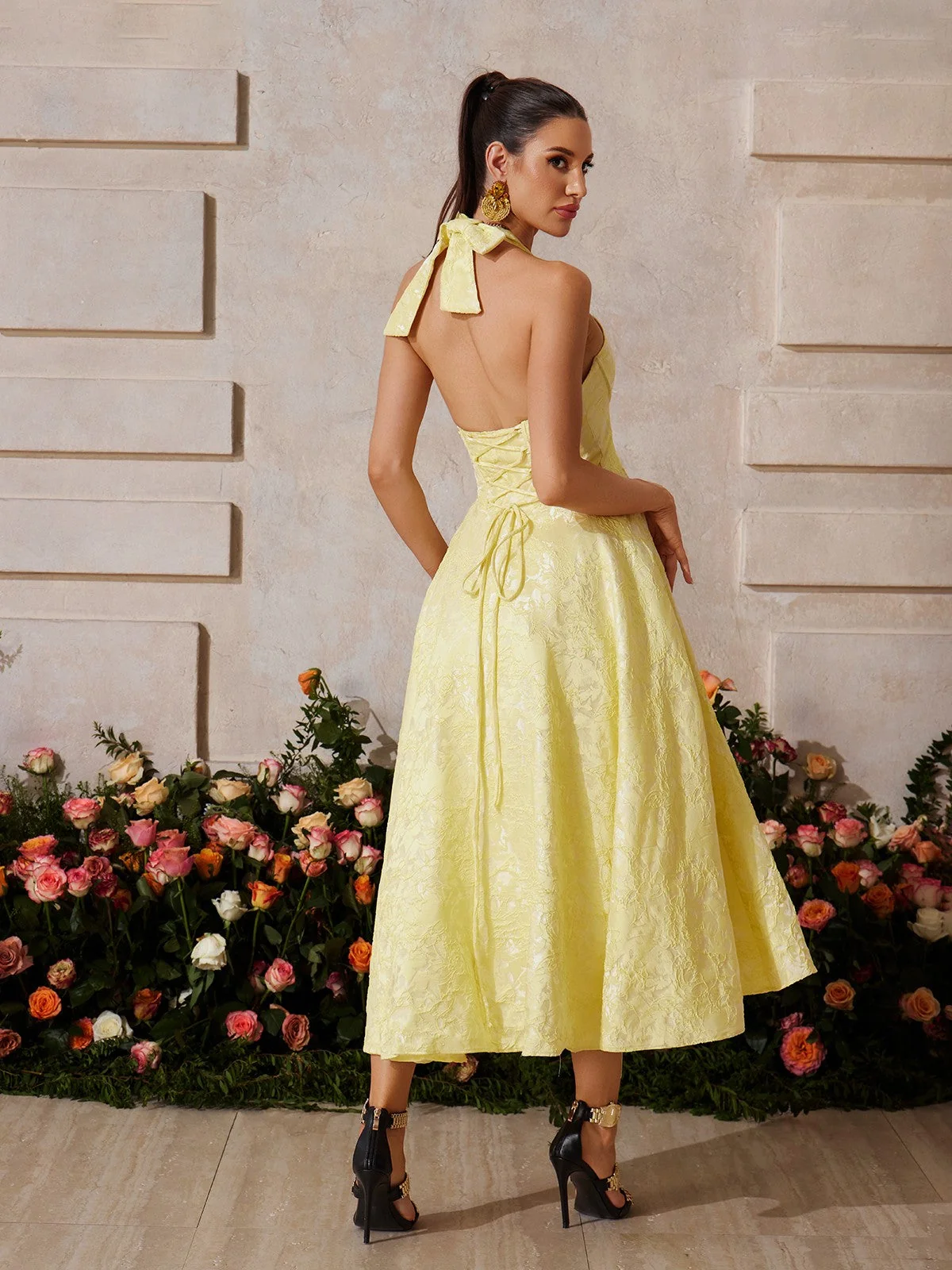 Indulge in elegance with our Yellow Floral Lace-Up Midi Dress. This exquisite dress features a flattering lace-up design and delicate floral motif, blending feminine allure with a contemporary silhouette. Perfect for various occasions, the midi length ensures versatility, allowing you to radiate confidence and sophistication effortlessly. Revel in your inherent beauty with this captivating piece crafted to enhance your style. Made of 100% Polyester with a slight stretch for comfort. For best care, dry clean only. Please note, color may appear differently due to lighting. Model is showcased wearing size S for reference.