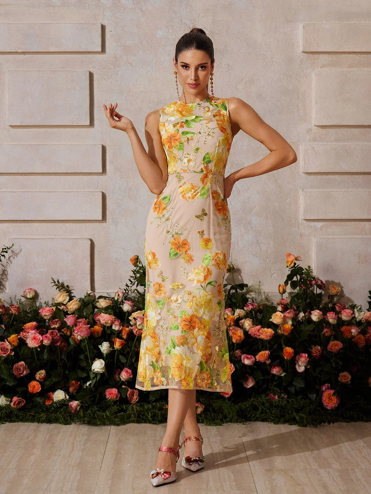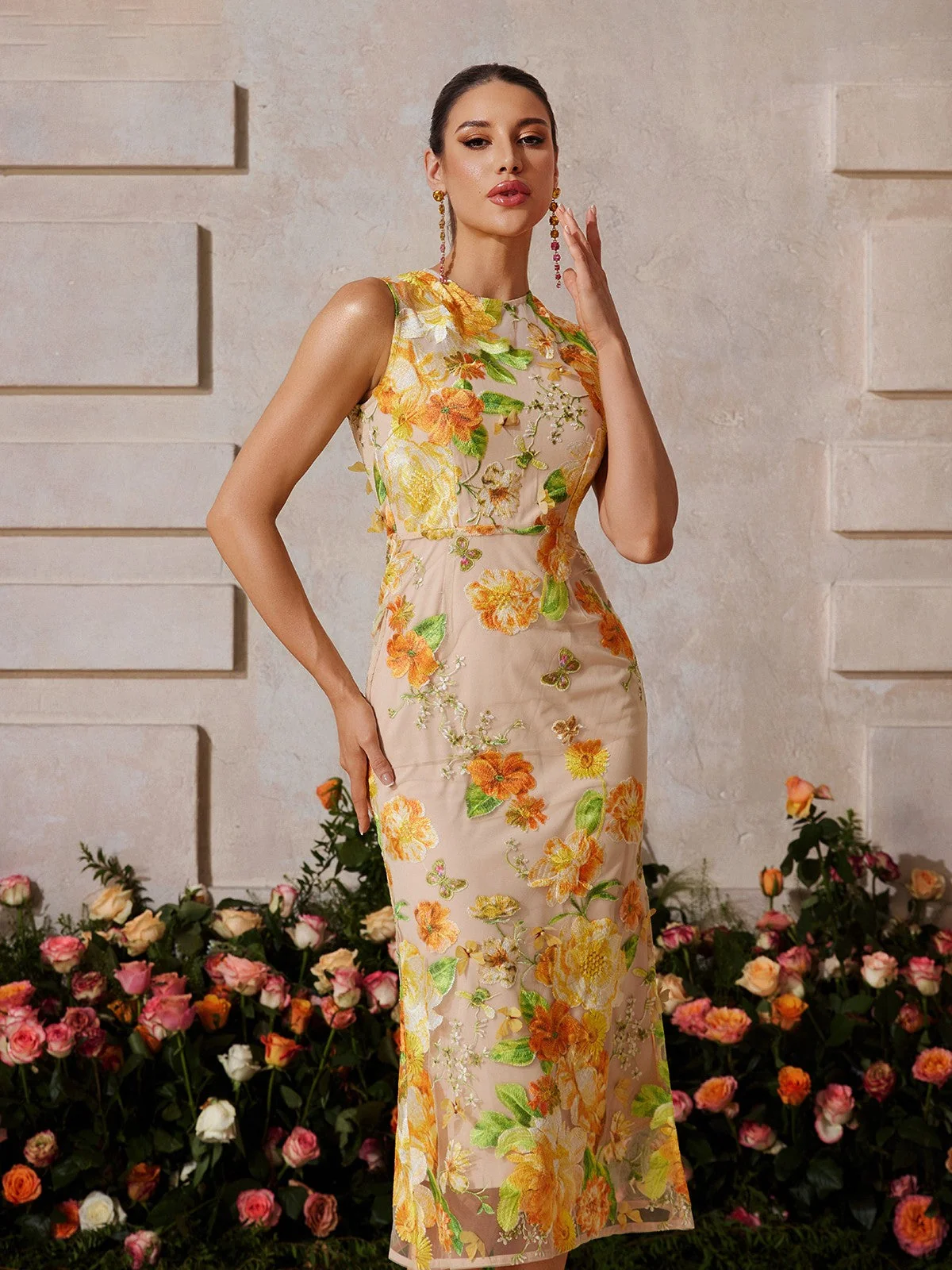 Elevate your style with the Yellow French Style Embroidered Tea Dress. This dress features intricate floral embroidery and a flattering sleeveless design, providing elegance and comfort in equal measure. With a midi length adding sophistication, it is perfect for both day and evening events. Exude effortless charm and make a statement with this beautifully crafted dress. Made from 100% Polyester with a slight stretch, this garment offers an invisible zipper opening at the back and requires dry cleaning for maintenance. Please note that the color may appear different due to lighting in images. Model displayed wears size S.