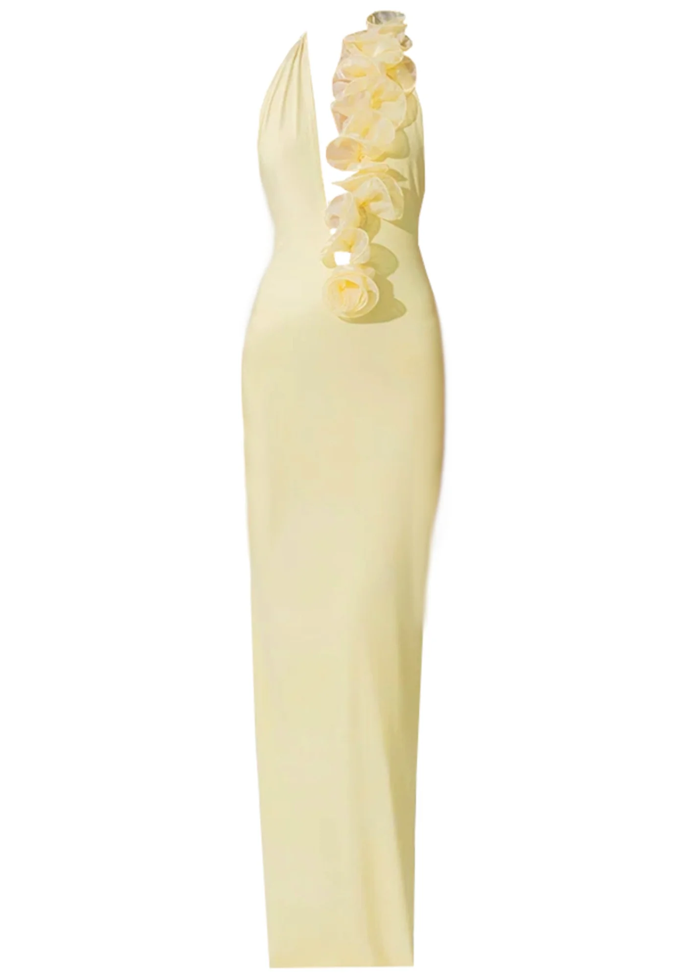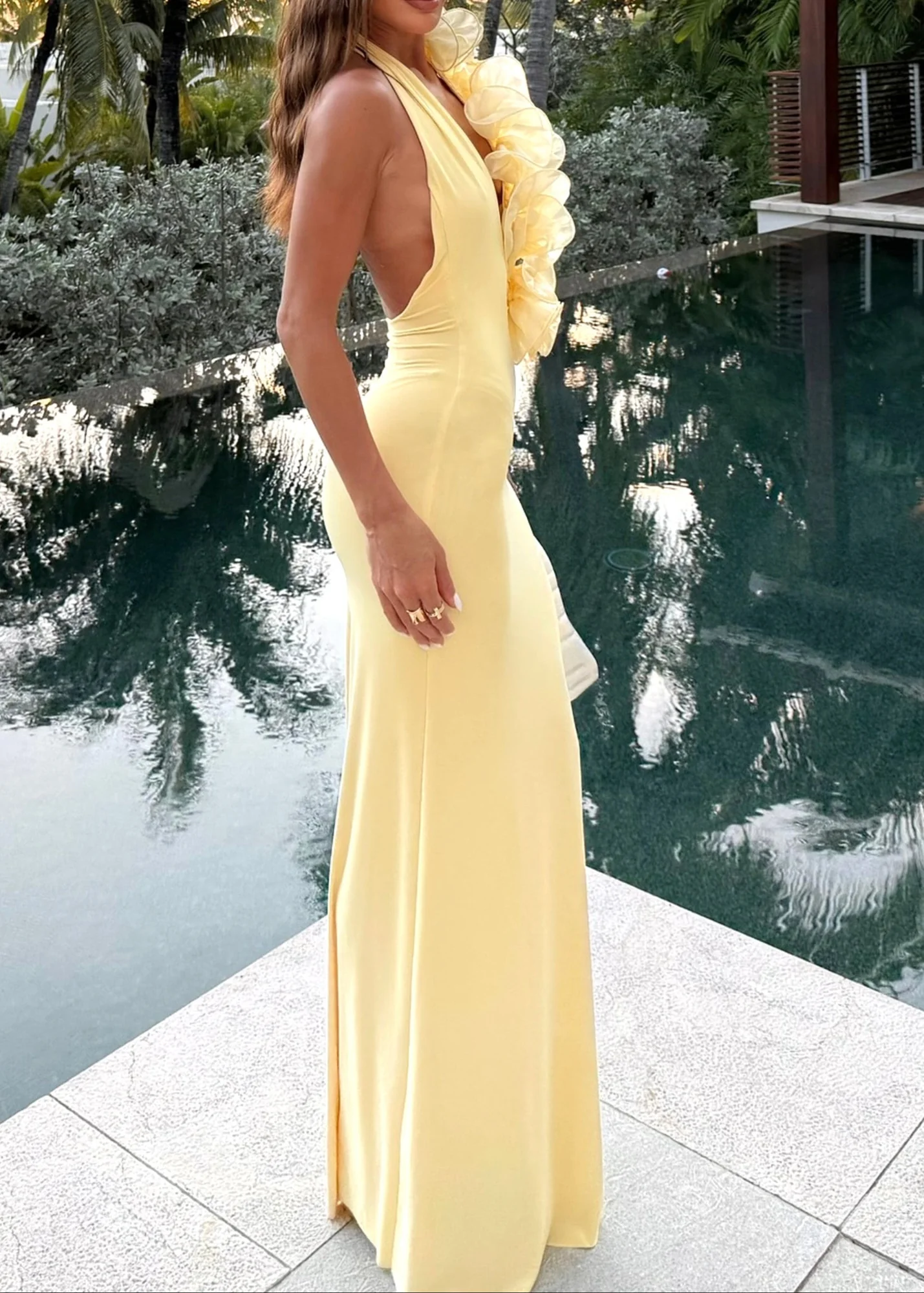 Discover the beauty of our Yellow Halter Floral Maxi Dress. Embrace the sunny days with the vibrant yellow color, halterneck design, and ruffle details. Experience comfort and style with the open back and high-quality polyester + cotton fabric. This dress features a concealed YKK zipper for durability and a graceful, flowing silhouette. Carefully crafted for lasting appeal, our dress is perfect for any special occasion. Follow the care instructions to maintain its beauty. Light up your wardrobe with this stunning piece.