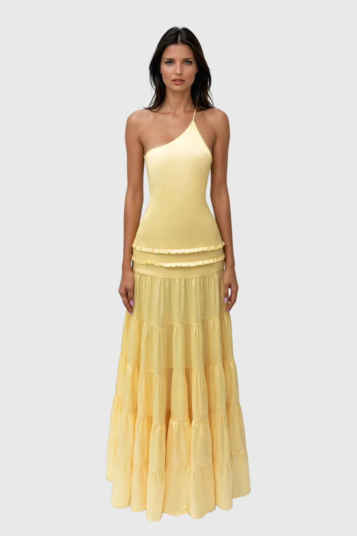 The Yellow One Shoulder Maxi Dress combines elegant design with a modern silhouette, featuring a single shoulder strap and a daring backless cut. This bold yet sophisticated dress is perfect for formal events and evening occasions, offering comfort and graceful movement for style and confidence. The non-stretch flowing fabric enhances the statement piece. Stretch Factor: Non-Stretch Clean: Gentle machine wash Color may vary due to lighting on images.