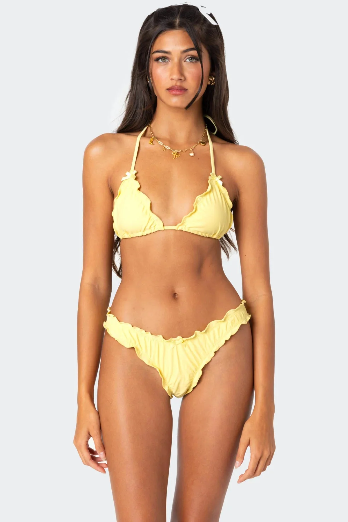 This yellow bikini top features a flattering triangle fit with adjustable halter and back ties for a perfect customized look. Designed with charming ruffle edge detailing and bow accents, it is made from double-lined stretch fabric for comfort and style. Care instructions: Hand wash cold, avoid soaking, and line dry in the shade for best results. Say goodbye to boring swimwear with this vibrant piece that enhances your beach or pool day outfit effortlessly.