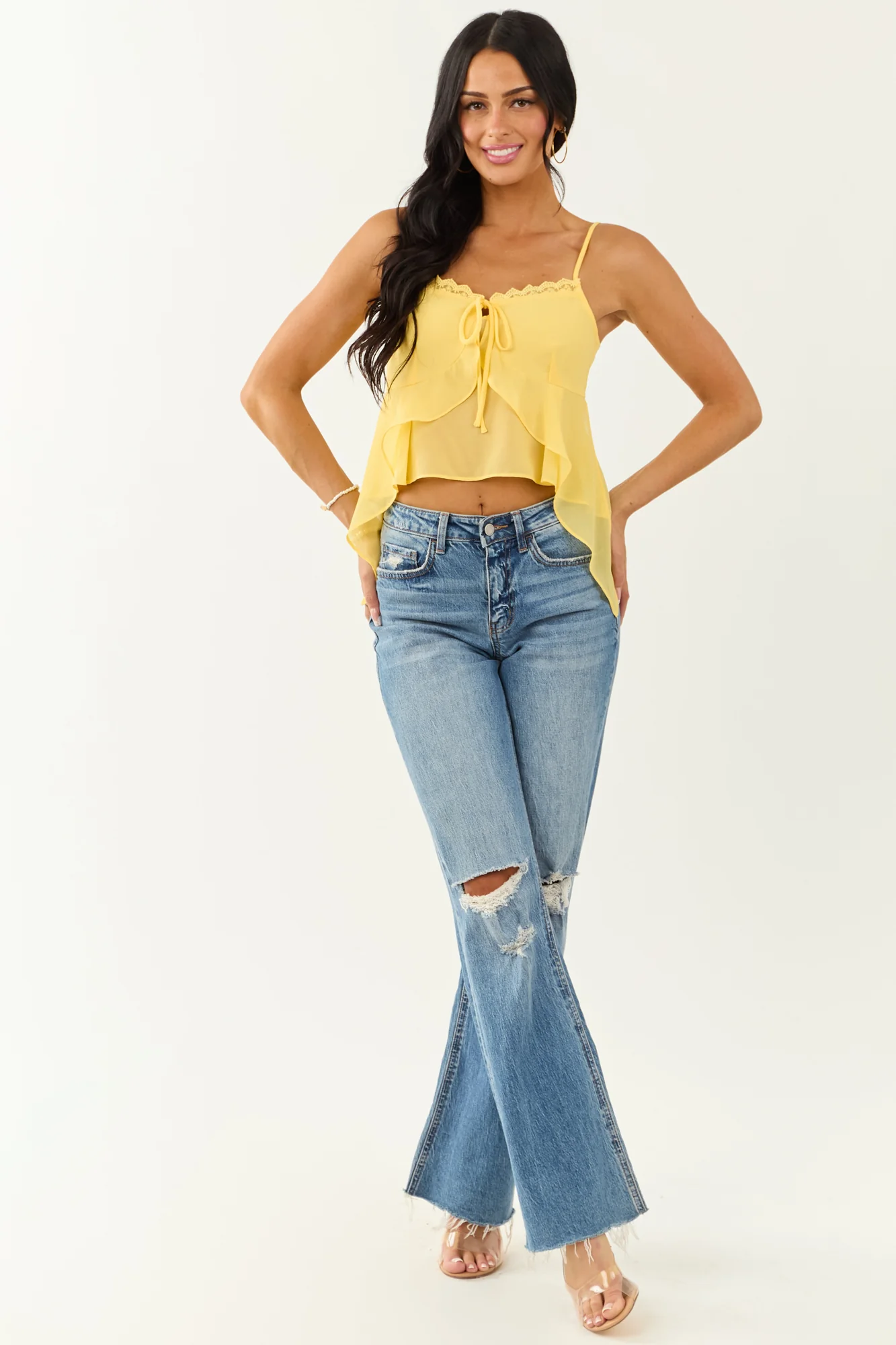 Stay cool and stylish in our Canary Yellow Ruffle Smocked Back Cami Tank Top. Designed with a flirtatious handkerchief hem, adjustable spaghetti straps, and a flattering front tie for a perfect fit. Enjoy the sunshine with its bright color and playful lace trim on the neckline. Made of 100% Polyester for comfort and durability. This semi-cropped top is perfect for summer days. Model is wearing a size Small. Available in sizes S, M, and L.