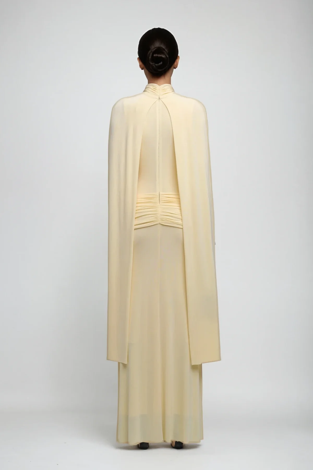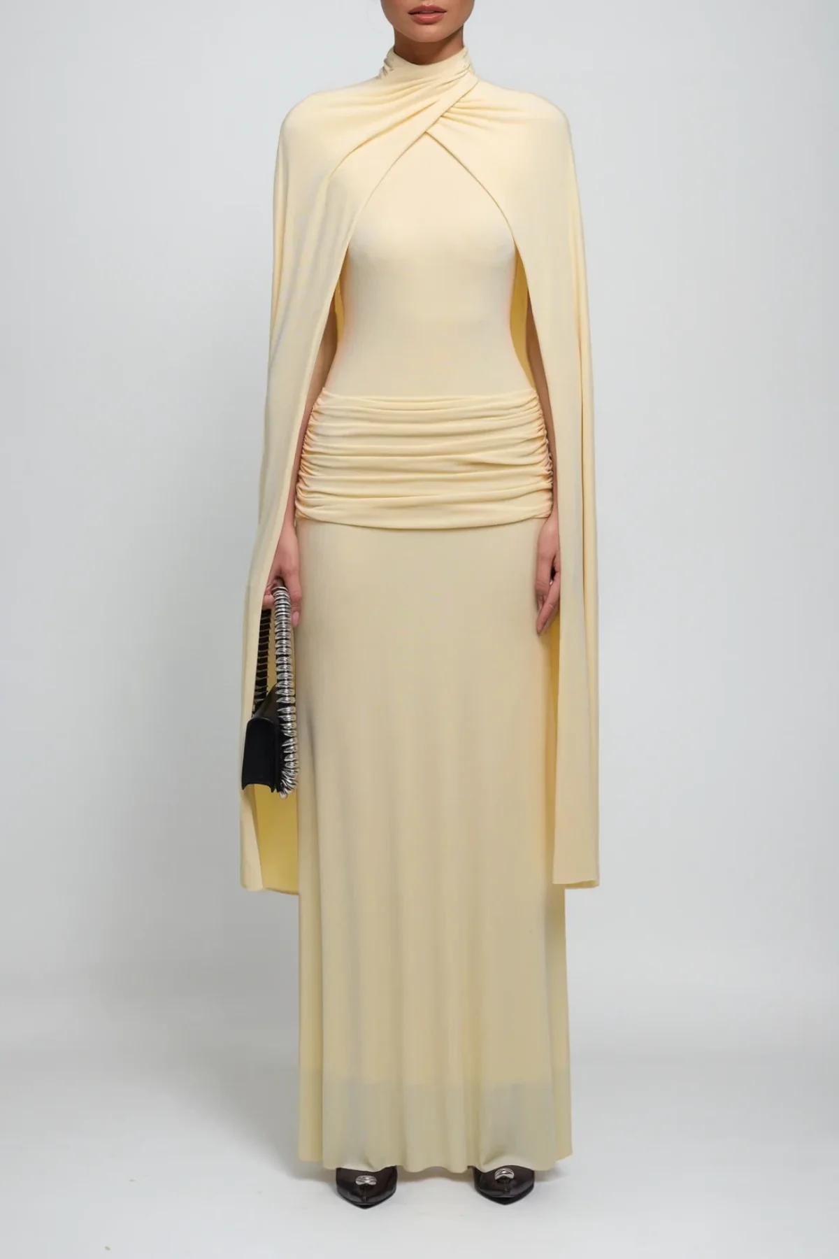 Elevate your style with the Yellow Shawl Maxi Dress featuring ruching that accentuates your curves. The shawl neckline adds sophistication, while the vibrant yellow hue exudes confidence. Ideal for any occasion, this maxi dress ensures a comfortable and chic look from day to night. Experience a slight stretch for a perfect fit. Care Instructions: Gentle machine wash. Please note, actual color may vary due to lighting in images.