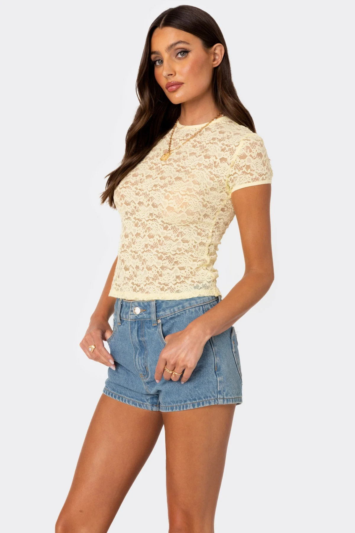 Discover the sophisticated charm of our yellow sheer lace T-shirt. Perfect for any occasion, this T-shirt is made from a blend of polyester and spandex, offering a comfortable and flattering fit. The sheer lace fabric adds a touch of elegance, making it a must-have addition to your wardrobe. Whether paired with jeans for a casual look or dressed up with a skirt, this T-shirt is versatile and fashionable. Available in sizes XS, S, M, L, and XL.