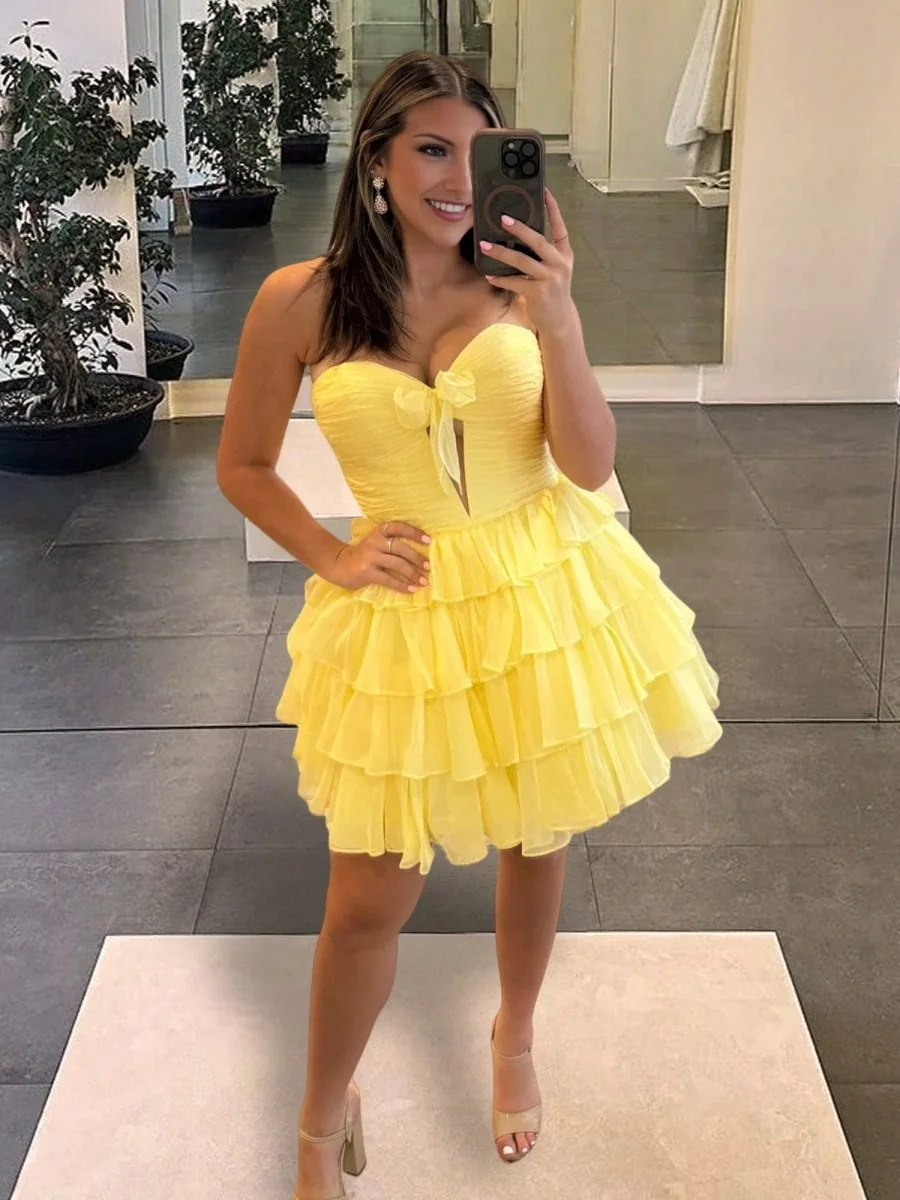 Elevate your style with this stunning yellow strapless A-line cocktail dress made of flowing chiffon. Stand out at homecoming or cocktail parties with the playful ruffles, sweet bow-knot embellishment, and graceful silhouette. The sleeveless design and zipper back ensure a comfortable fit while exuding youthful elegance. Perfect for those special occasions where you want to shimmer with charm and poise.