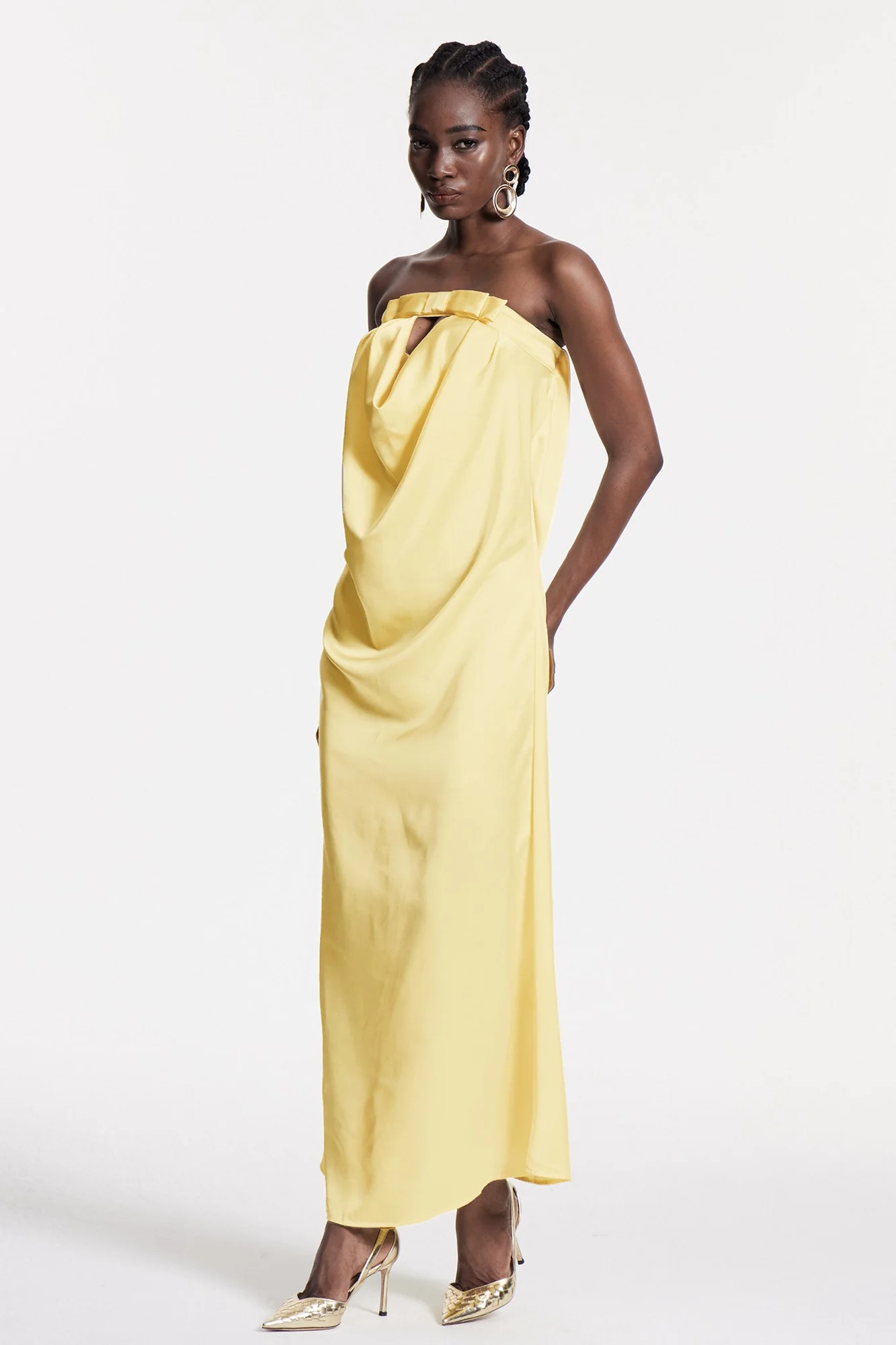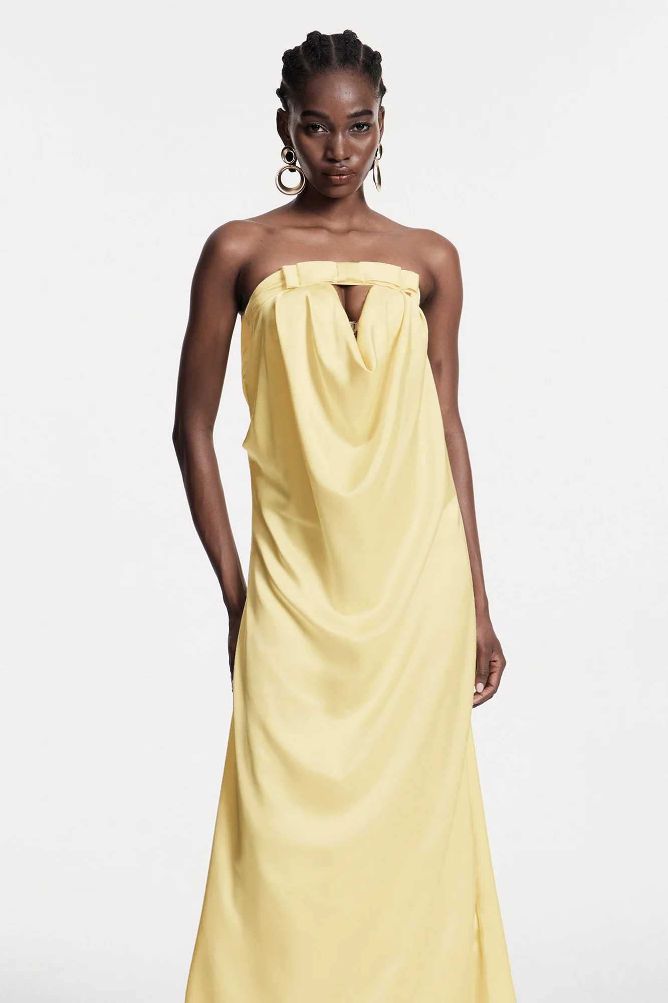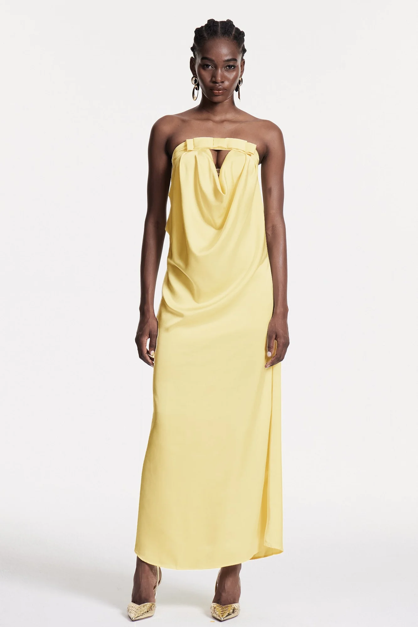 Experience elegance with the Yellow Strapless Bow Maxi Dress. This stunning dress boasts a flattering silhouette, strapless neckline, and a prominent bow detail, perfect for formal or evening events. Crafted for comfort and graceful movement, this dress is a sophisticated and timeless wardrobe staple. Its slight stretch ensures a perfect fit while being easy to care for with a gentle machine wash. Discover the perfect blend of style and comfort with this romantic coquette piece. Color may vary due to lighting in images.