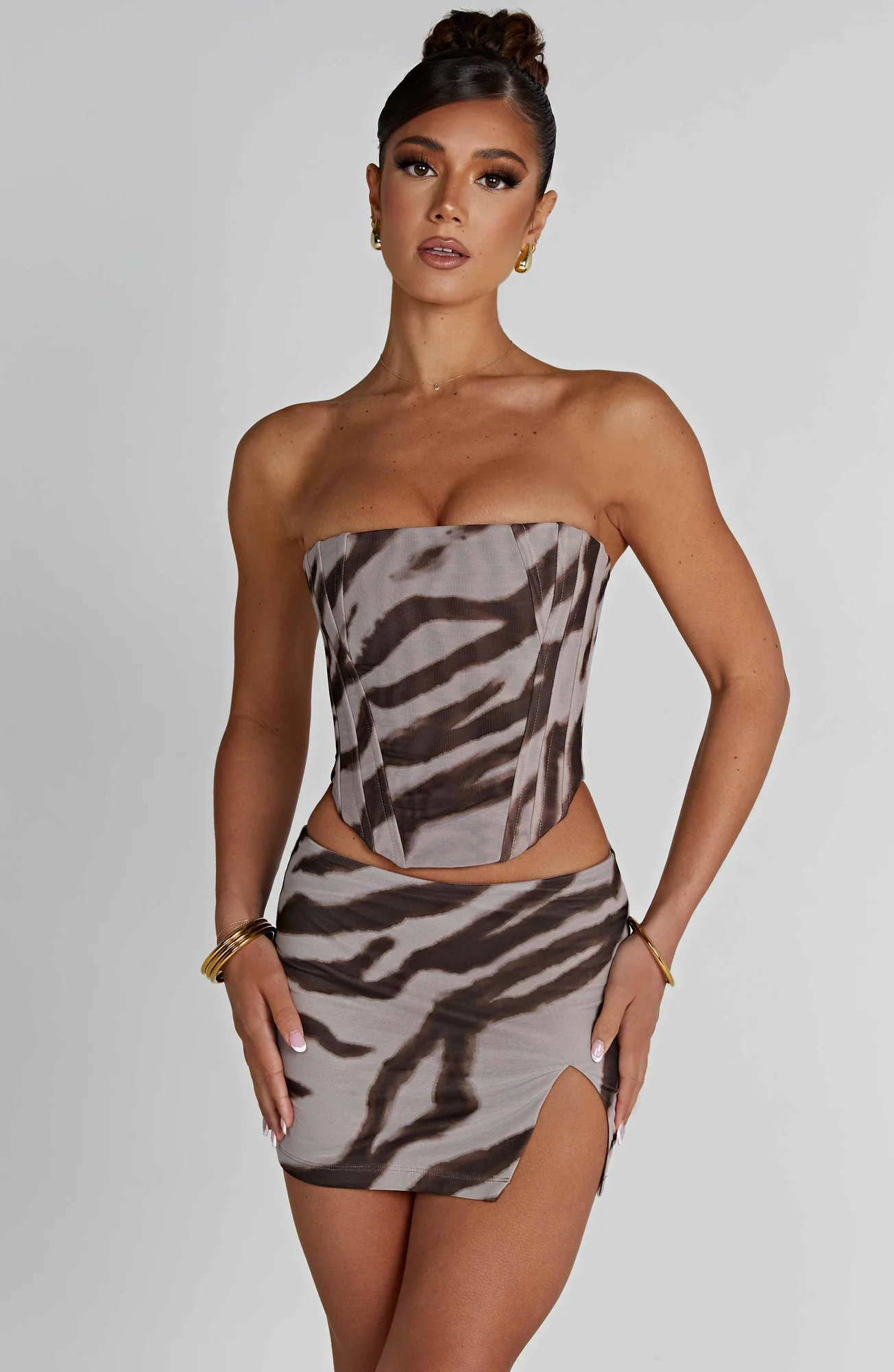 Elevate your wardrobe with our Zebra Print Corset Tank Top crafted from premium power mesh. This fun and flirty cami style features a structured design to cinch the waist, a strapless straight neckline, and a slightly dipped hem for a chic look. The power-hold fabric provides a figure-flattering silhouette. Complete your outfit by pairing it with the matching mini skirt and your favorite heels for a stunning ensemble. This corset-style top is cropped in length and has a zipper closure at the back. Available in sizes XS to XXL. Model is wearing size XS.