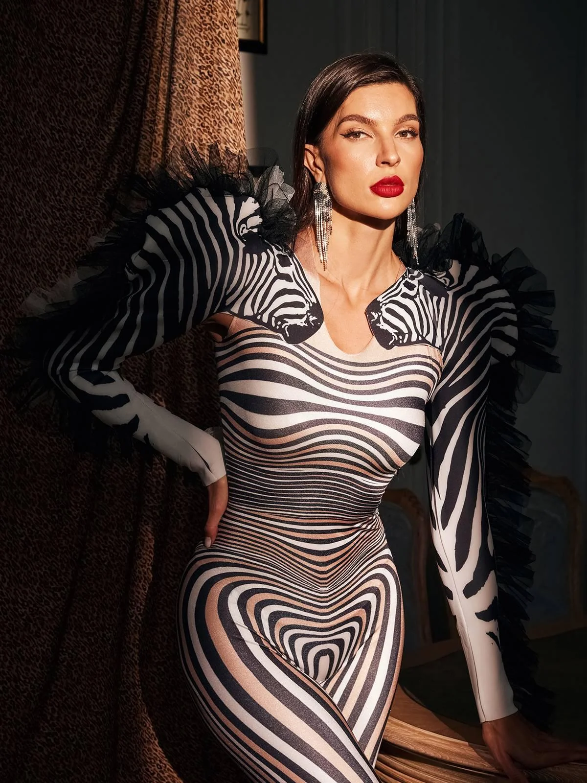 Elevate your style with our Zebra Printed Tulle Trim Jumpsuit. Crafted from high-quality 100% polyester, this jumpsuit features a striking zebra print design with delicate tulle trim details. The invisible zipper opening at the back and slight stretch factor ensure a comfortable fit. Whether youre heading to a party or a special event, this jumpsuit is perfect for making a bold and sophisticated fashion statement. Add this unique piece to your wardrobe today and stand out from the crowd. Note: Color may vary due to lighting. Model is wearing O/S size.
