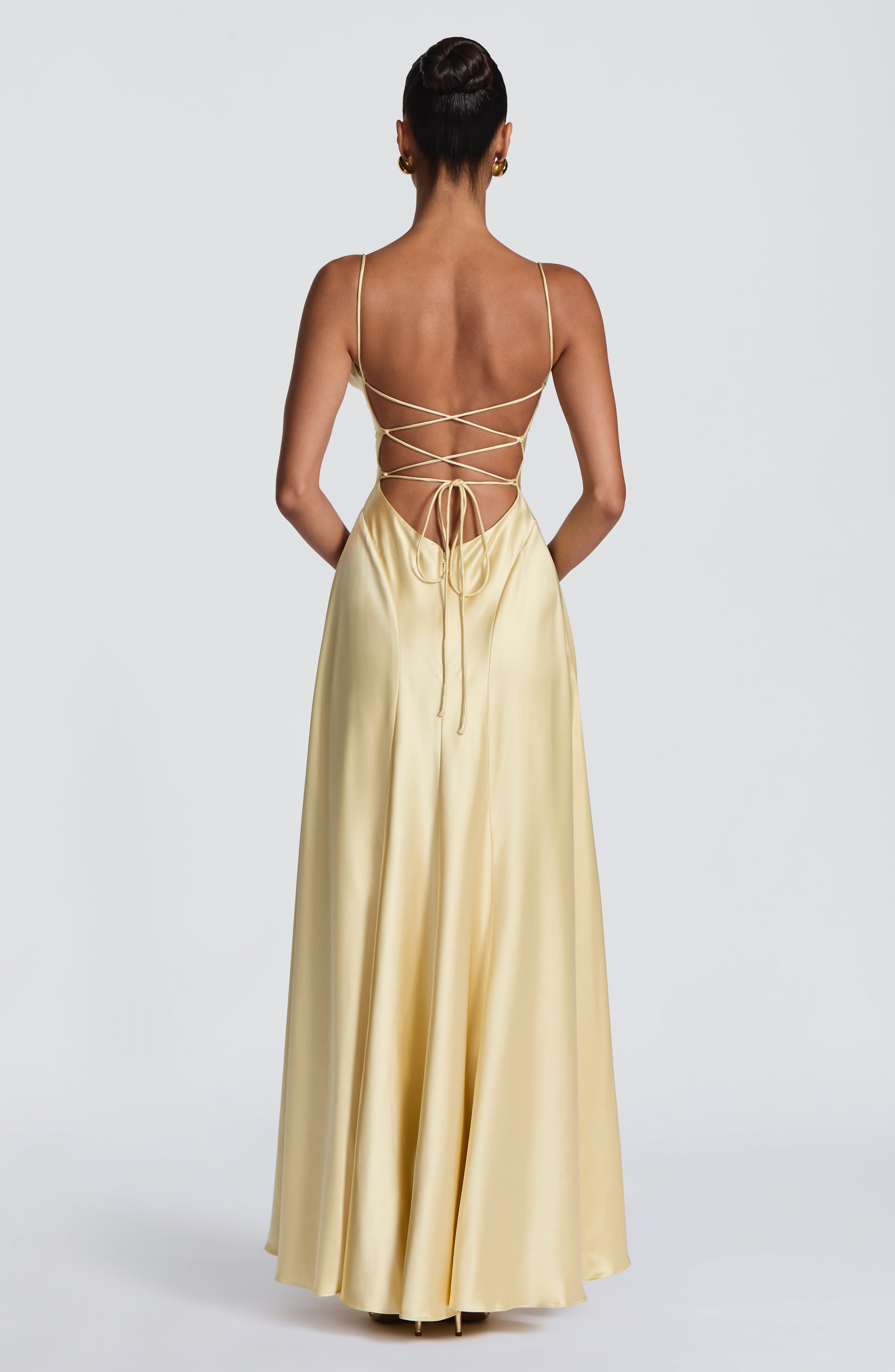 maxi-dress lemon satin twist-neckline cowl-neck spaghetti-straps lace-up-back flared-skirt godet-panels fully-lined non-stretch invisible-zipper evening-wear bridesmaid prom wedding-guest party-dress formal-dress sophisticated elegant