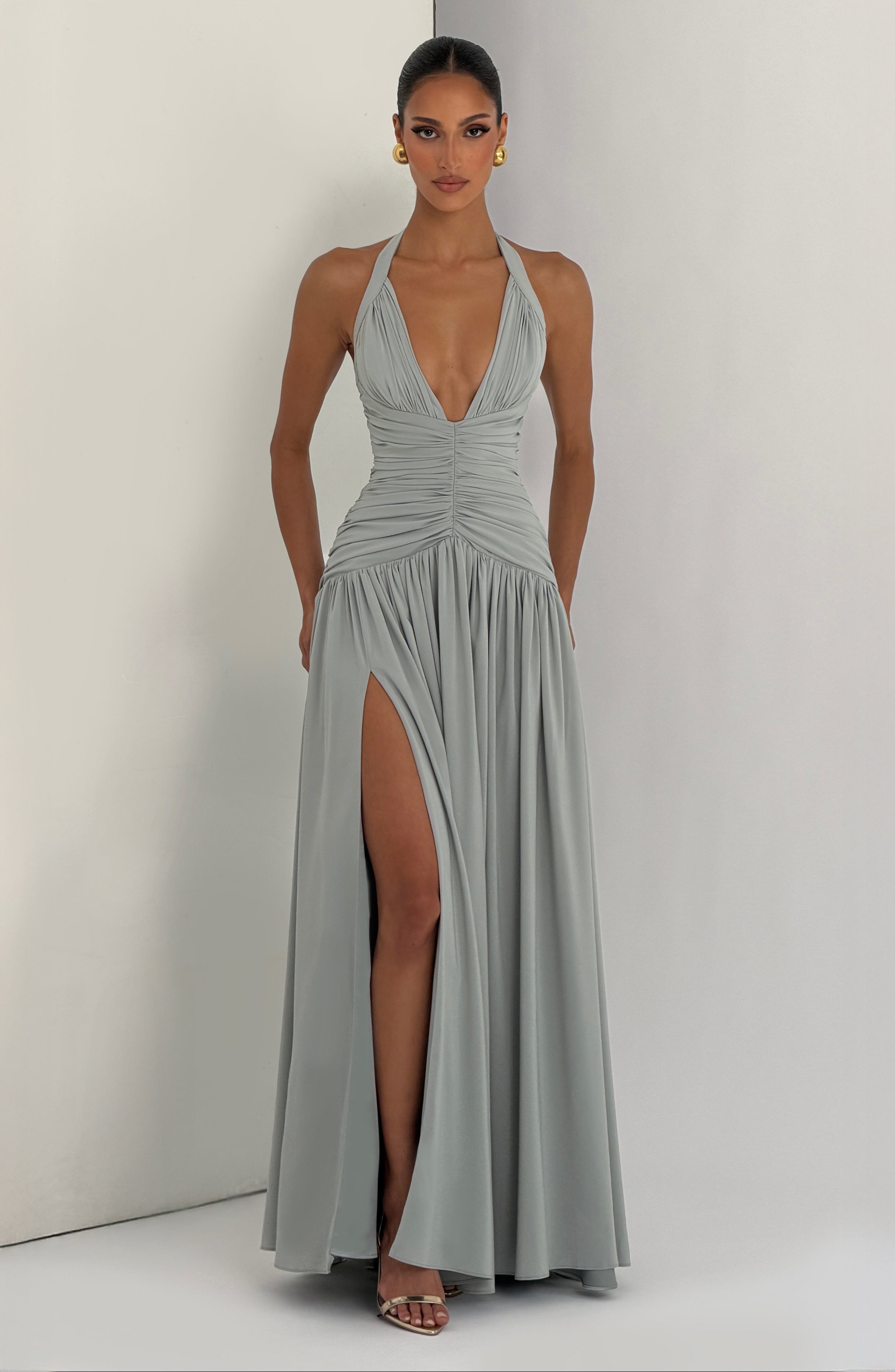 maxi-dress sage chiffon plunge-neck halter-neck thigh-split ruched-bodice lace-up-back smocked-panel fully-lined satin-lining gathered-skirt invisible-zipper bridesmaid evening formal cocktail party wedding-guest