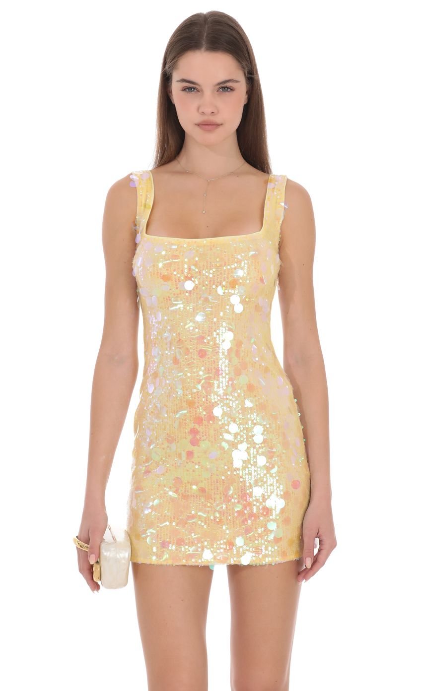 A luminous silhouette designed to catch light with intention. The Amelie features a clean square neckline and a fitted mini silhouette, finished with an all-over iridescent sequin pattern that shifts subtly with movement. Playful in texture, refined in form.
