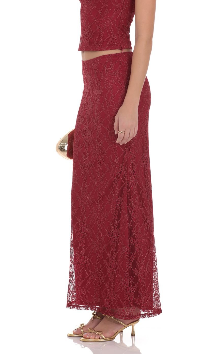 The Arcella Lace Maxi Skirt is a refined, body-skimming silhouette designed to complement its matching top with clean lines and romantic texture. Crafted in intricate lace, this low-rise maxi sits softly at the hips and elongates the frame through a full-length, streamlined shape. The straight fall to the hem creates an elegant balance of structure and fluidity, making it an effortless option for elevated occasions.
