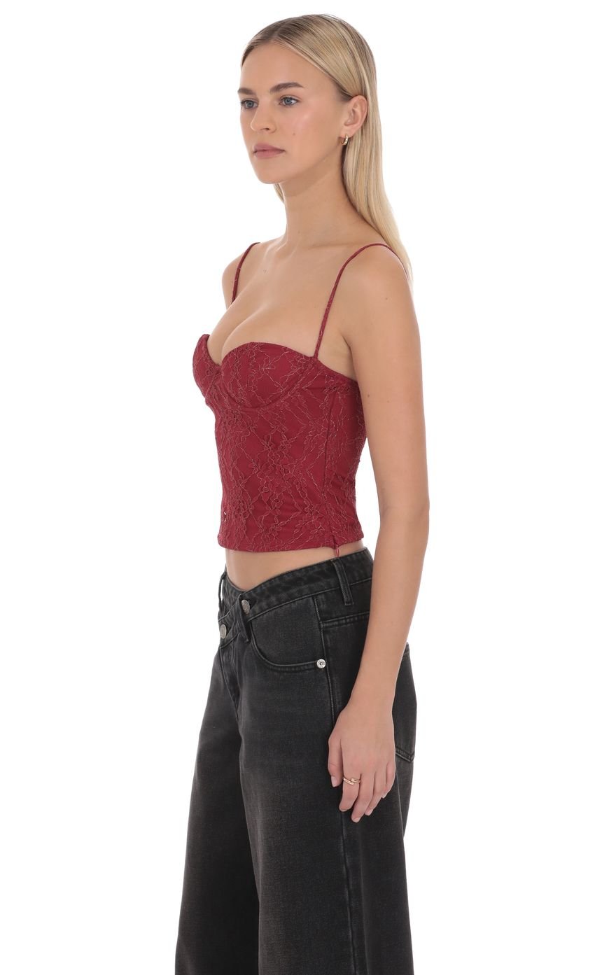 The Arcella Lace Top is a sculpted lace silhouette designed to highlight and support the bust with a refined, feminine edge. The fitted bodice features delicate lace throughout with a softly contoured shape, while slender straps keep the look light and balanced. Designed to sit just at the waist, this piece pairs effortlessly with low-rise denim or tailored separates for an elevated day-to-night finish.